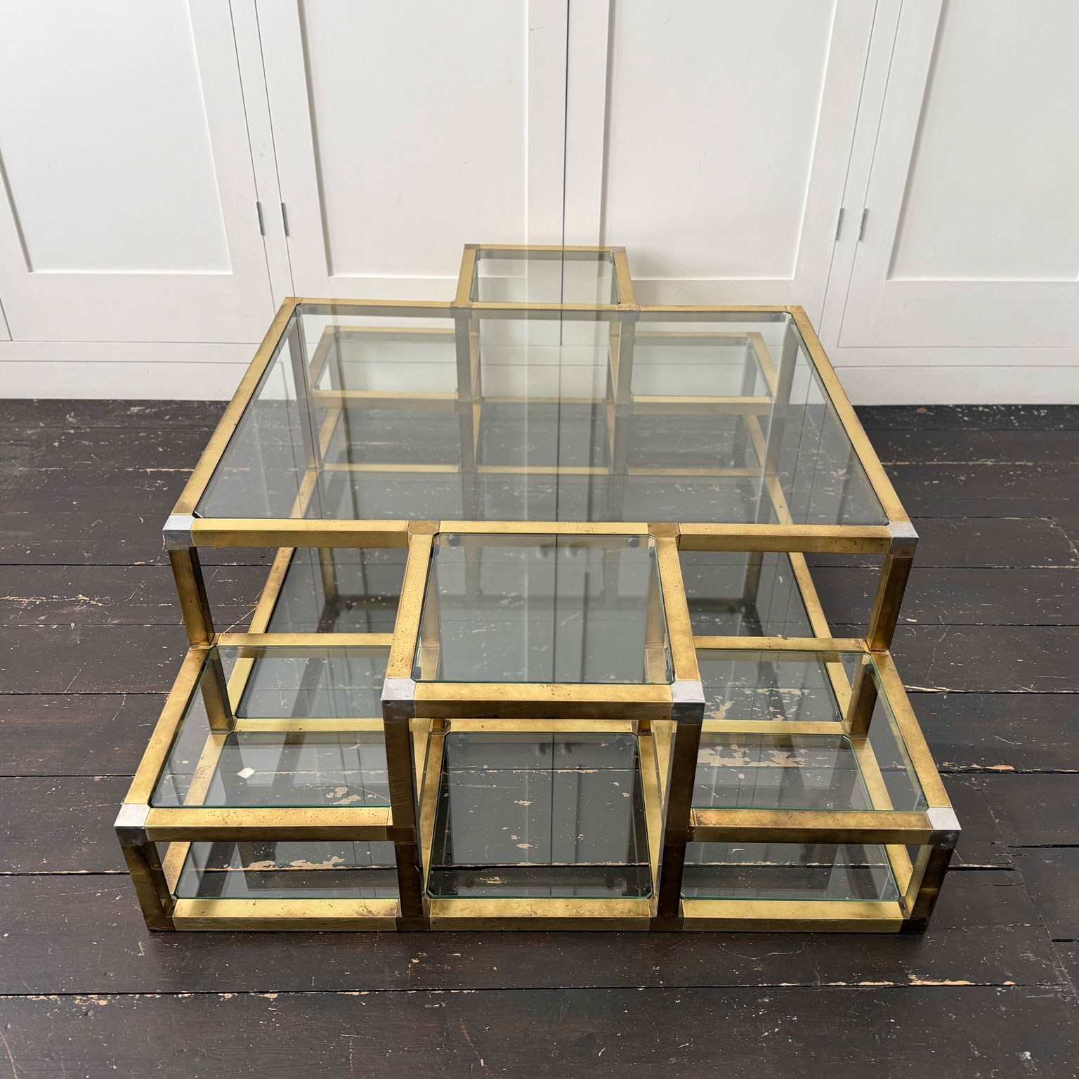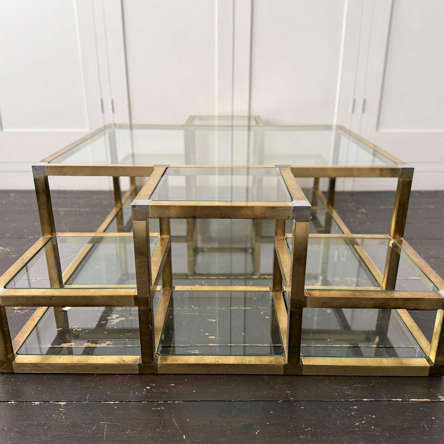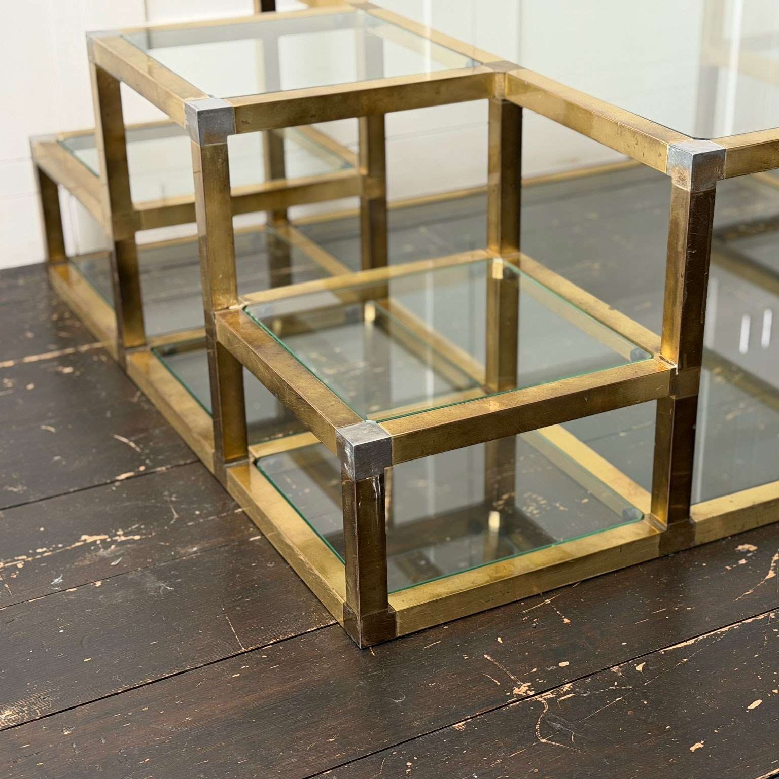 A substantial brass-plated coffee table with small nickel accents. With two tiers and 14 glass shelves set at various levels. The central, larger glass section with a matching lower shelf.