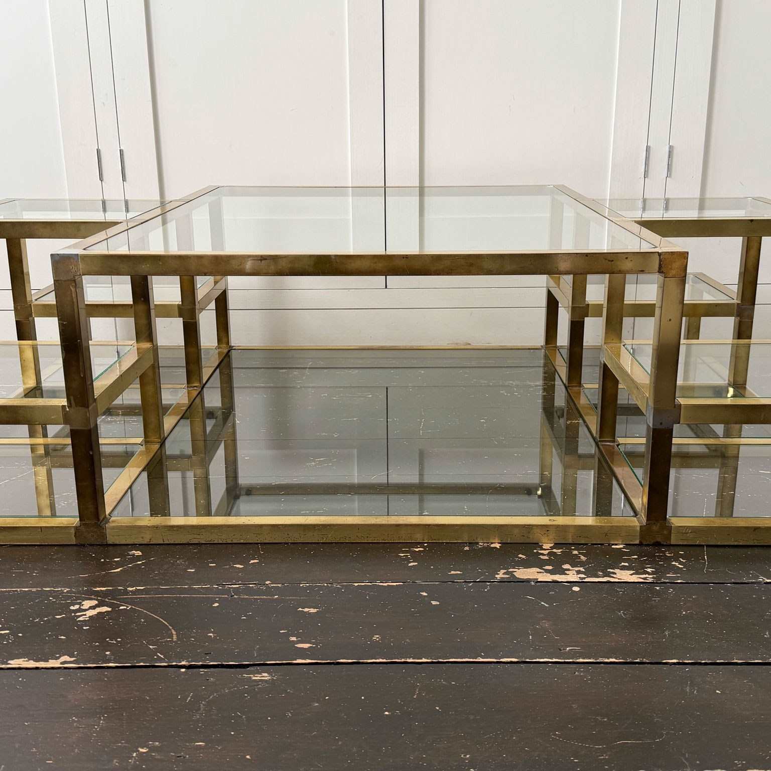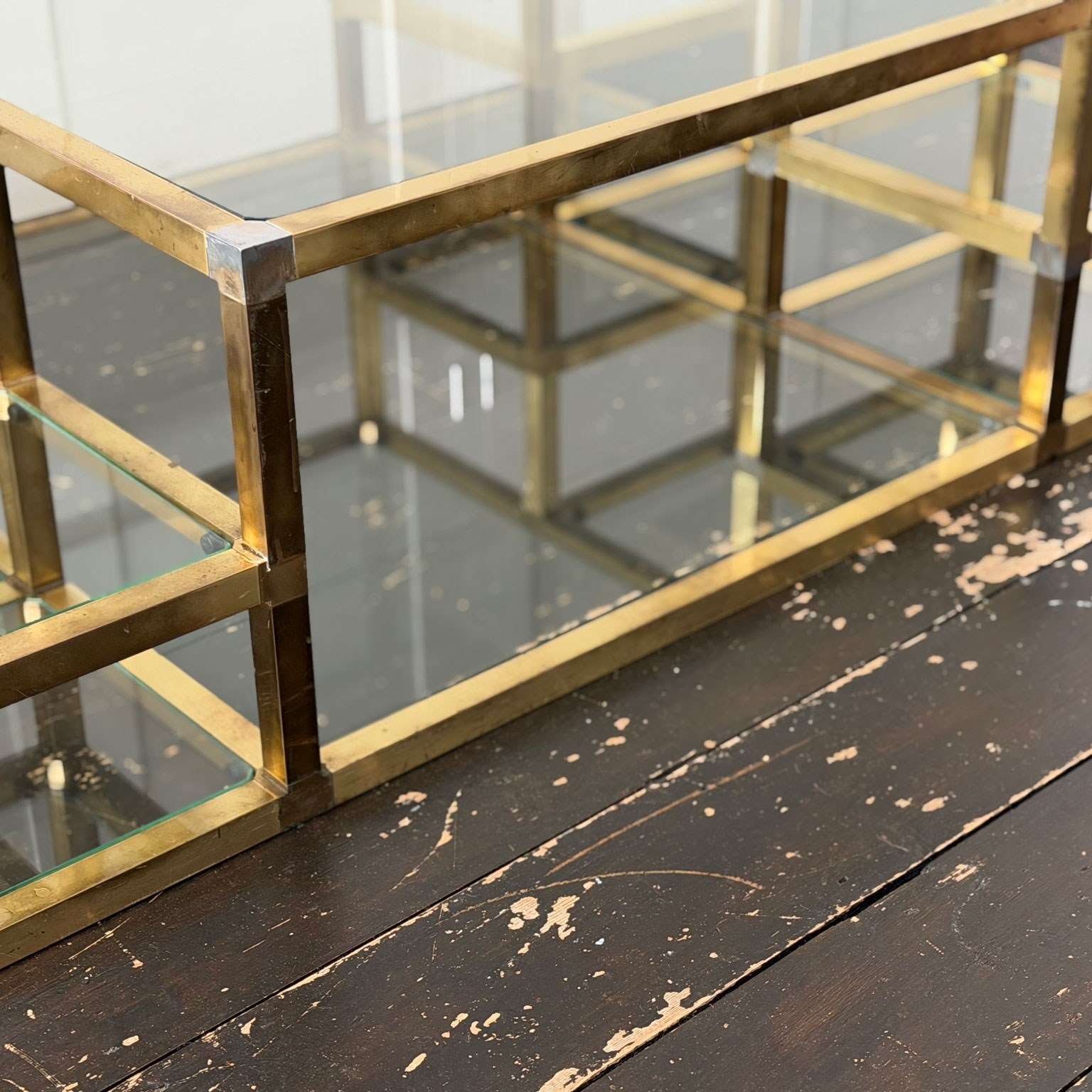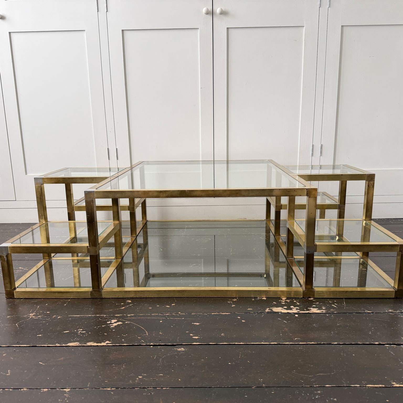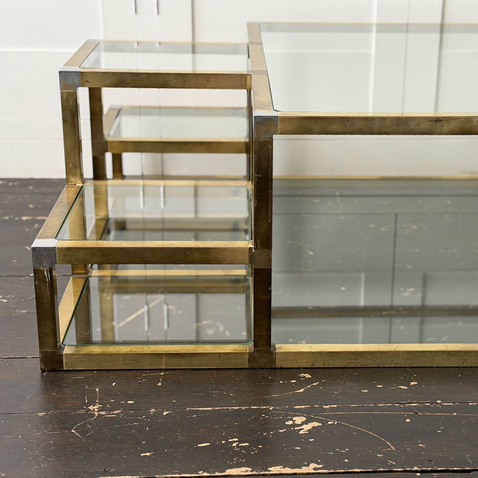A substantial brass-plated coffee table with small nickel accents. With two tiers and 14 glass shelves set at various levels. The central, larger glass section with a matching lower shelf.