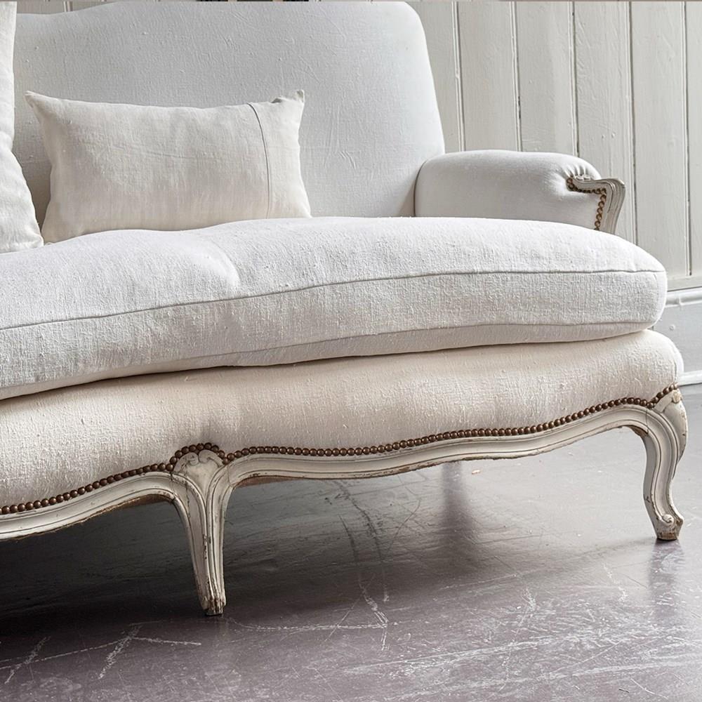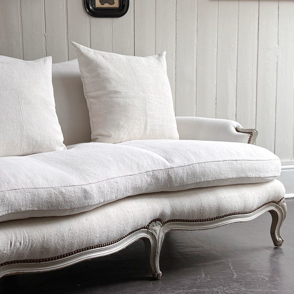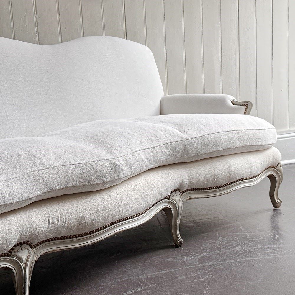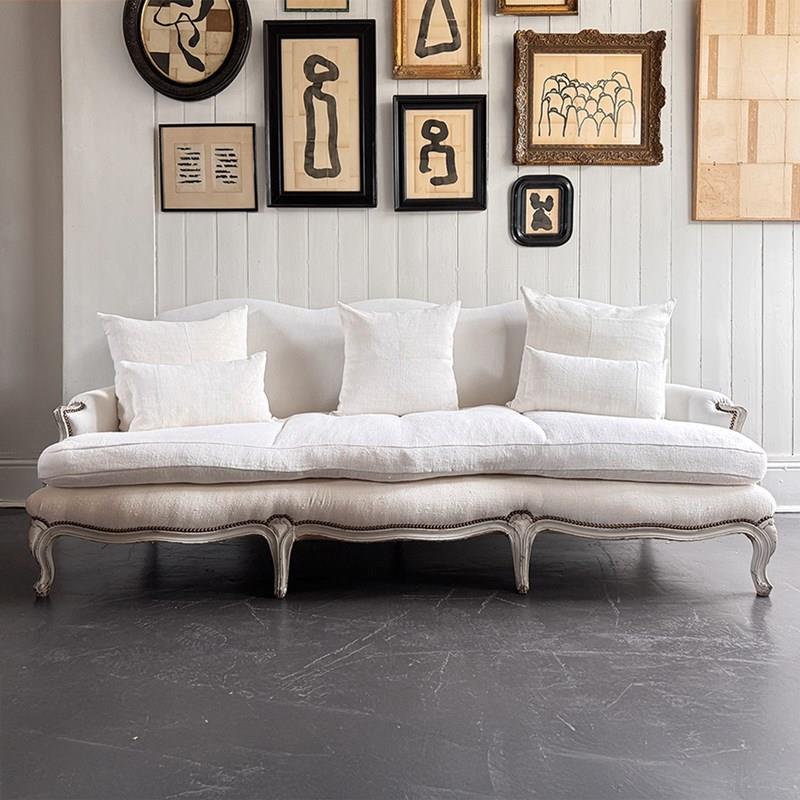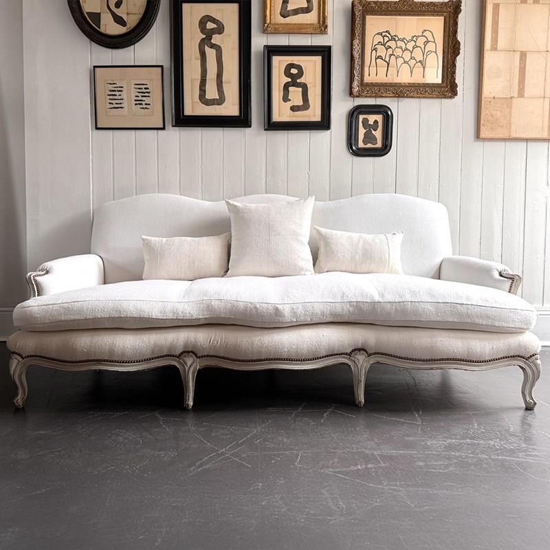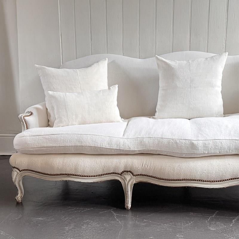 A large and comfortable antique French sofa with camel back shaping and serpentine front standing upon shaped, painted feet. Newly upholstered with off-white antique French linen. Sold with a selection of matching scatter cushions.