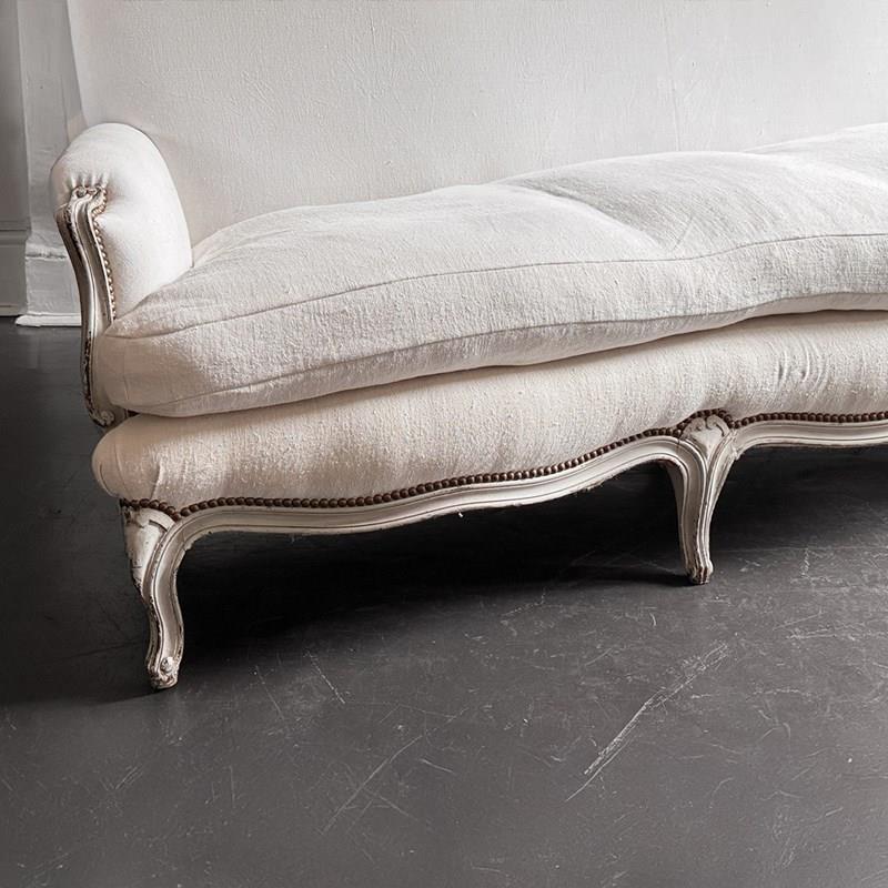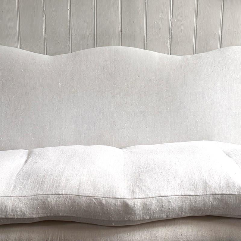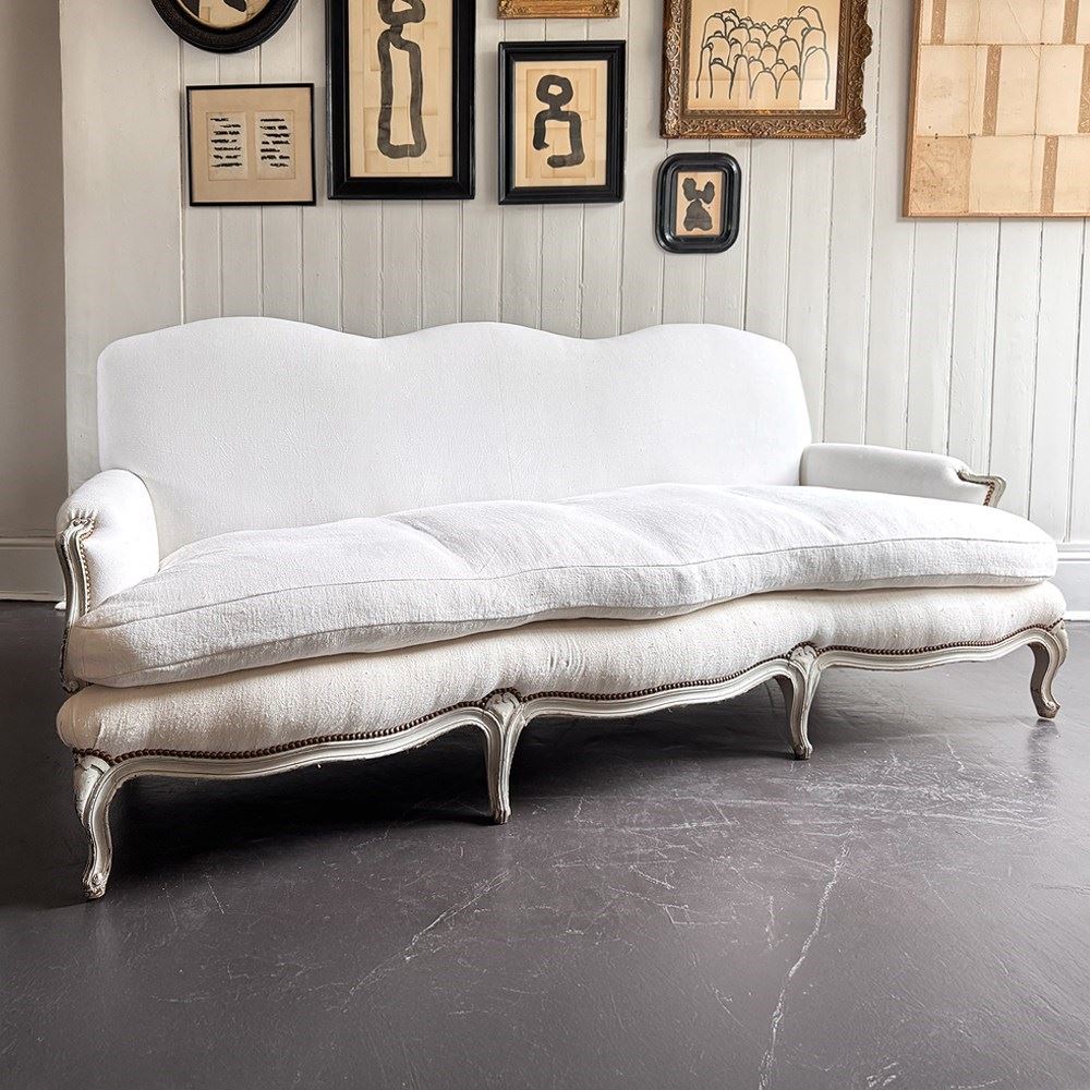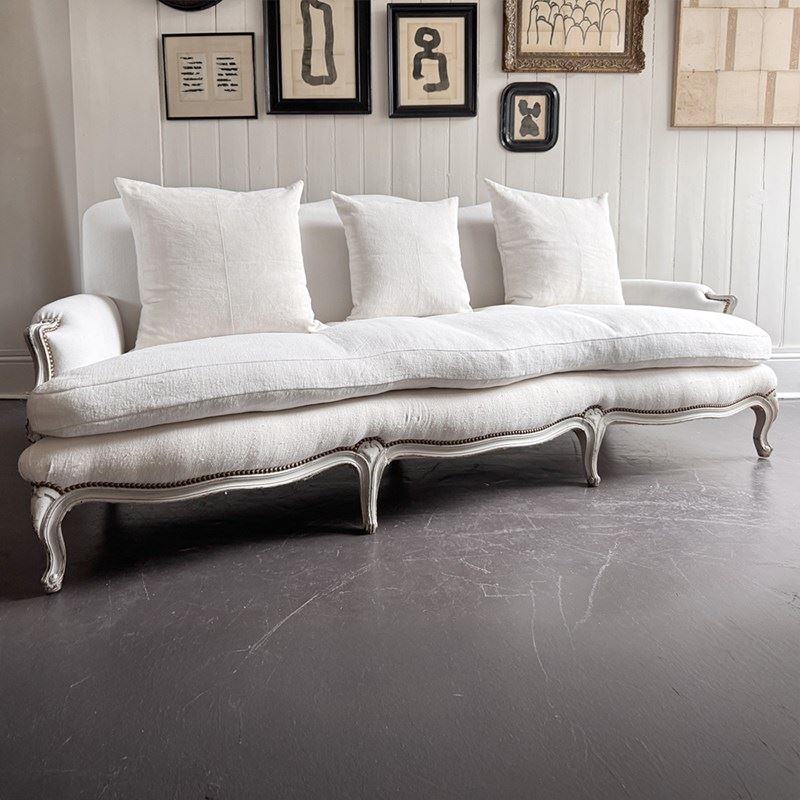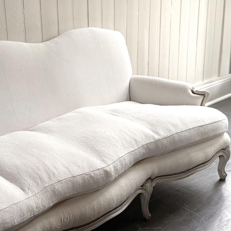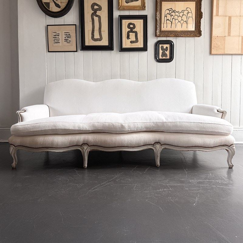 A large and comfortable antique French sofa with camel back shaping and serpentine front standing upon shaped, painted feet. Newly upholstered with off-white antique French linen. Sold with a selection of matching scatter cushions.