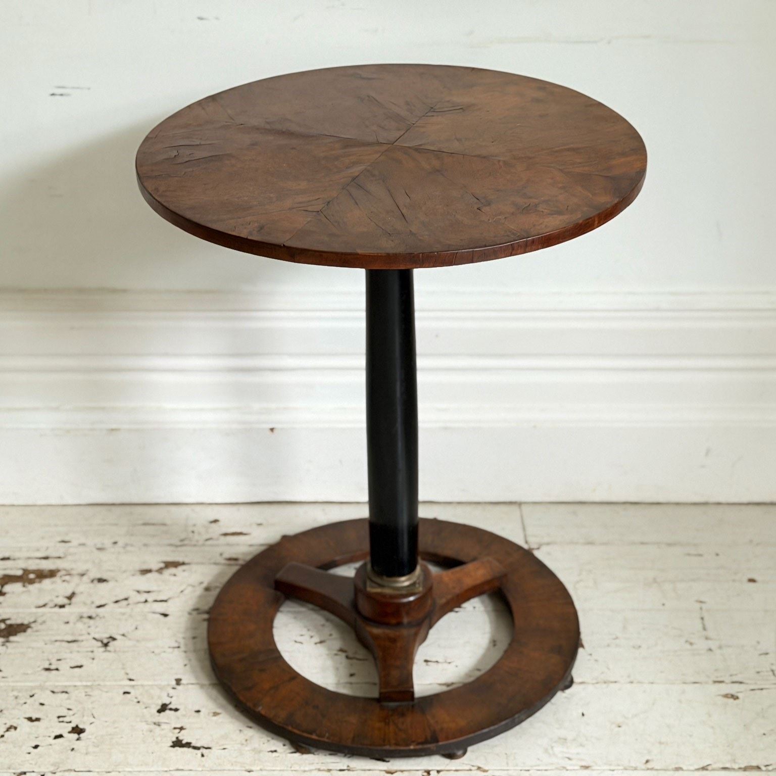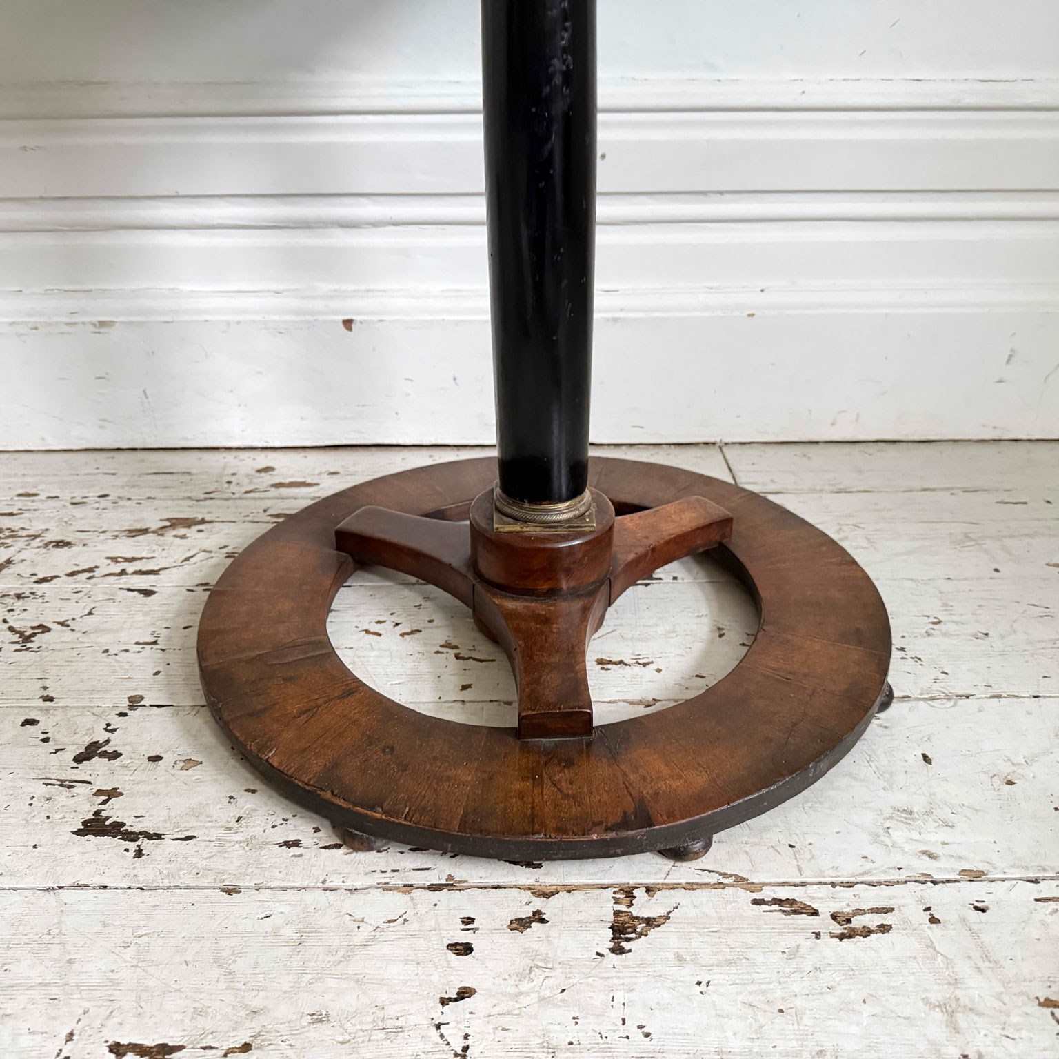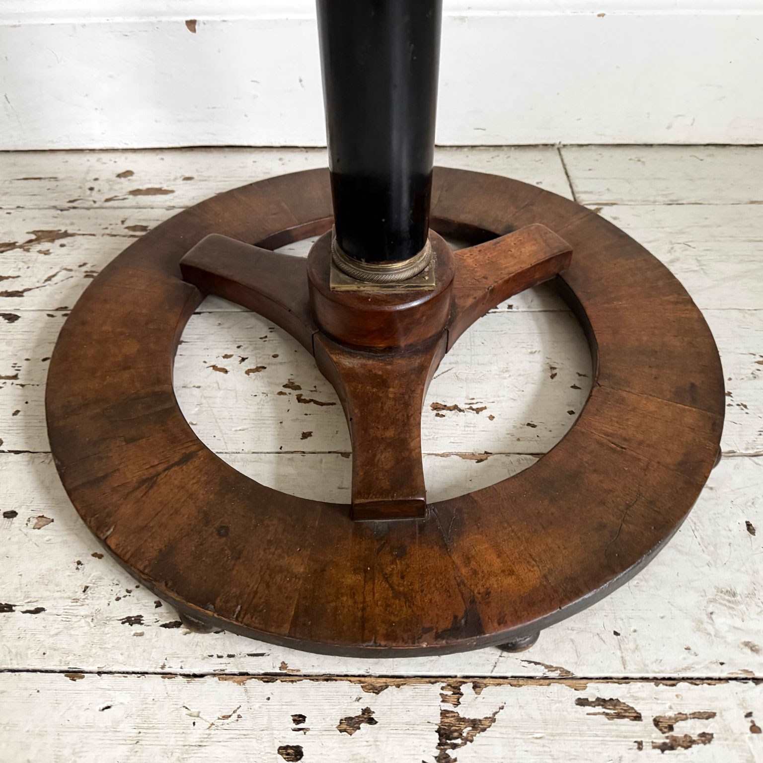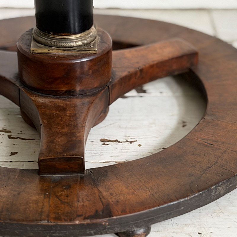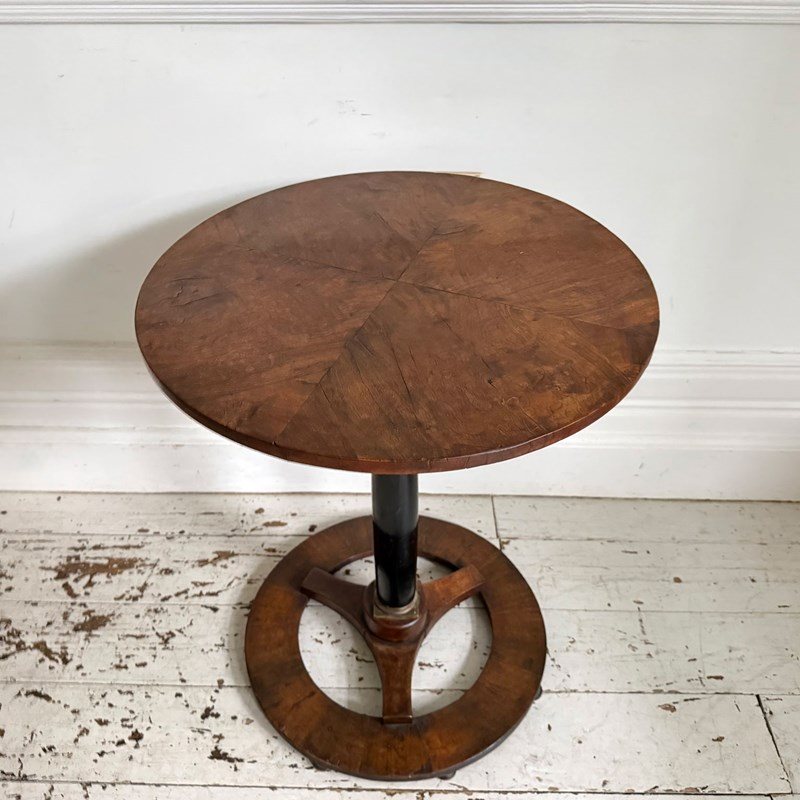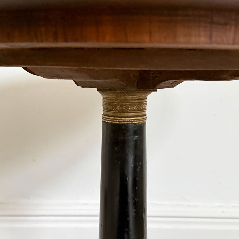 An antique Italian centre table with unusual circular base, lacquered stem, veneered walnut top and brass detailed to plinth.