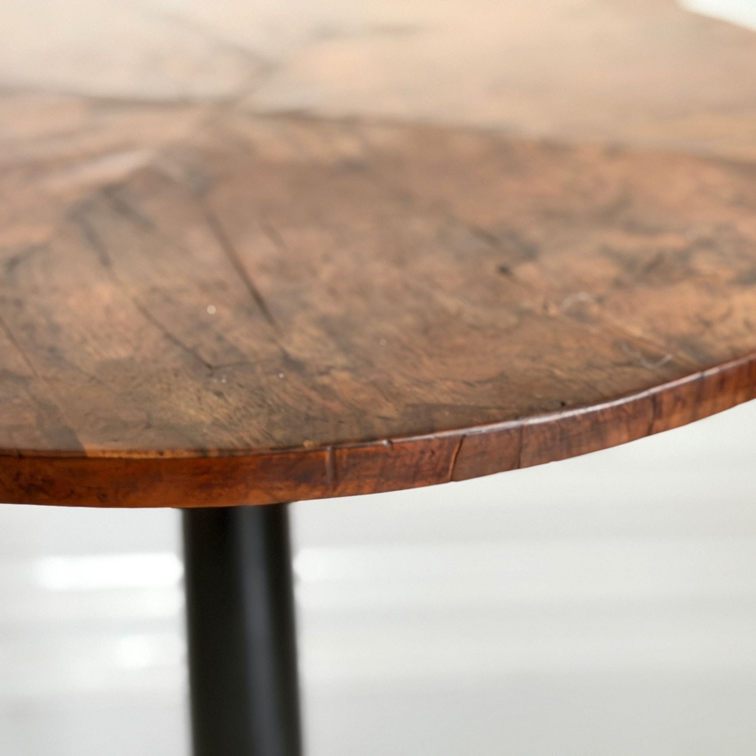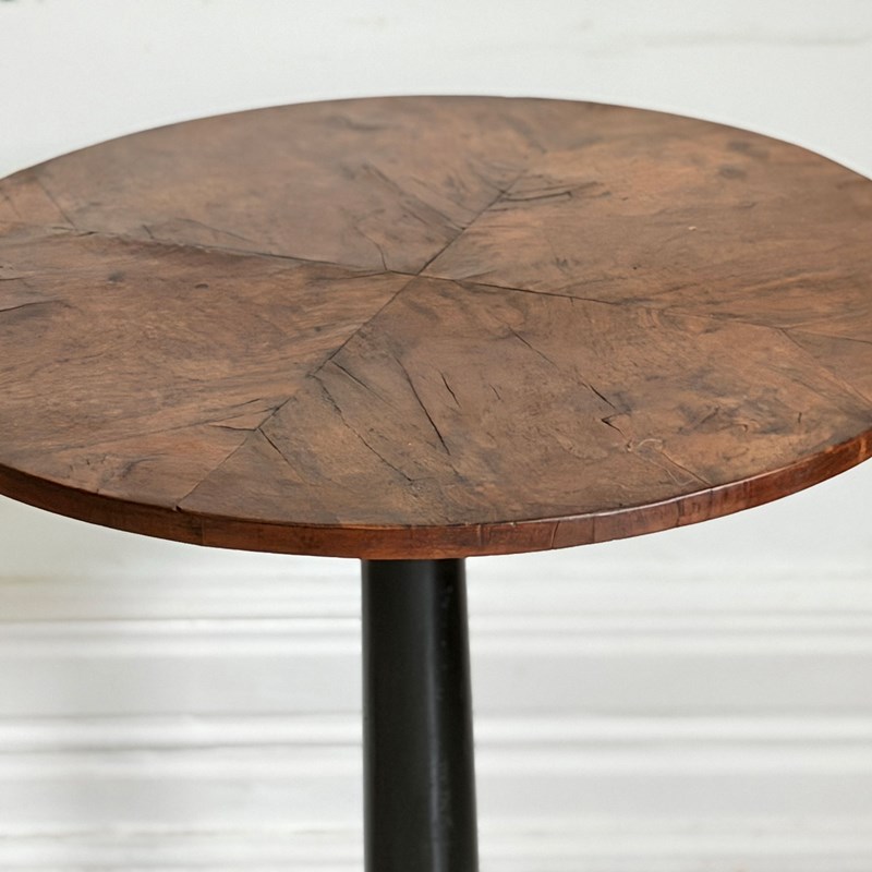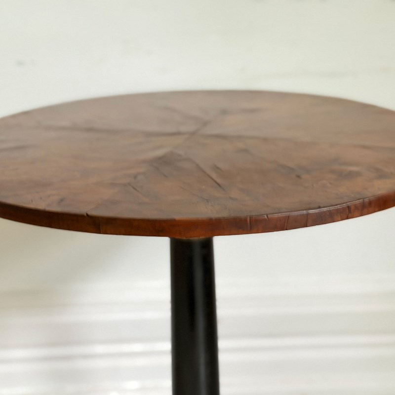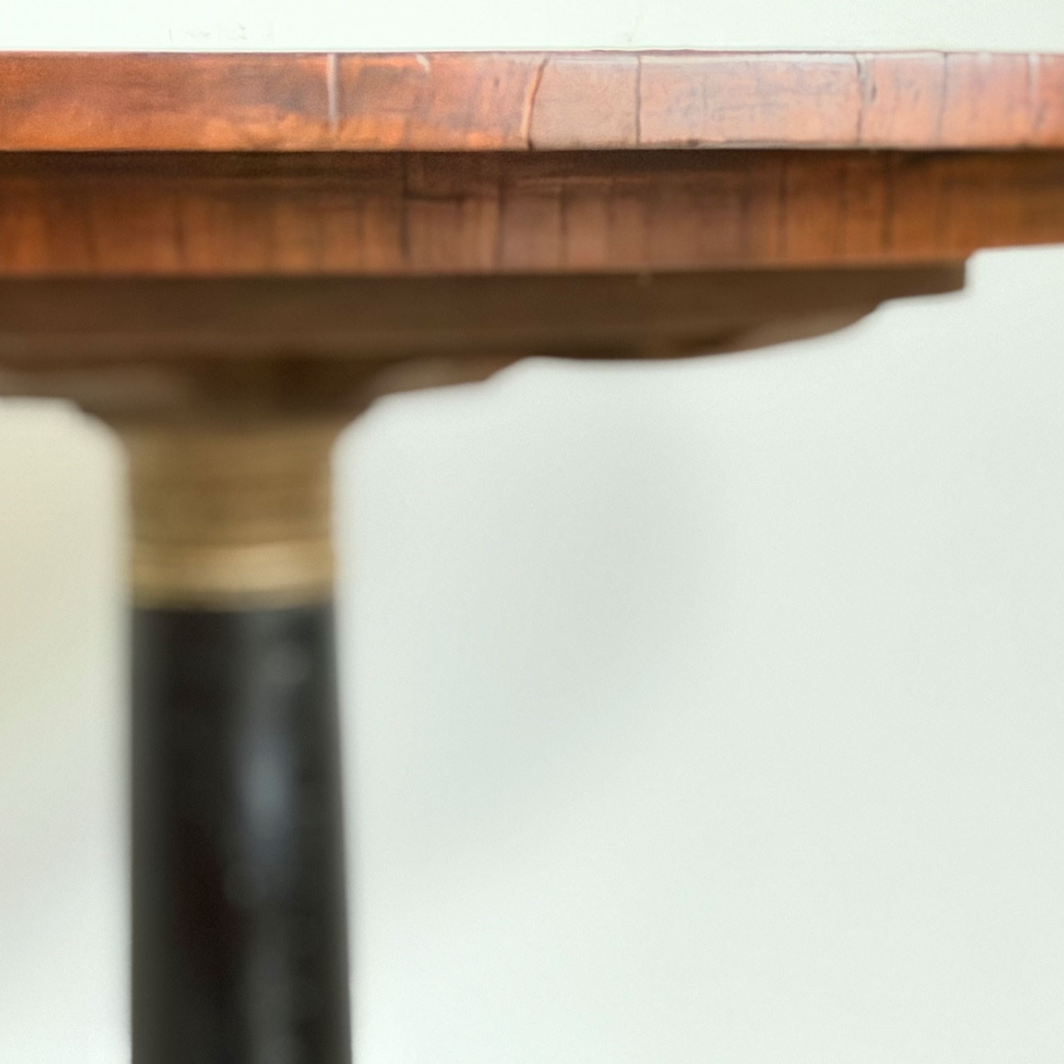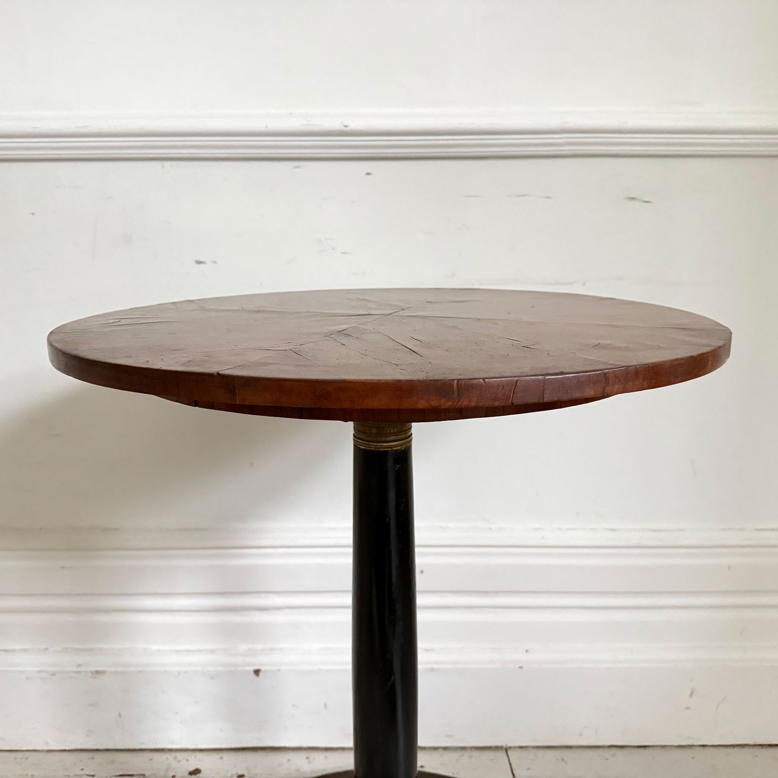 An antique Italian centre table with unusual circular base, lacquered stem, veneered walnut top and brass detailed to plinth.