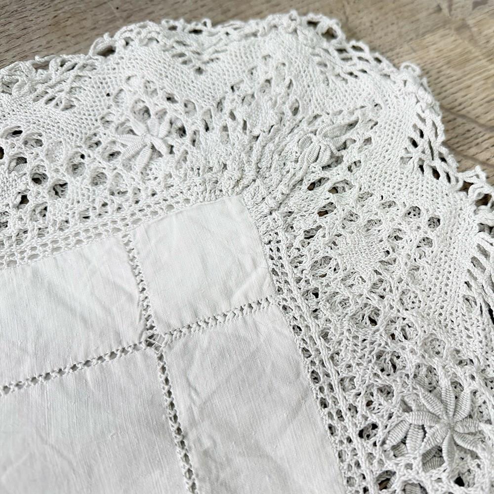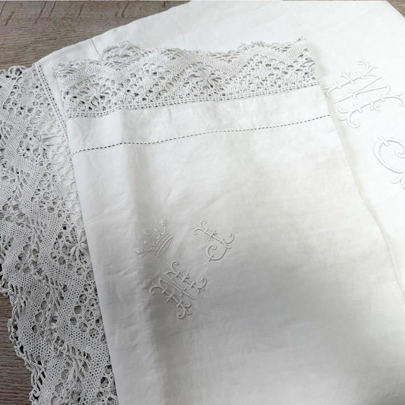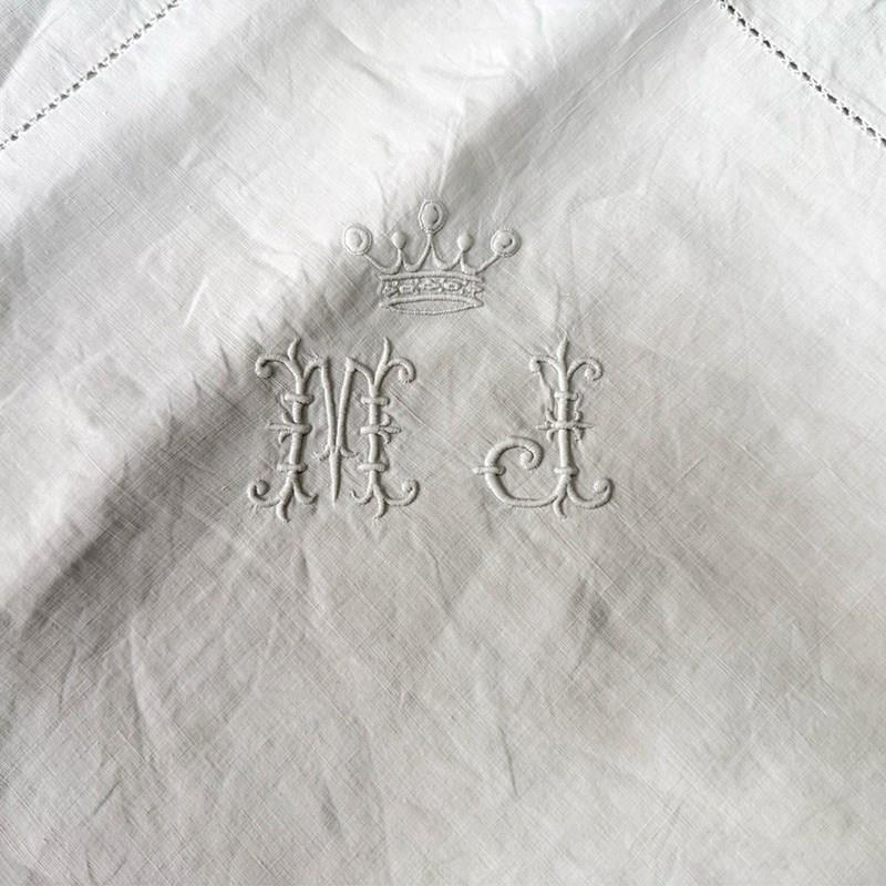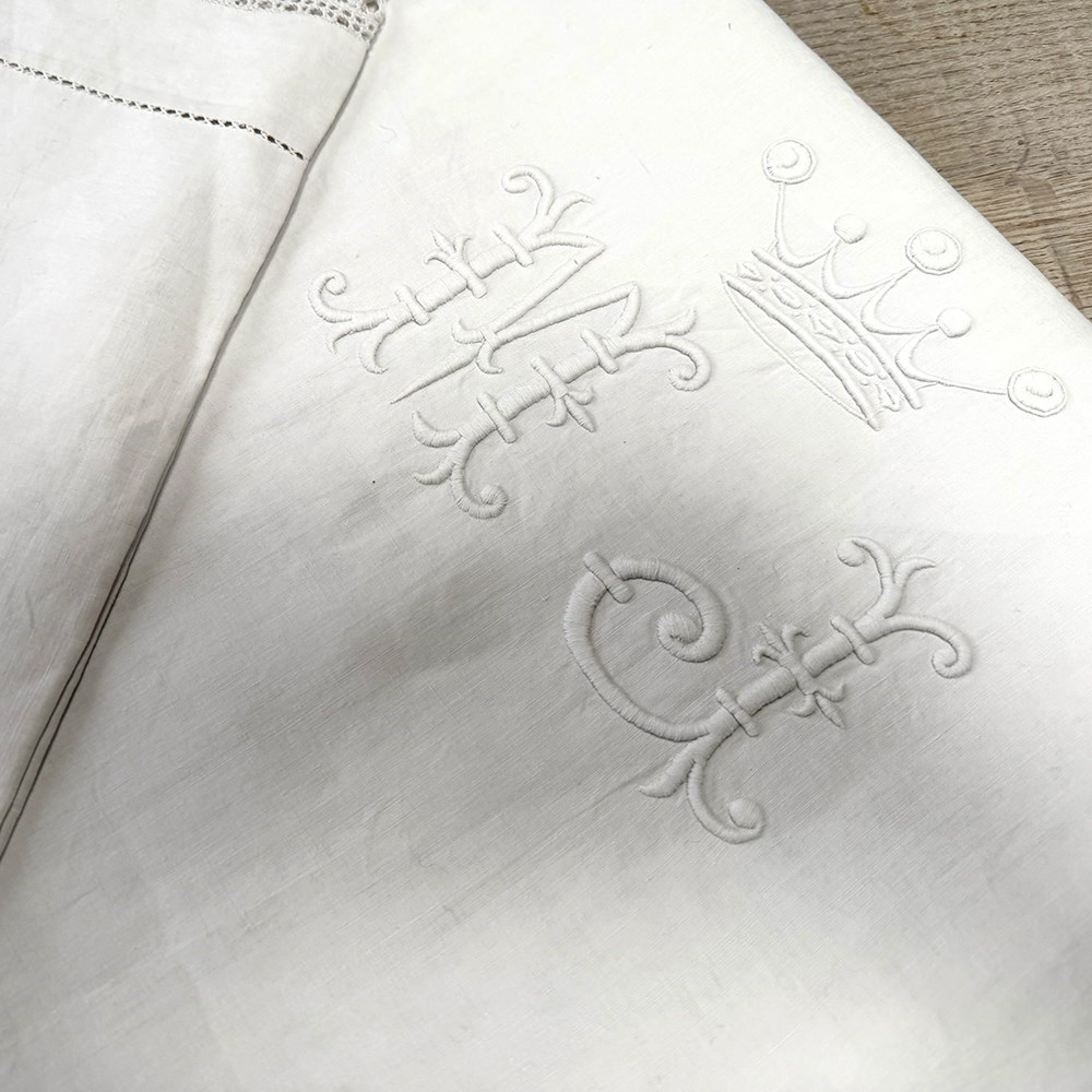 One of two French linen dowry sheets we purchased on our recent buying trip, this one with a hand embroidered crown over a pretty MJ monogram, with a matching square pillowcase, also monogrammed and both surrounded with lace. Crowns are the most sought after embroideries as they were created for French nobility and they are particularly rare.