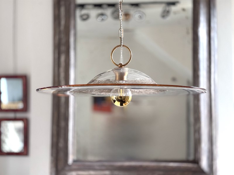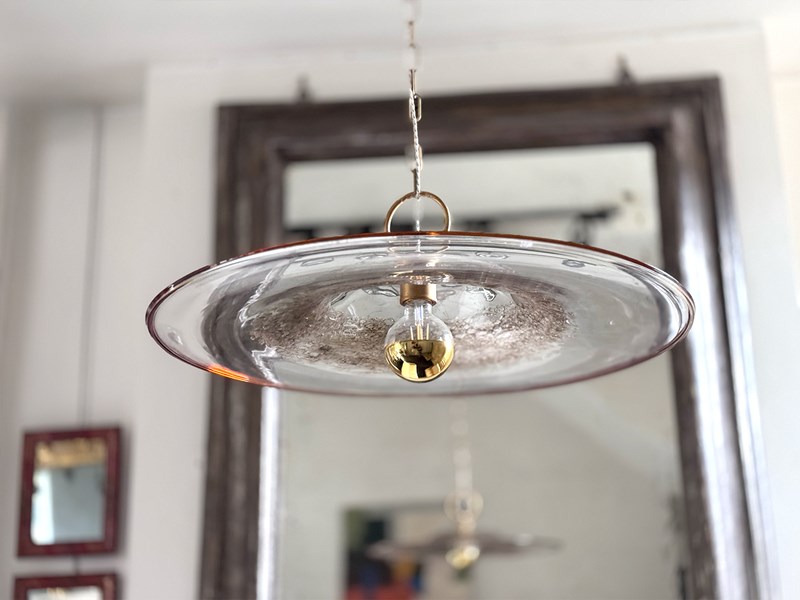 A wide vintage Murano glass pendant in peachy tan glass and with decorative bubbling to the glass. Newly rewired and PAT tested. Supplied with matching ceiling rose and brass chain.