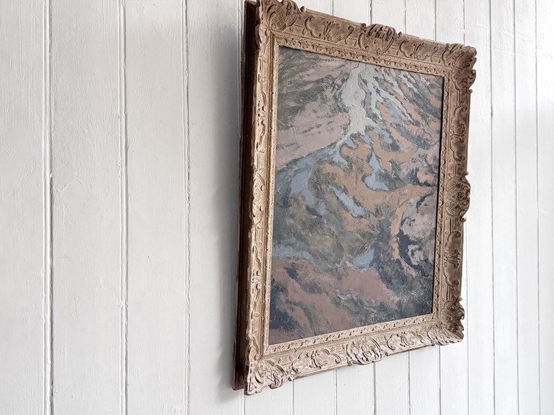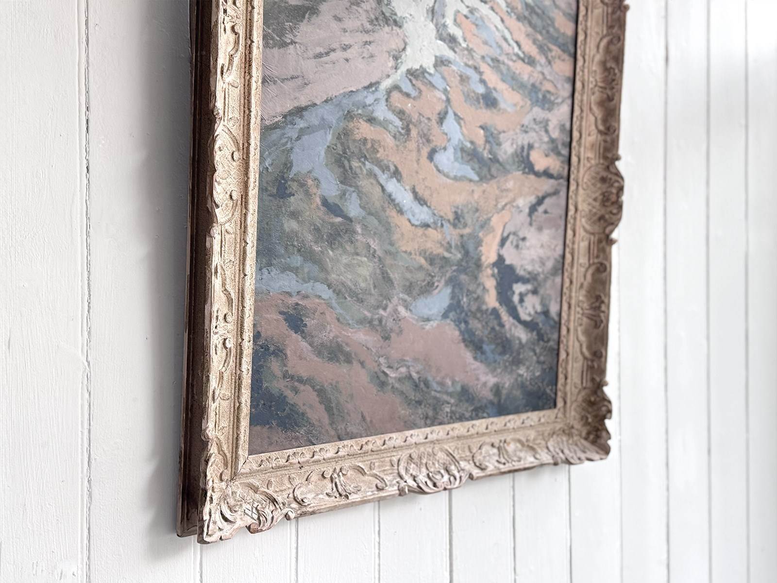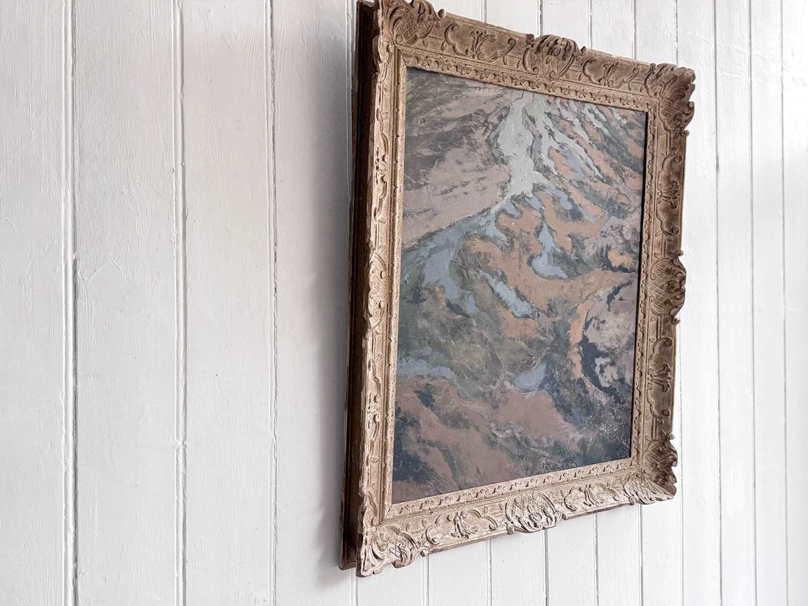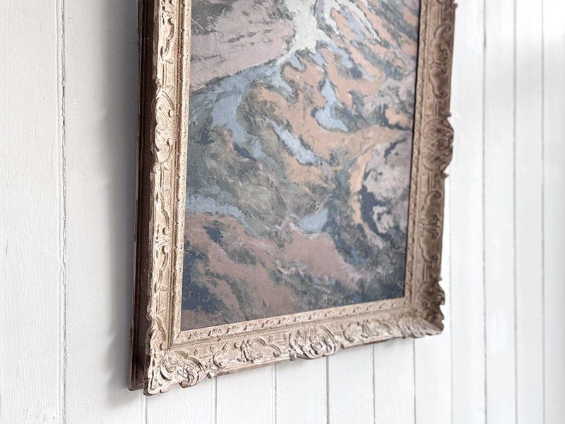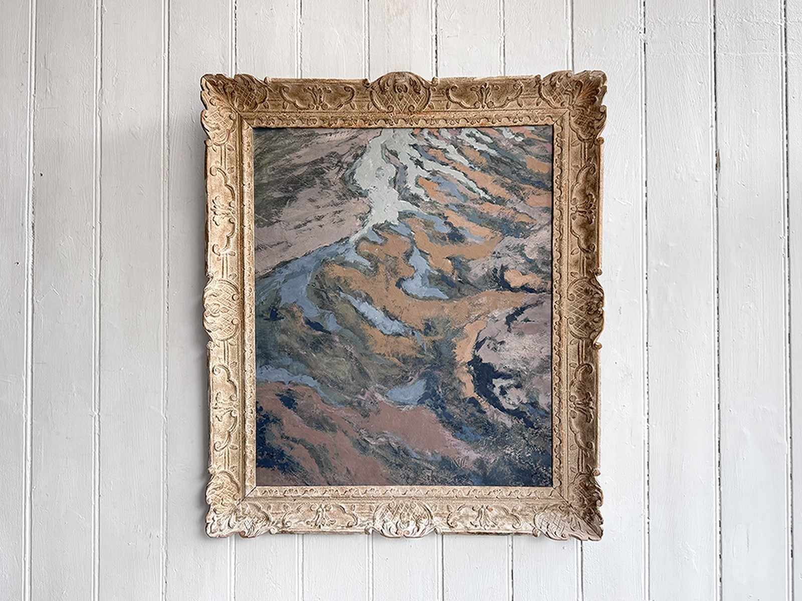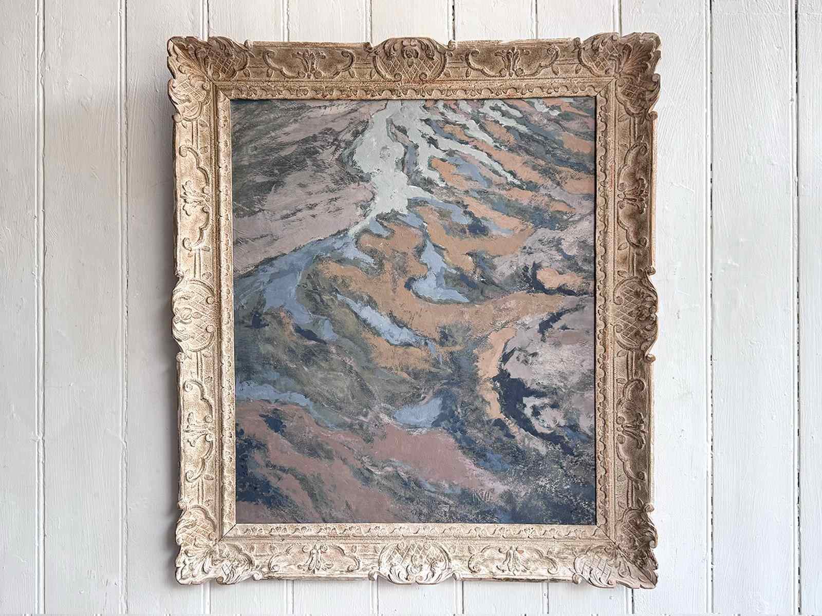 A large abstract in blue beige tones by Jean-Pierre Villeneuve. Acrylic on paper and mounted by the artist onto board. Recently set in a vintage Montparnasse frame