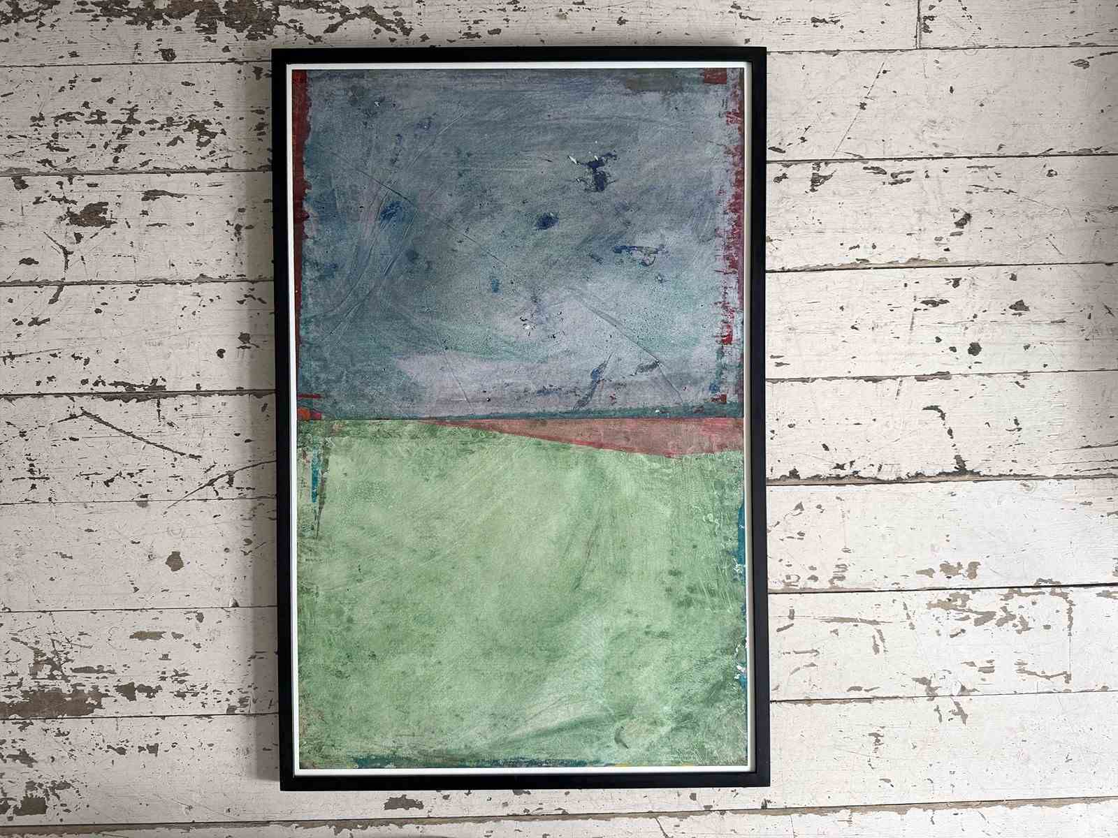 The second of three diptychs by French artist Angel Darisio. Each one is designed to be mounted as one unified artwork. Created with original pale blue and green acrylic paint with hints of red, the piece is notable for its visible brushwork and rich textural variations, which add significant depth to the composition.