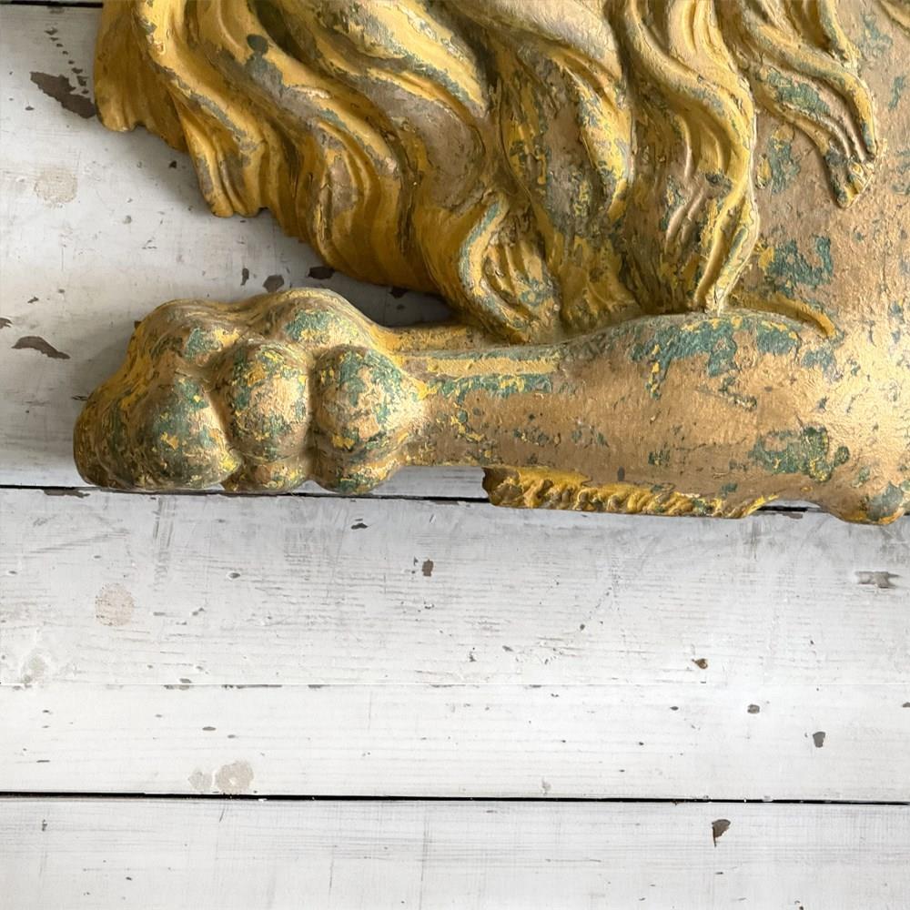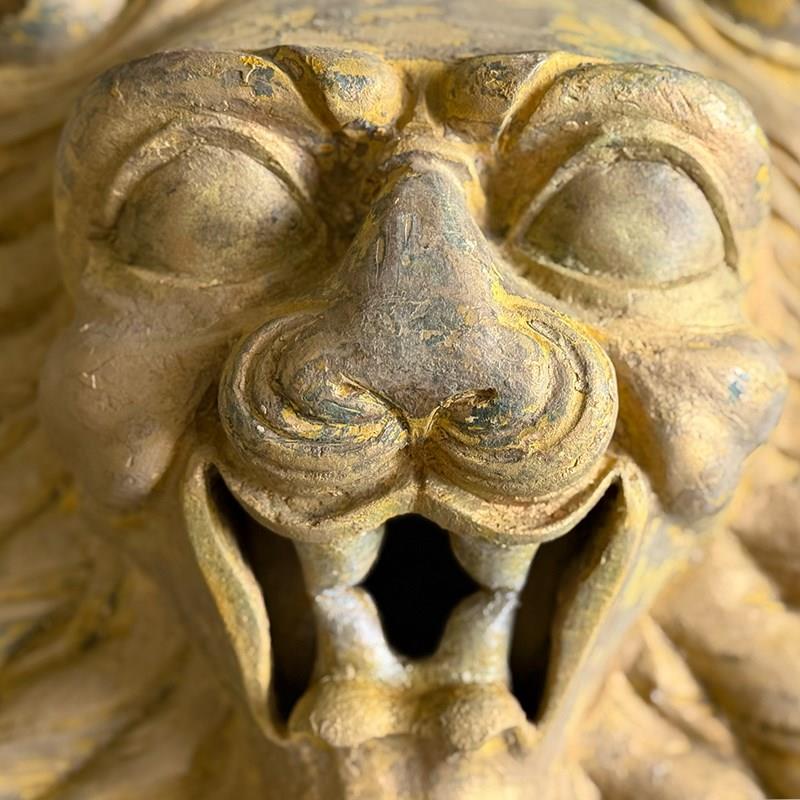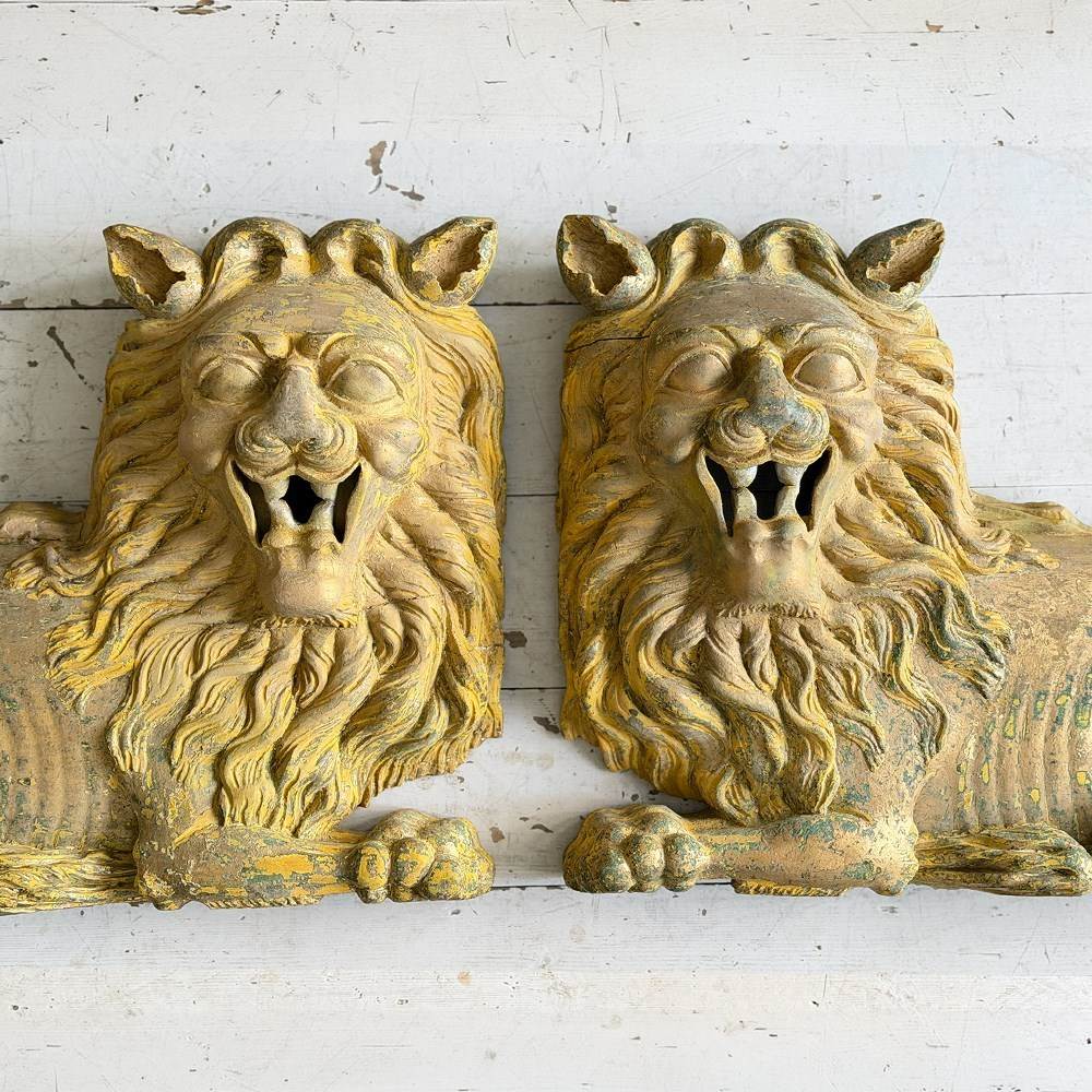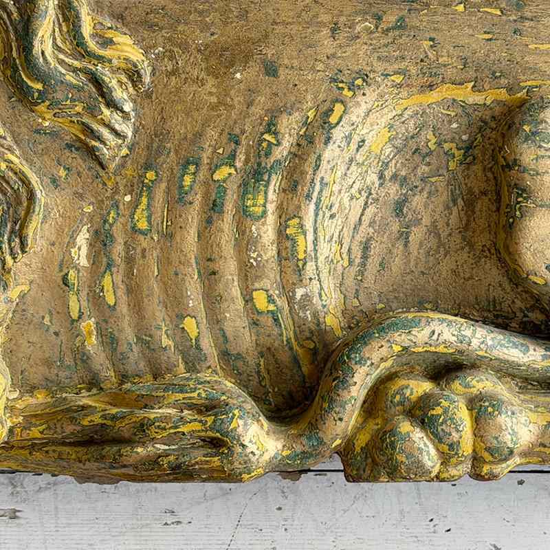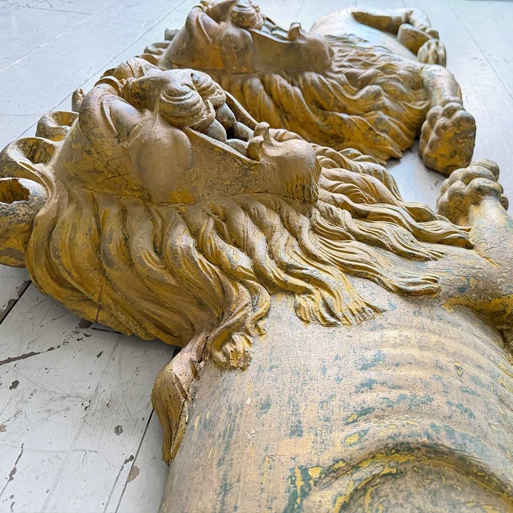 A striking, hand carved pair of Chinese Foo Dogs or Chinese Guardian Lions of large scale. Highly symbolic in Chinese culture, these represent protection, strength, courage and good luck. The fine carving has a three dimensional quality. Layers of later paint have been carefully removed by hand to reveal the original gilding. The melding of lion-like qualities such as the mane, with Foo Dog features indicates that these were most likely made for the European market.