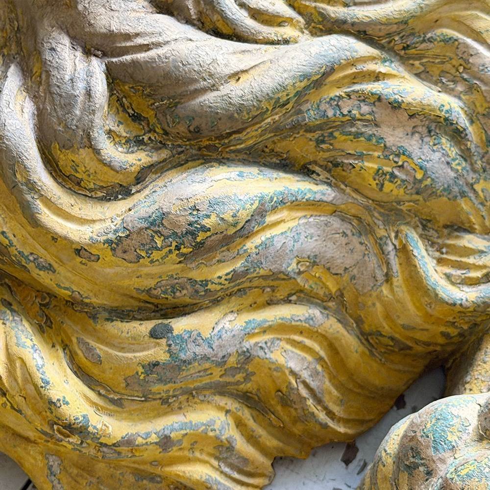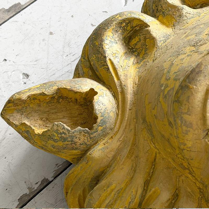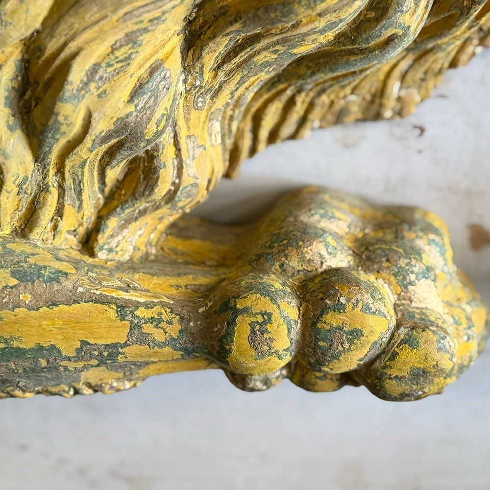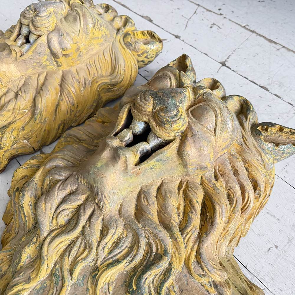 A striking, hand carved pair of Chinese Foo Dogs or Chinese Guardian Lions of large scale. Highly symbolic in Chinese culture, these represent protection, strength, courage and good luck. The fine carving has a three dimensional quality. Layers of later paint have been carefully removed by hand to reveal the original gilding. The melding of lion-like qualities such as the mane, with Foo Dog features indicates that these were most likely made for the European market.