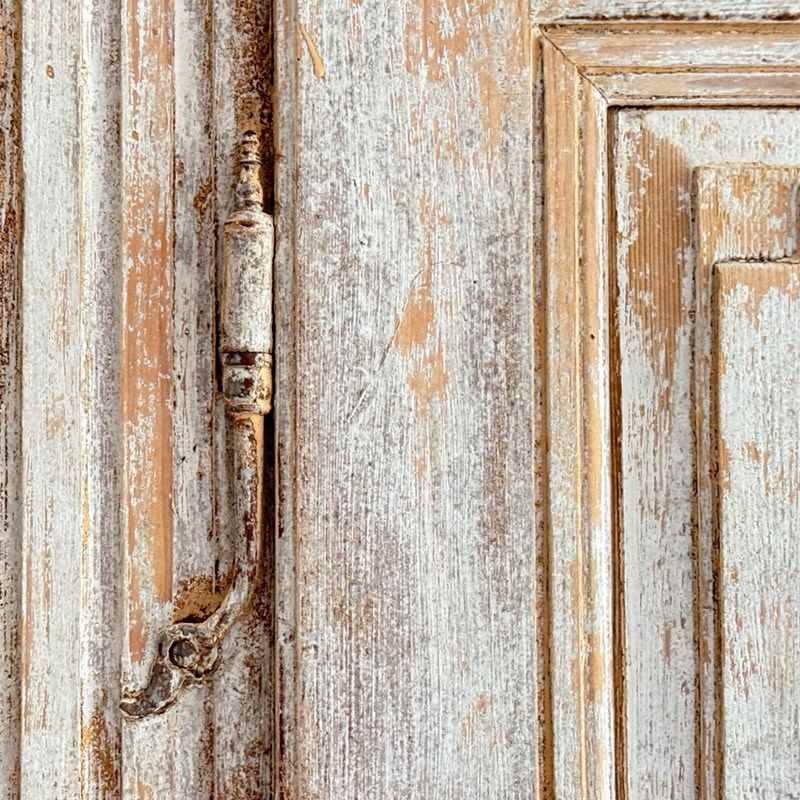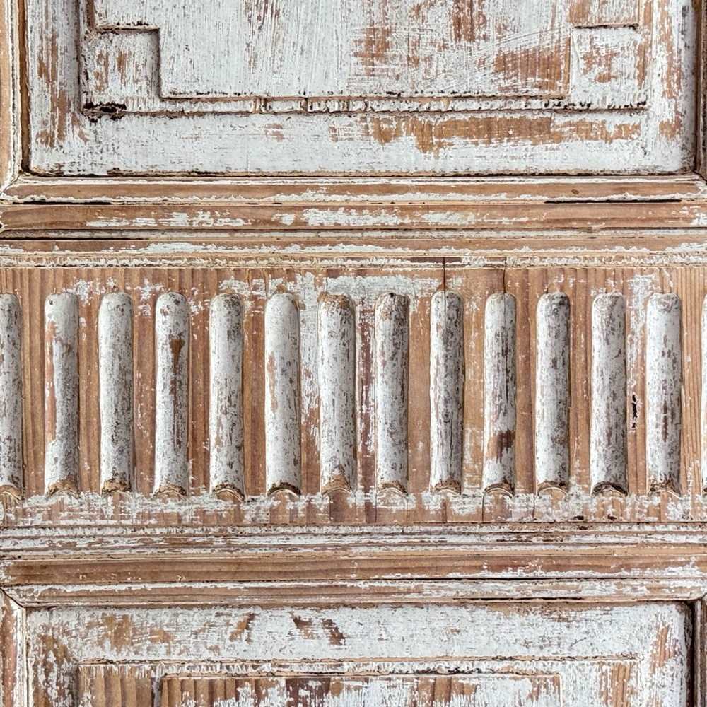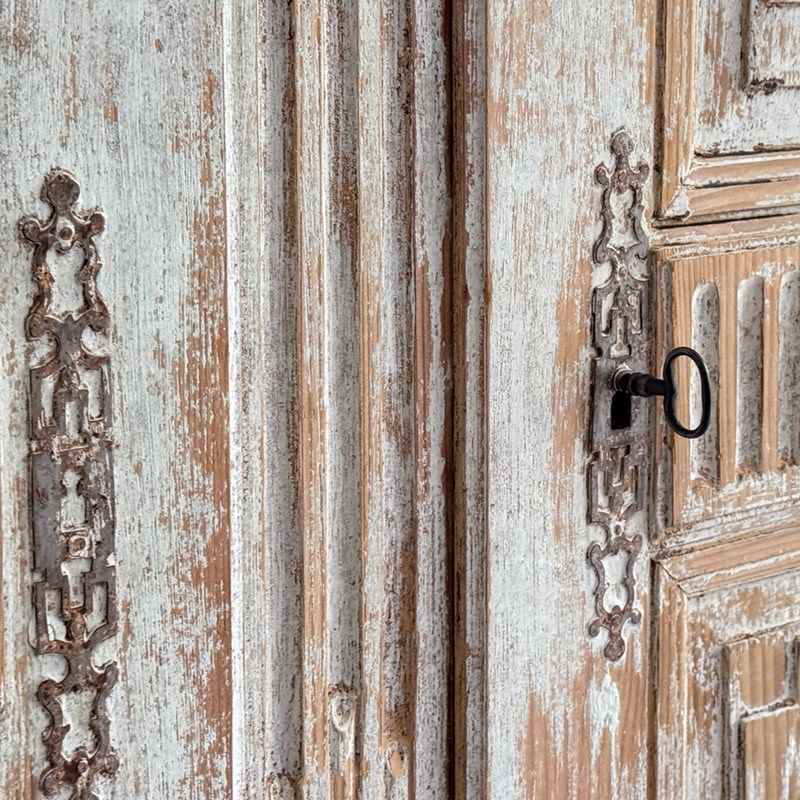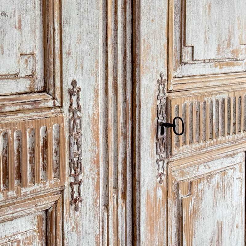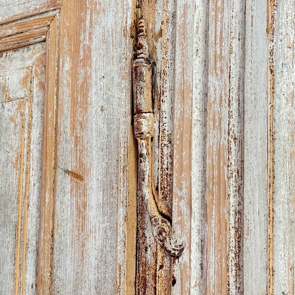 An antique French armoire with many interesting and attractive elements such as the unusual metal work; reeded carving; remnants of original pale paint; vertically split for ease of access; shelved interior to one side and with hanging hooks to the other. There are four carved feet included although we like it flat to the ground.