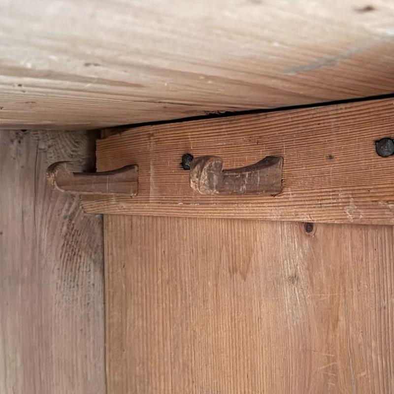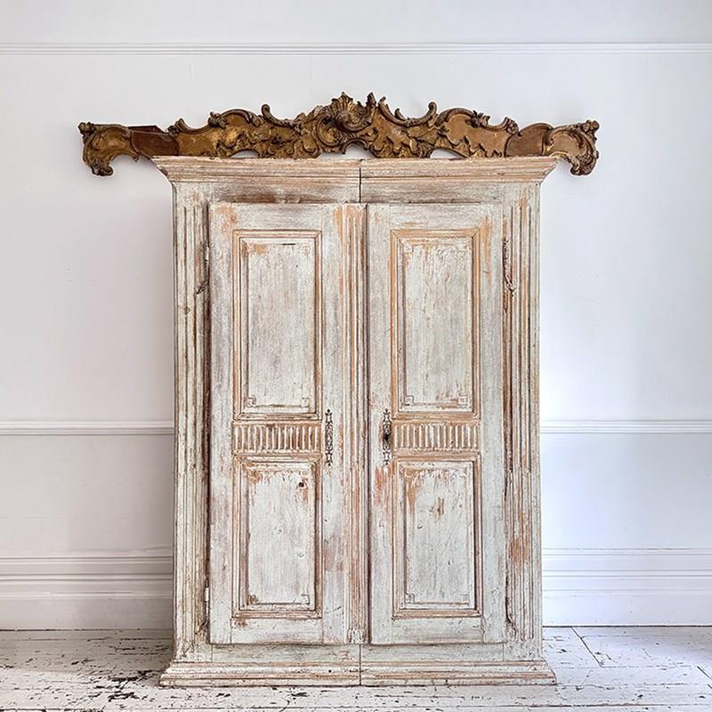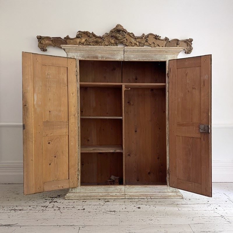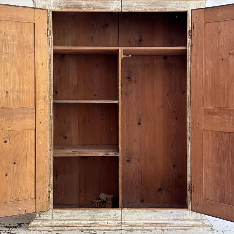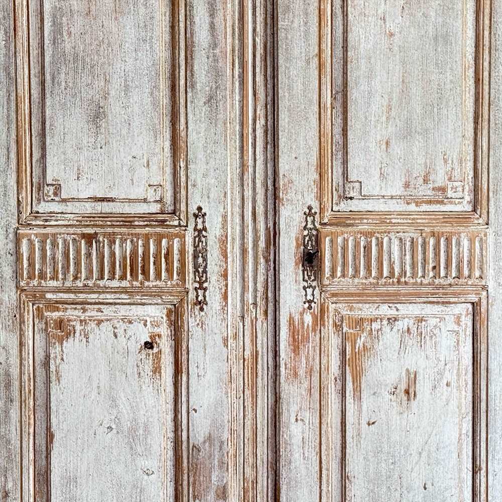 An antique French armoire with many interesting and attractive elements such as the unusual metal work; reeded carving; remnants of original pale paint; vertically split for ease of access; shelved interior to one side and with hanging hooks to the other. There are four carved feet included although we like it flat to the ground.