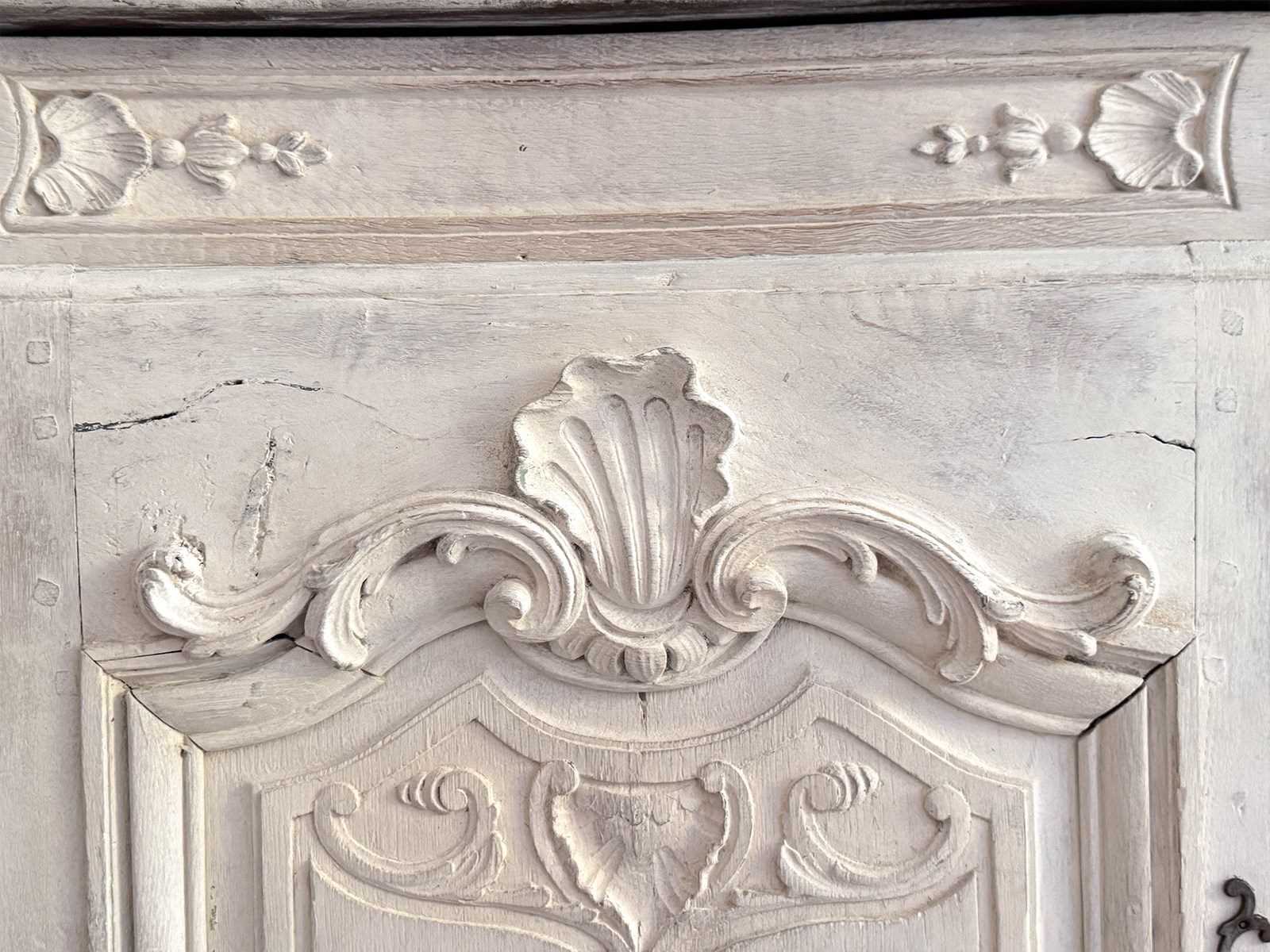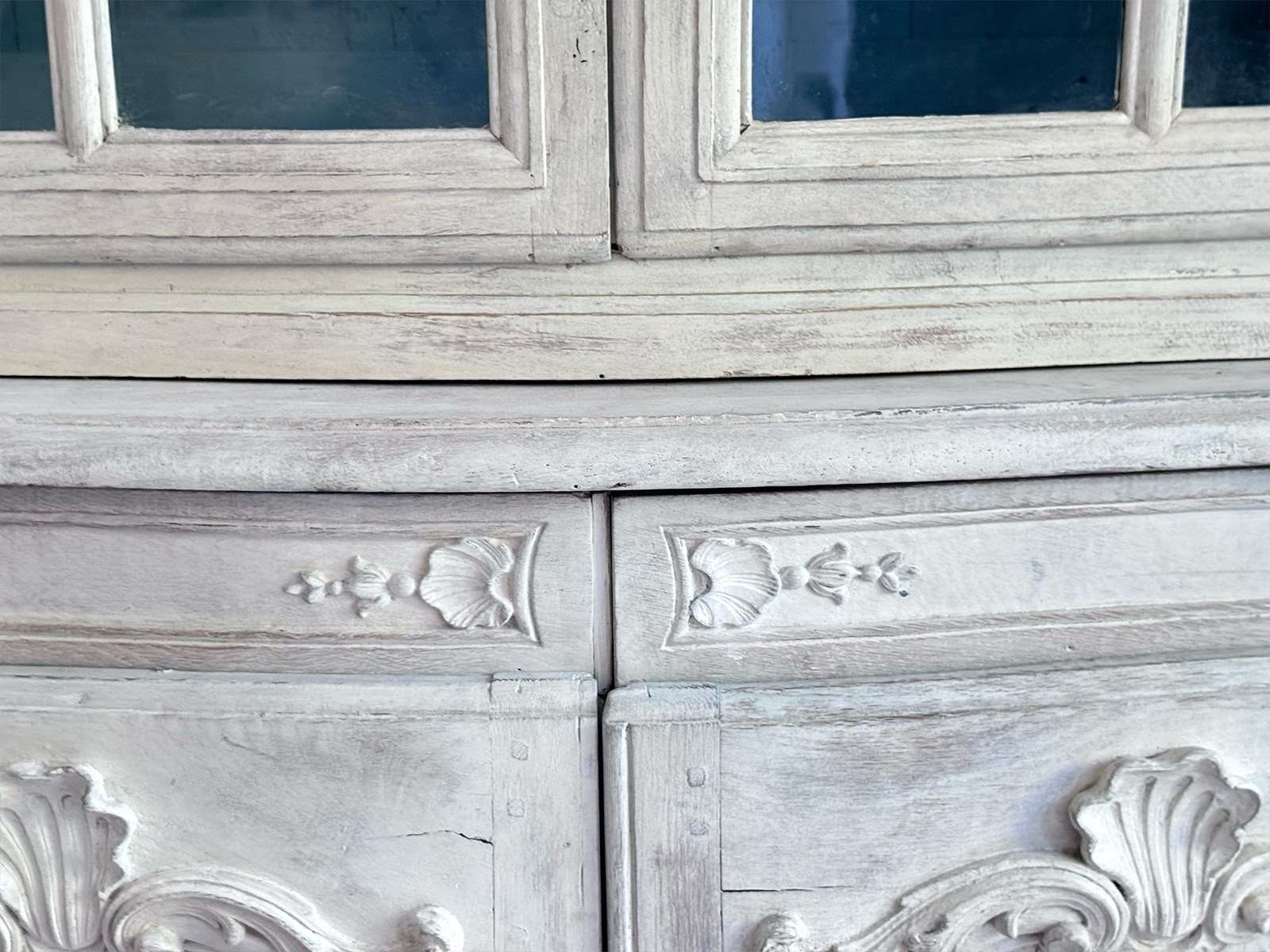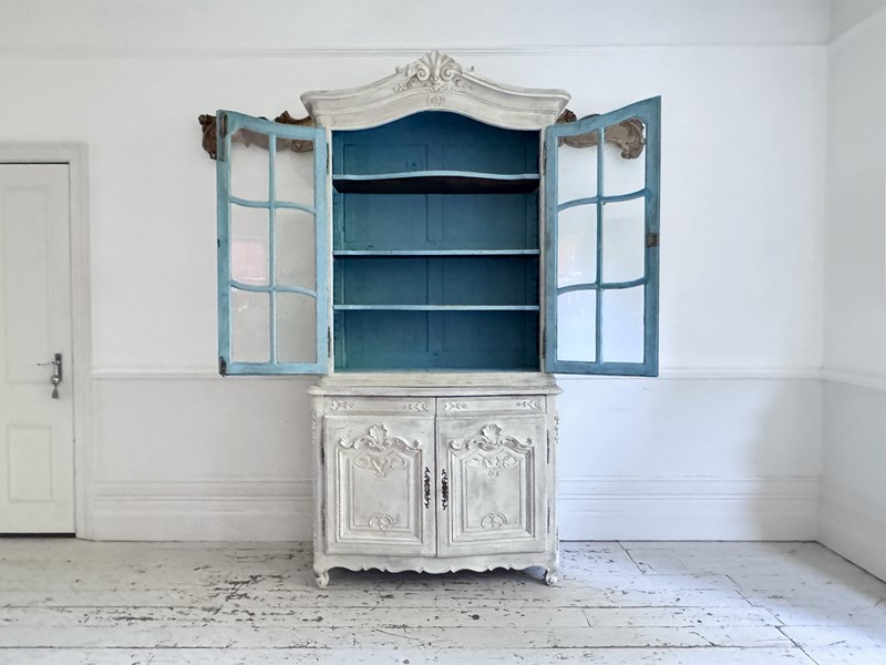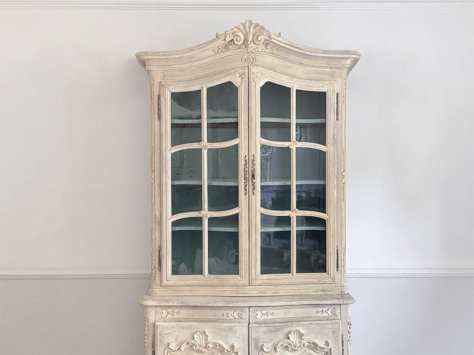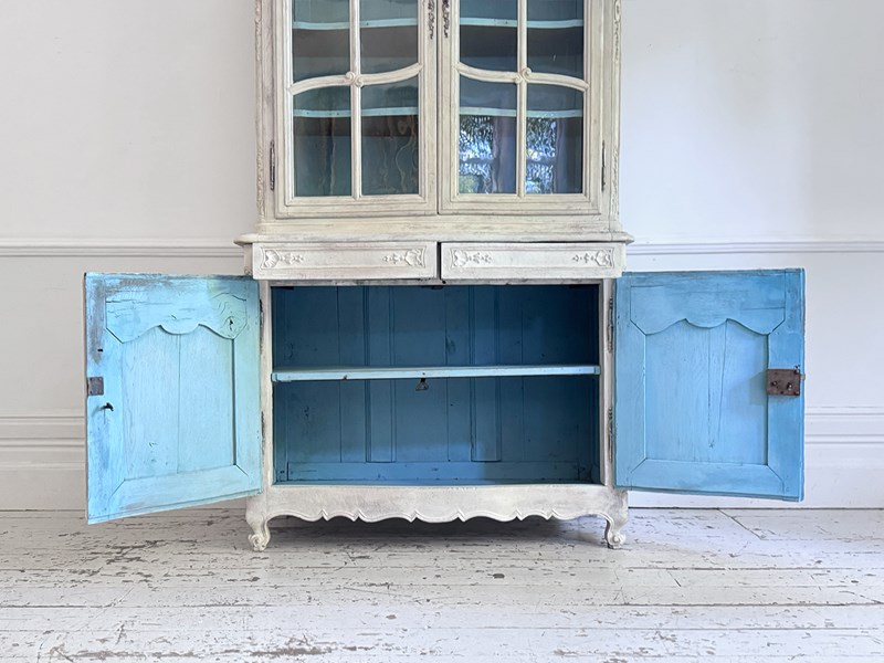 An antique French oak vitrine with wonderful shell carving with original glass and locks. The interior has been painted a beautiful French blue. This piece divides into two parts for easy carriage.
