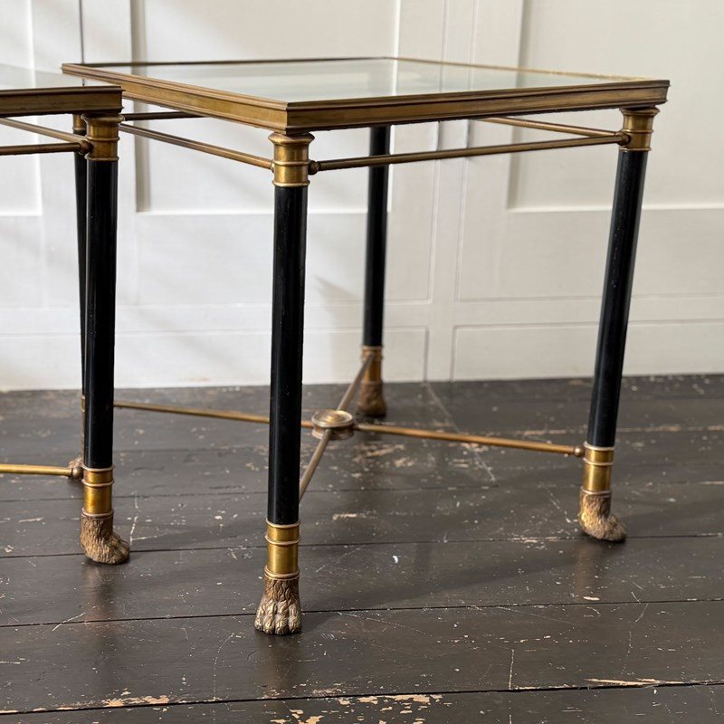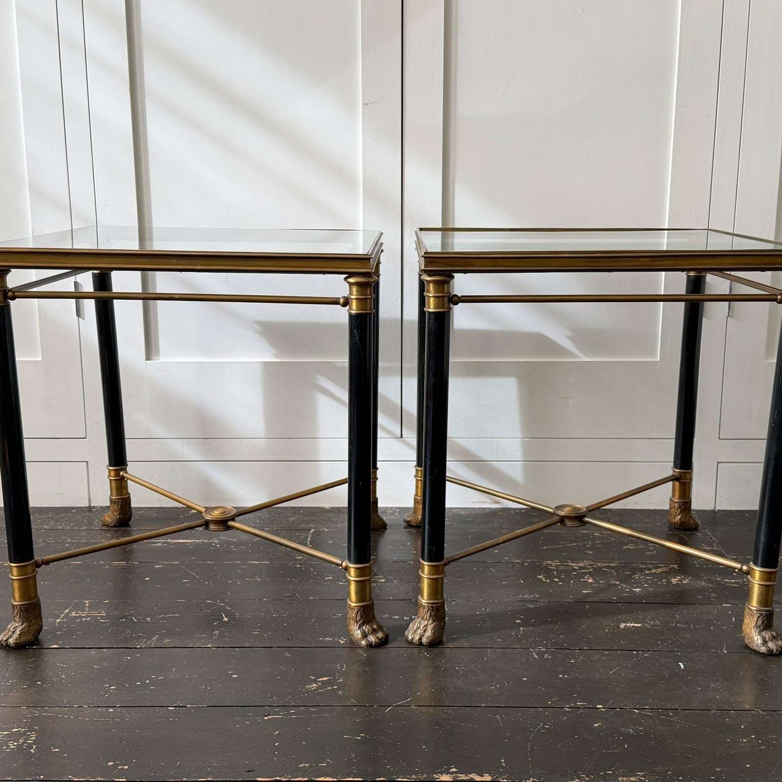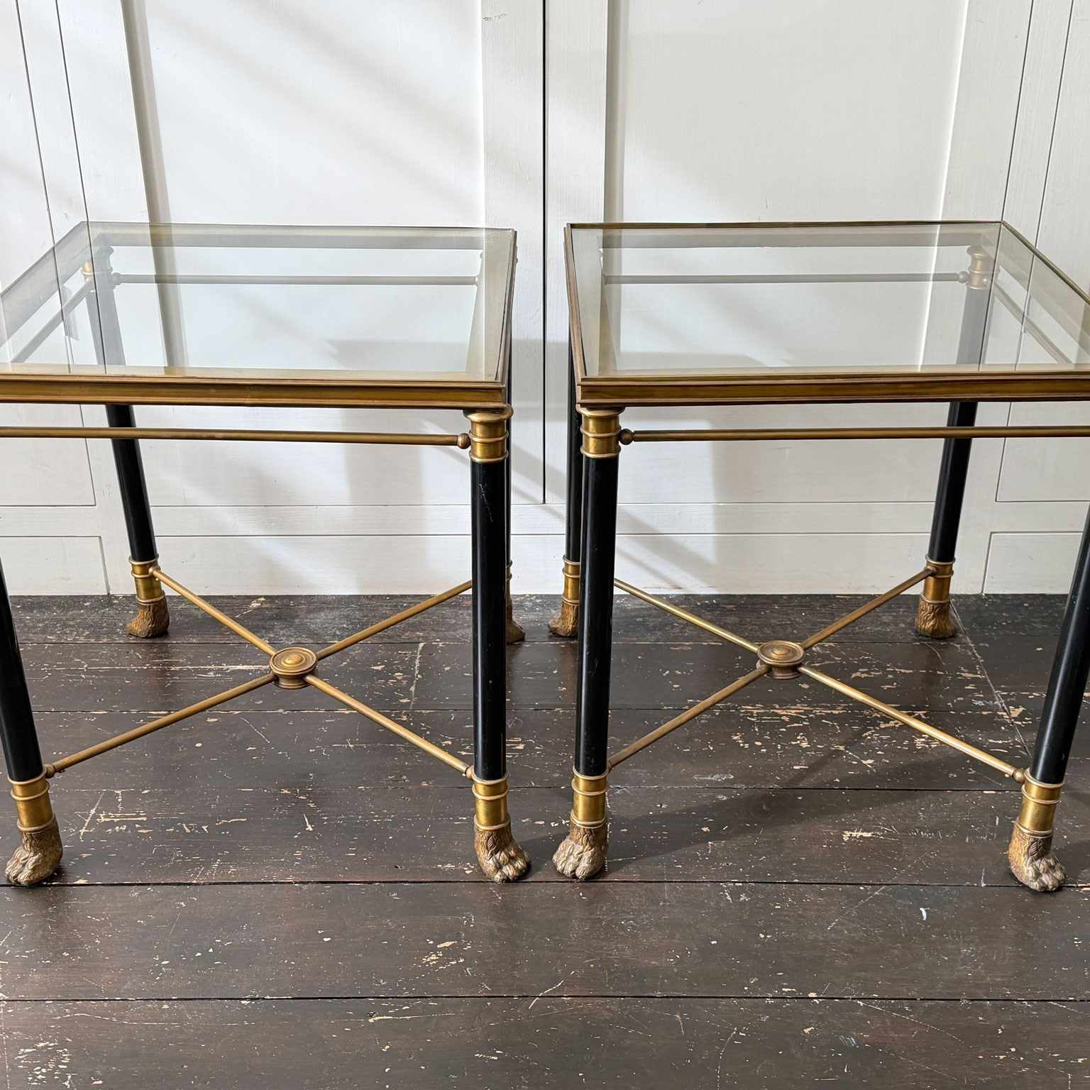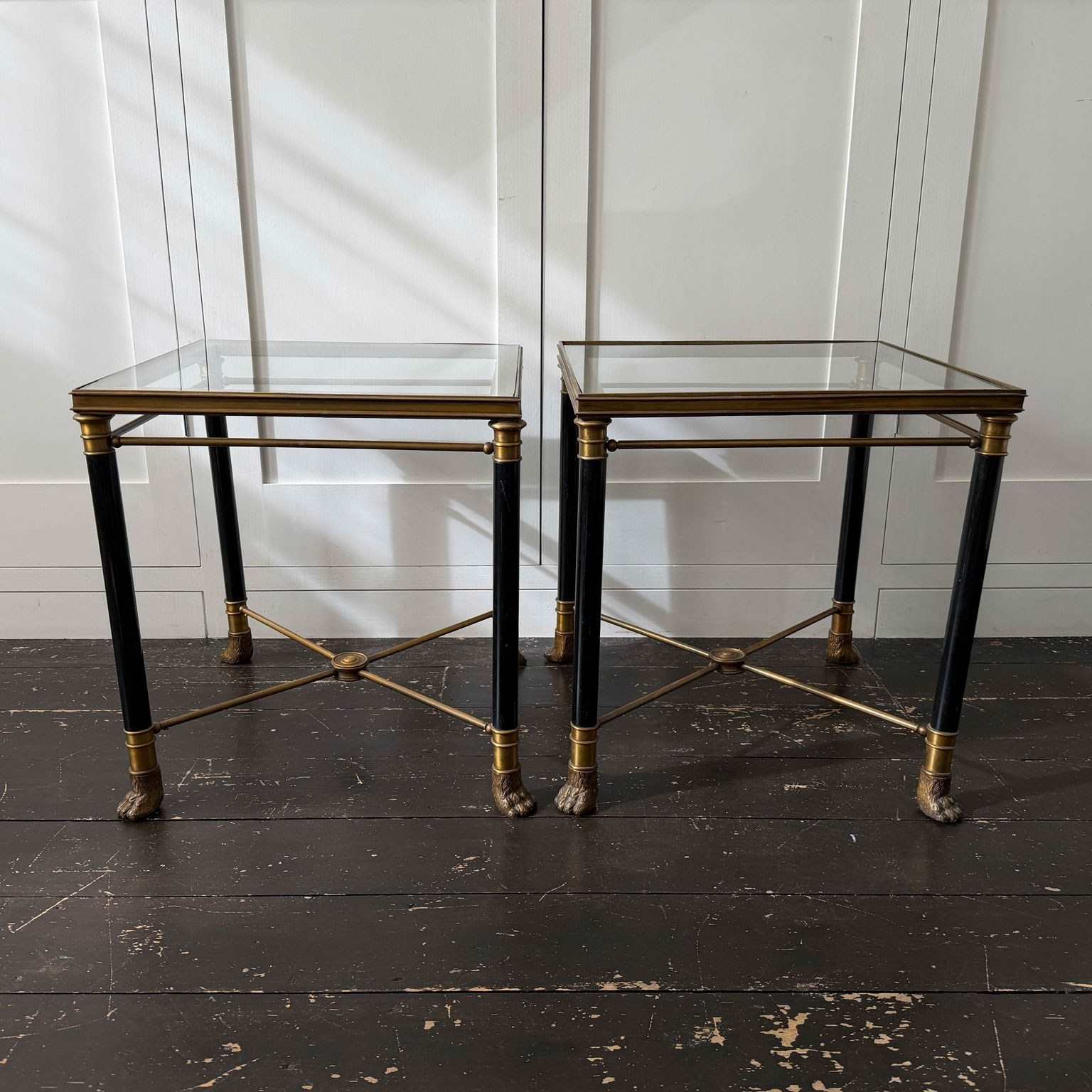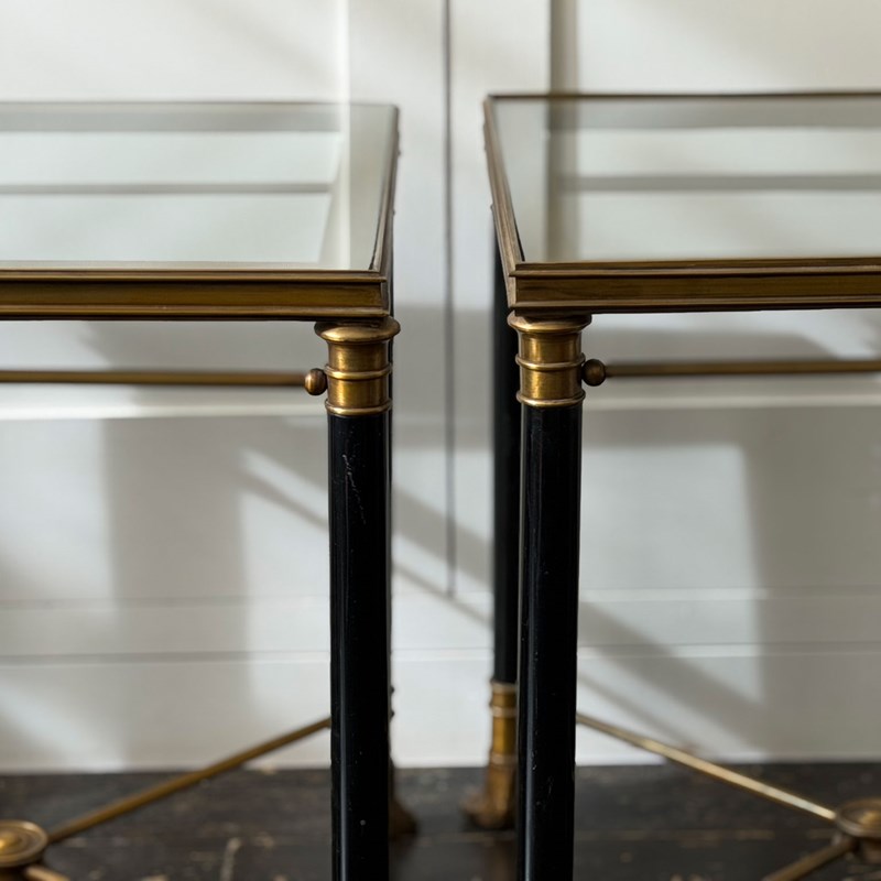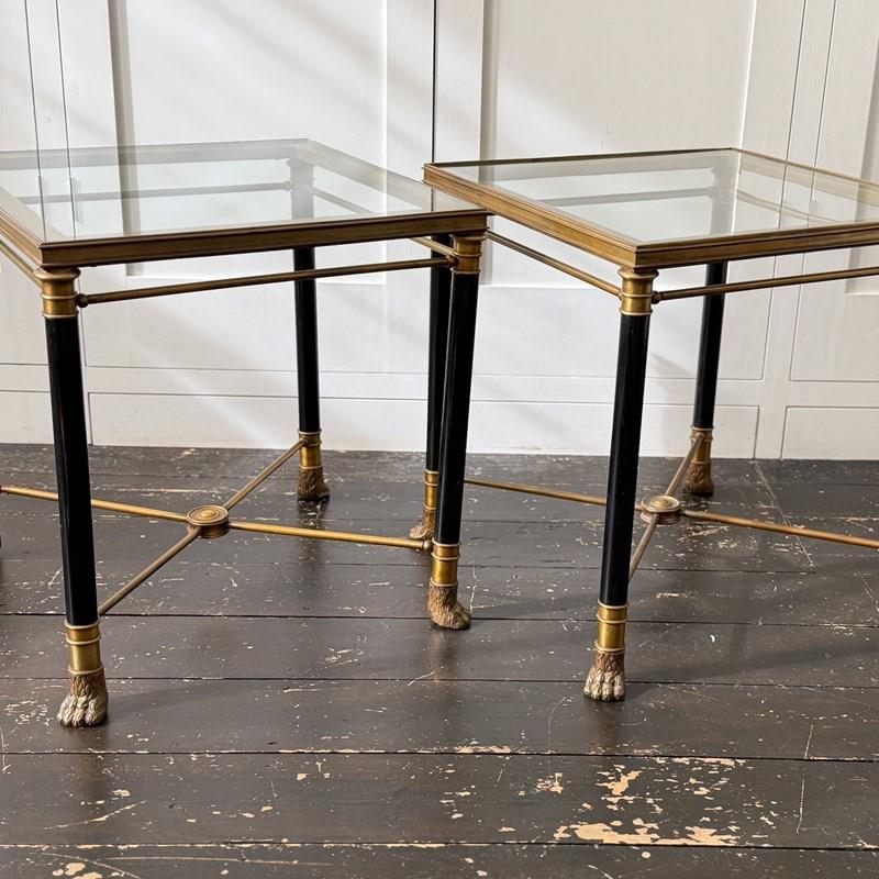 A superb pair of mid-century side tables of exceptional quality in a distinct Neoclassical design style by Maison Jansen (see p 297 of 'Jansen Furniture' by James Archer Abbott for similar design). With brass frame and black lacquered legs, the brass has a beautiful vintage patina. A notable feature is the use of classical motifs, specifically the decorative brass hairy paw feet, a design element typical of Maison Jansen's work and the central decorative medallion to the centre of the x-form stretcher.