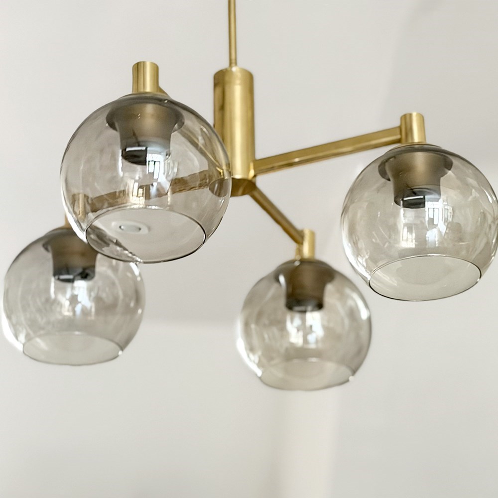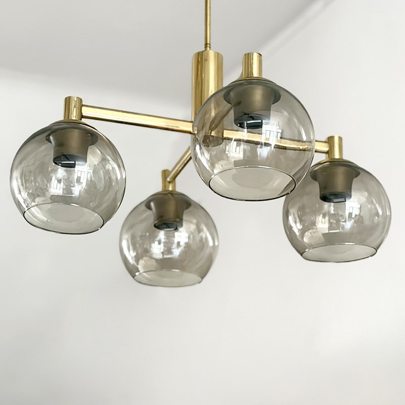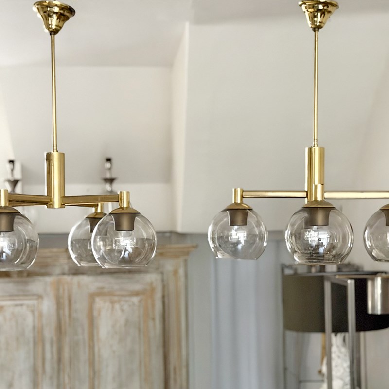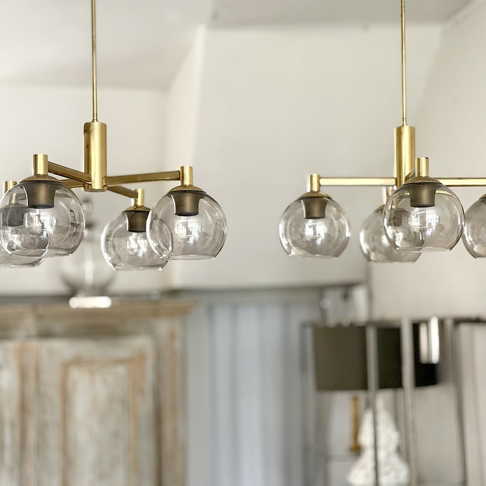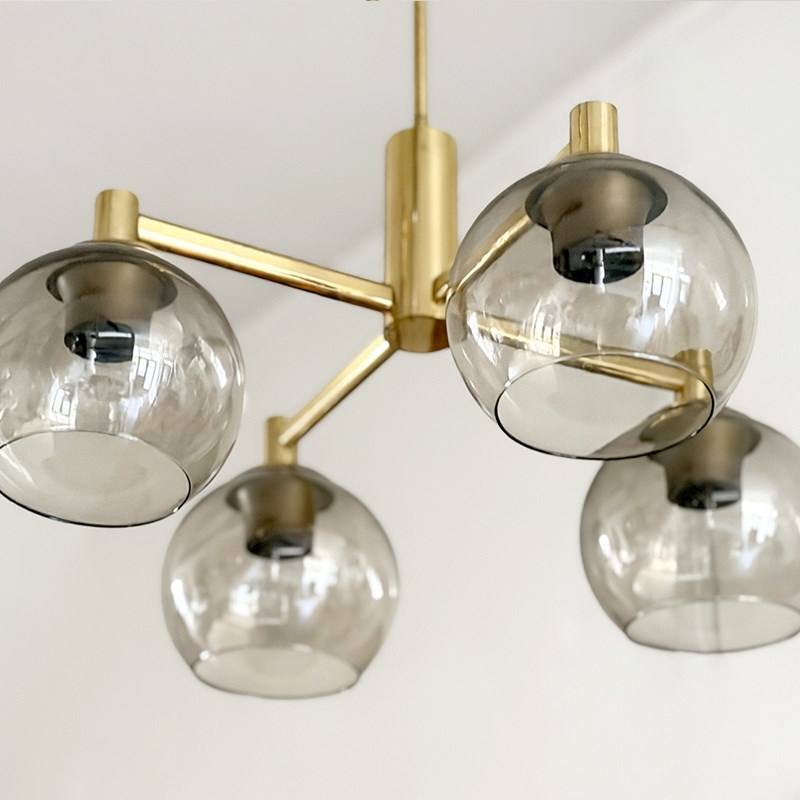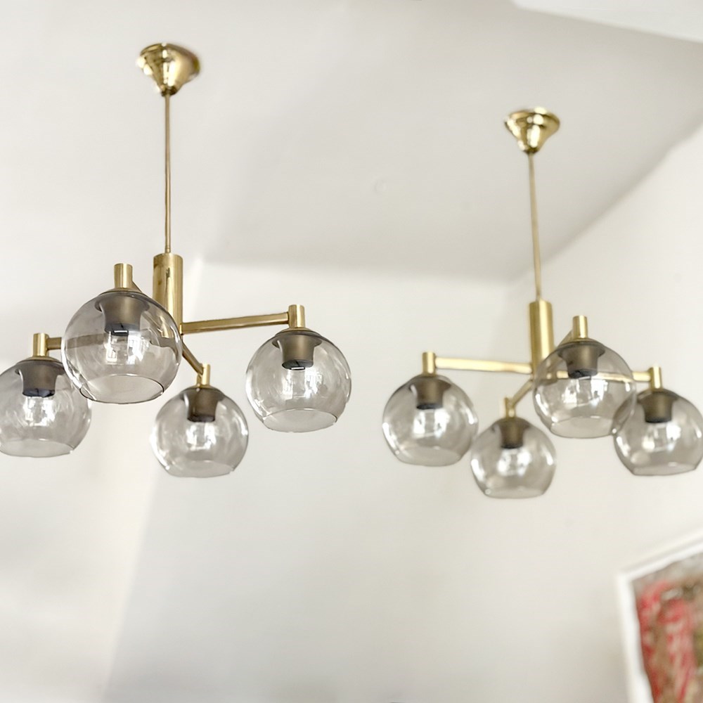 A pair of vintage French pendants each with four lights and their original brown/grey glass shades on a brass plated frame and with long stem and ceiling rose. Rewired & PAT tested.