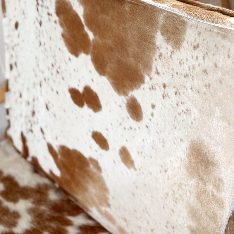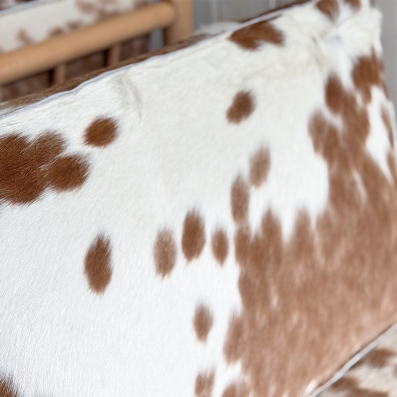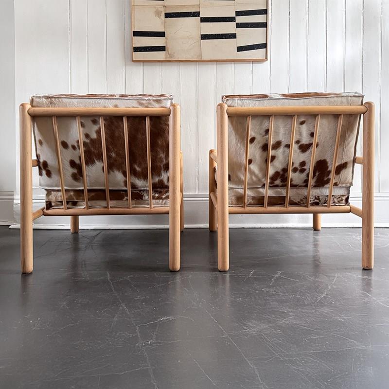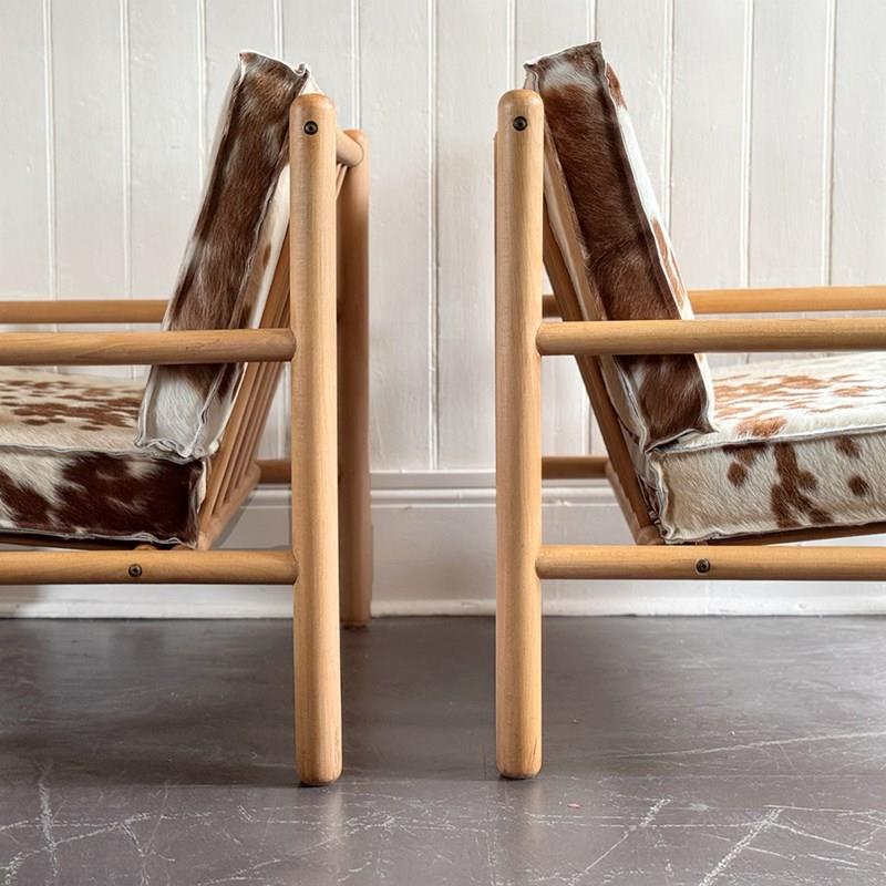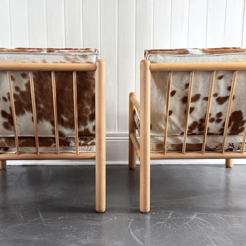 A handsome pair of 1970's Italian pine armchairs with comfortable wide seats and newly upholstered in tan and white cowhide. Sold with a spare set of off-white antique linen covers.