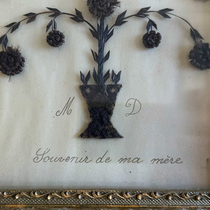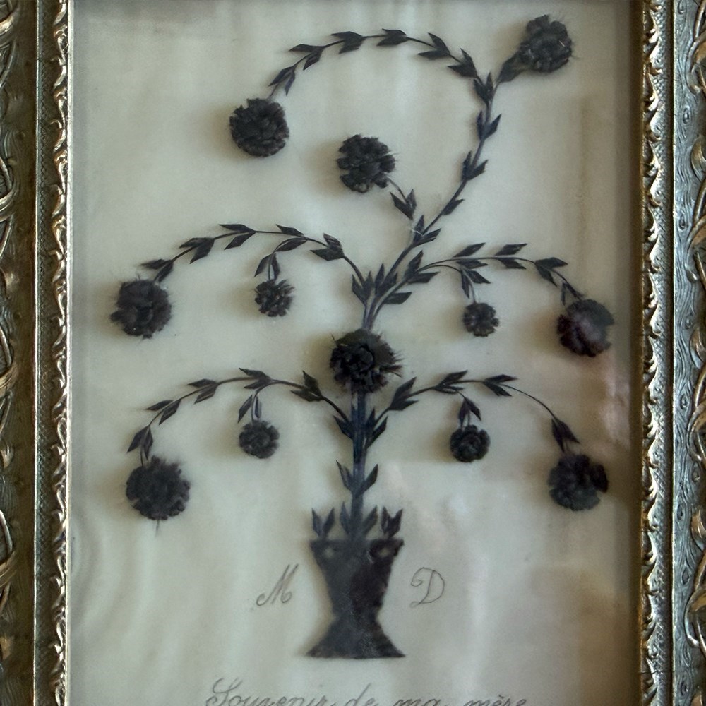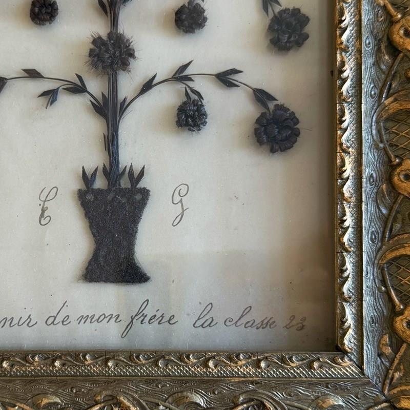 A sweet pair of classroom made floral keepsakes, made using horsehair as gifts, one to the child's mother and the other to their brother. Set within a giltwood frame. Dated 1823