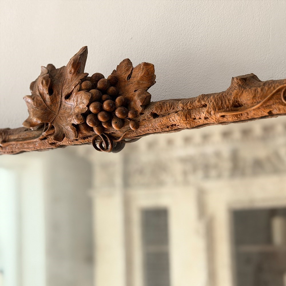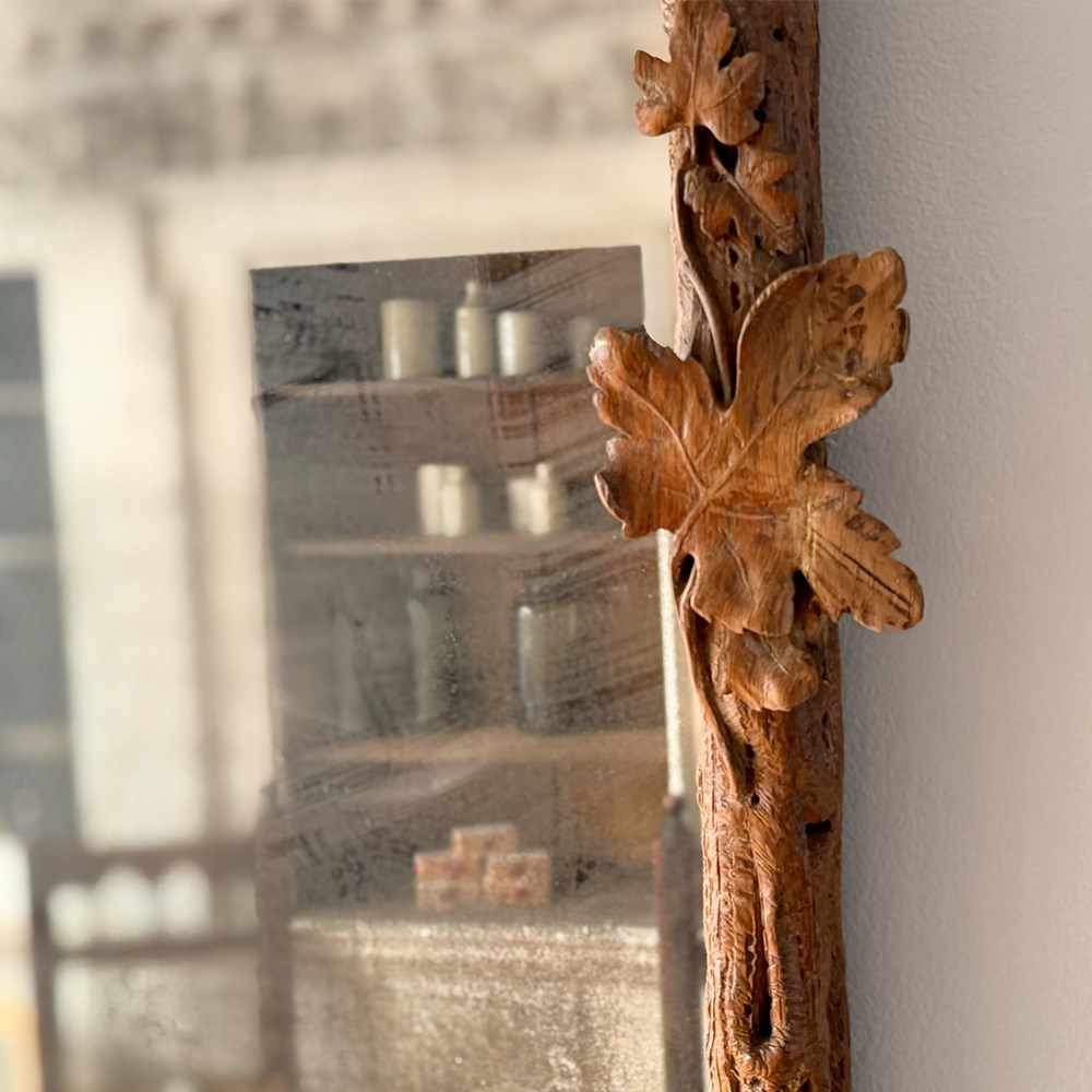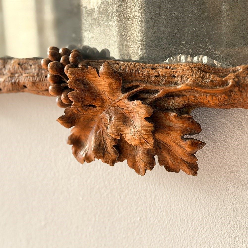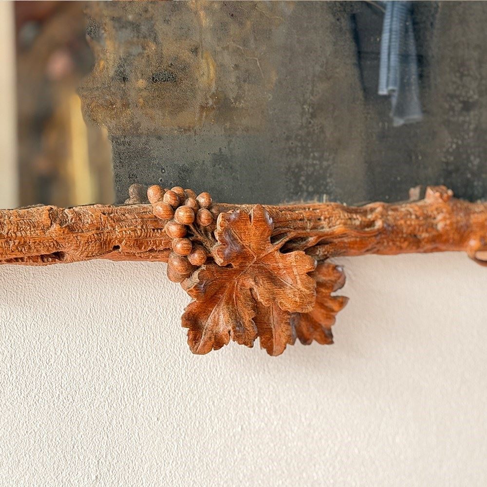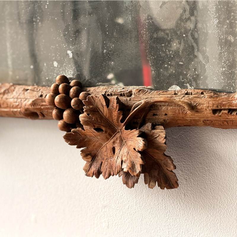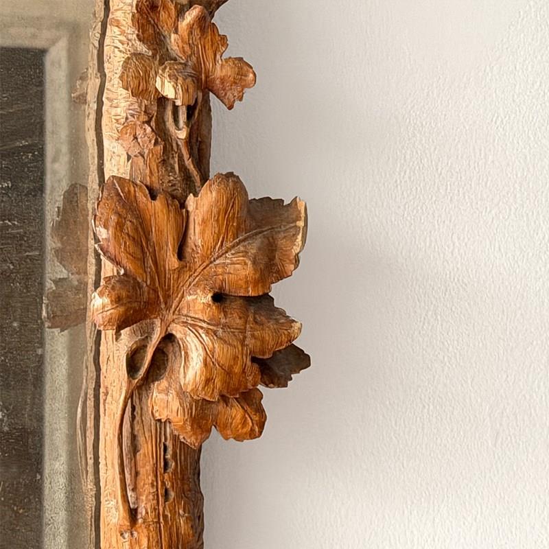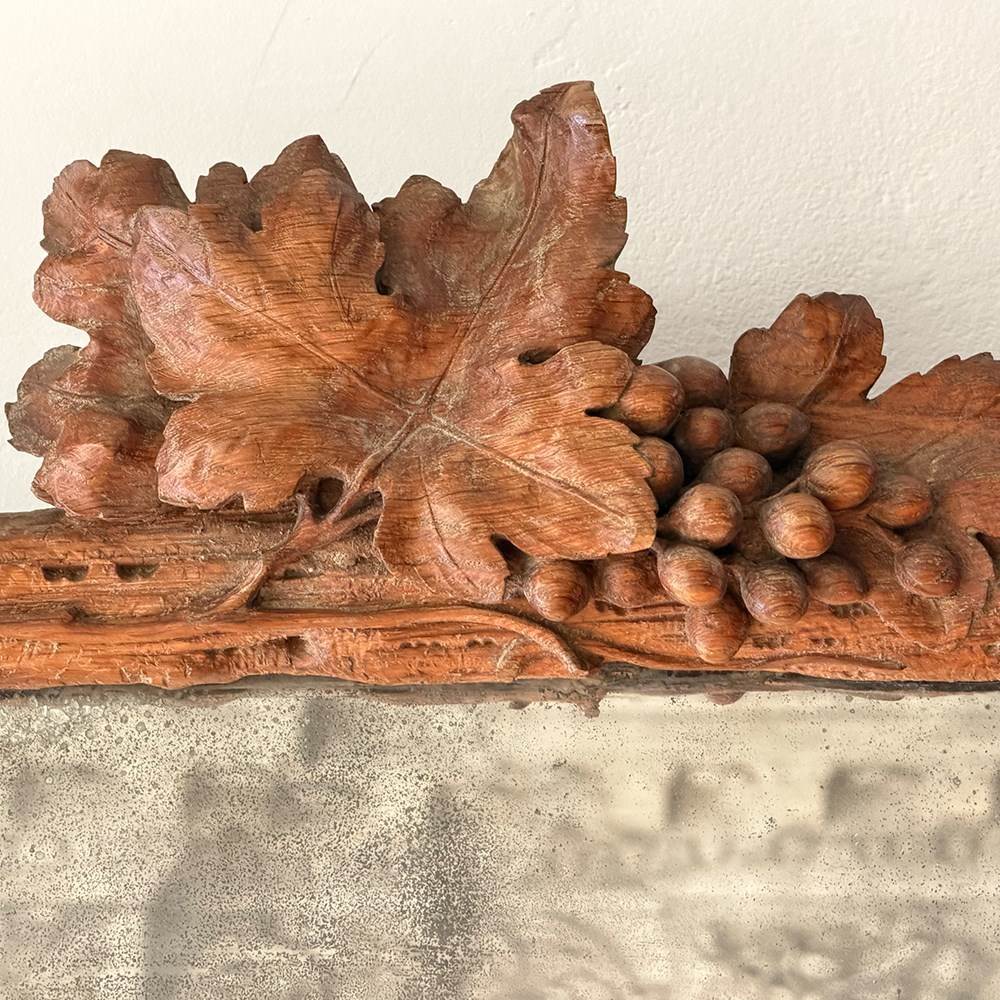A pair of antique mirrors with foxed plate and beautifully hand carved with delicate vine leaves and grapes on the textured cross frame surround.