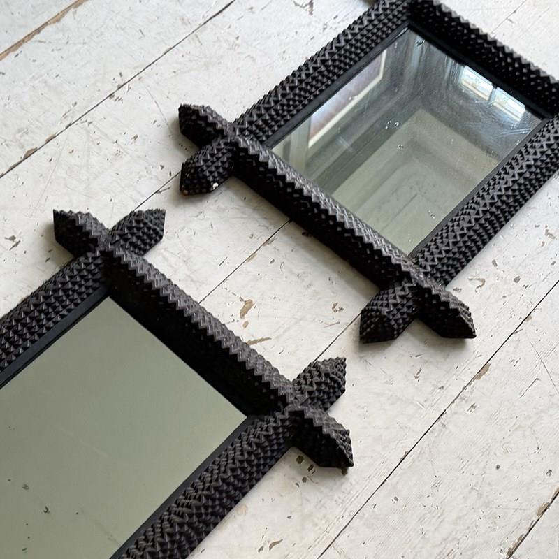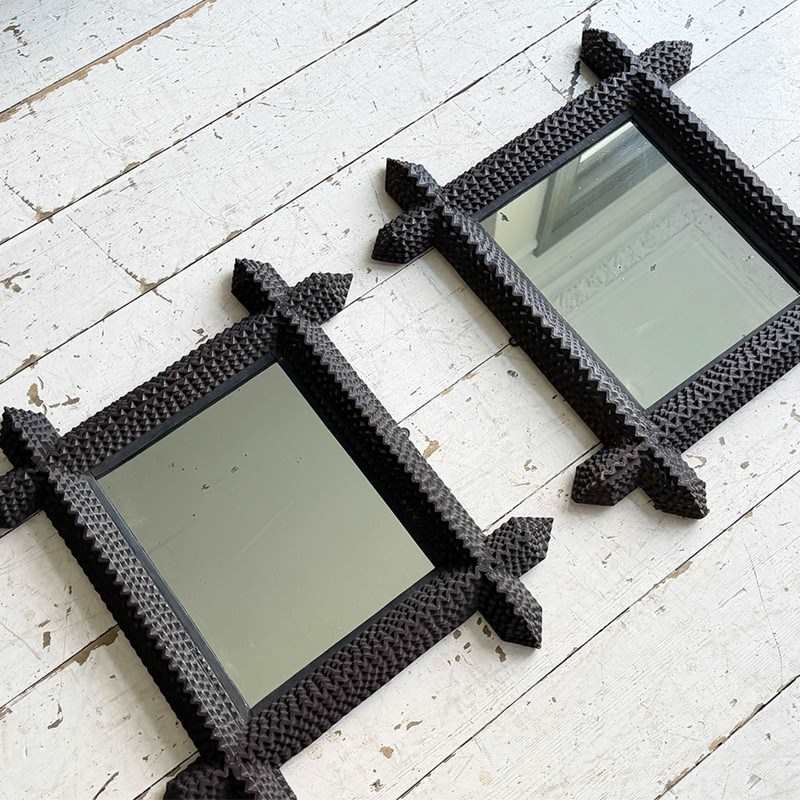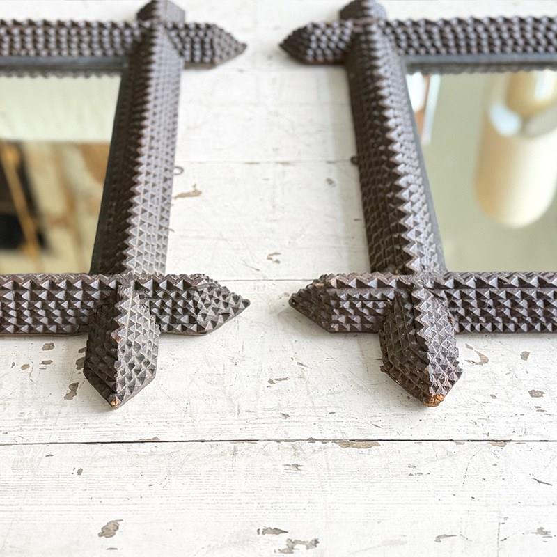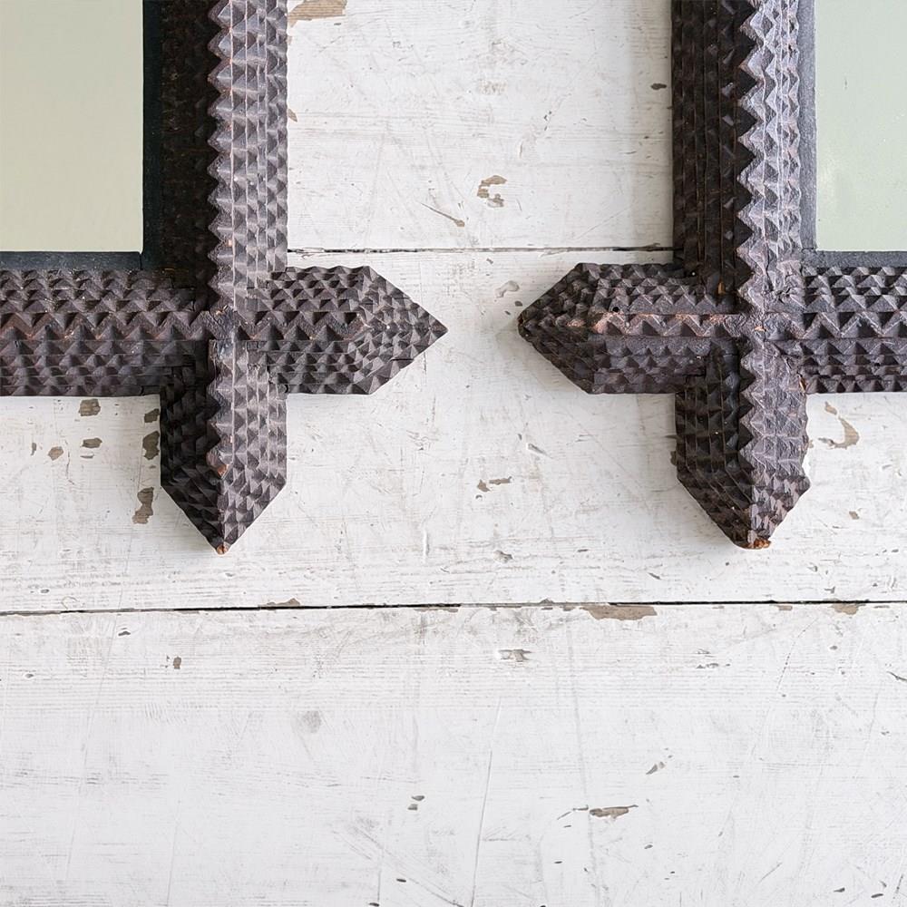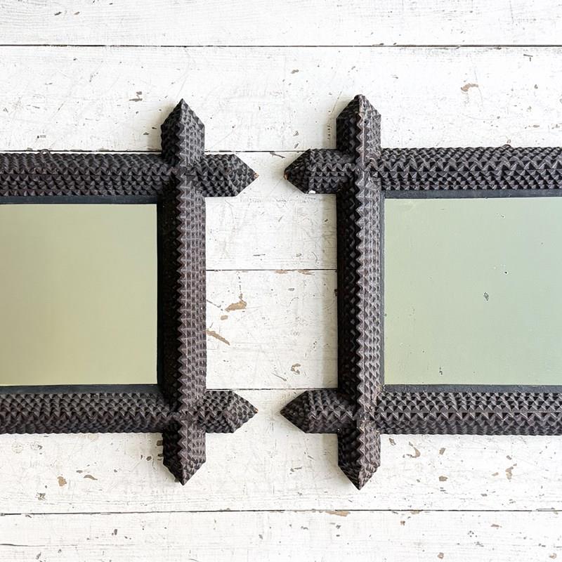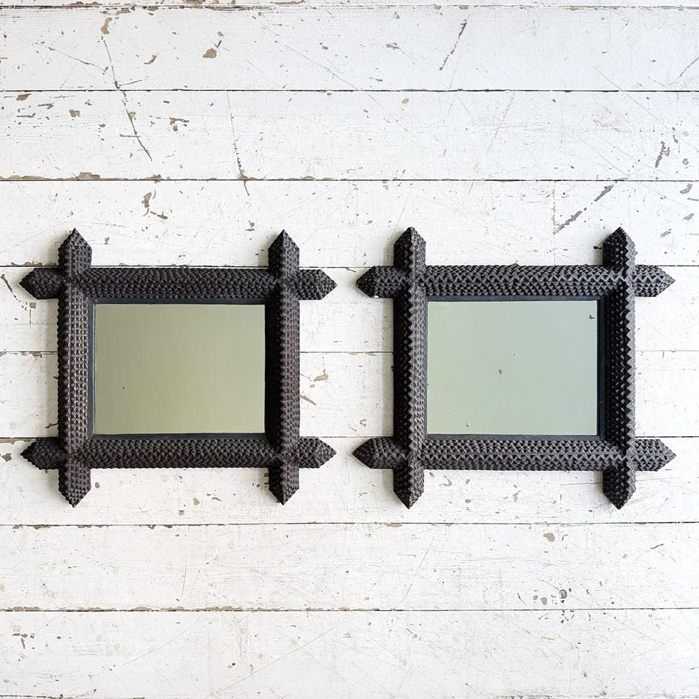A pair of antique Arts and Crafts movement mirrors with nicely foxed plates and bold, folk art three-dimensional frames. Can be hung portrait or landscape.