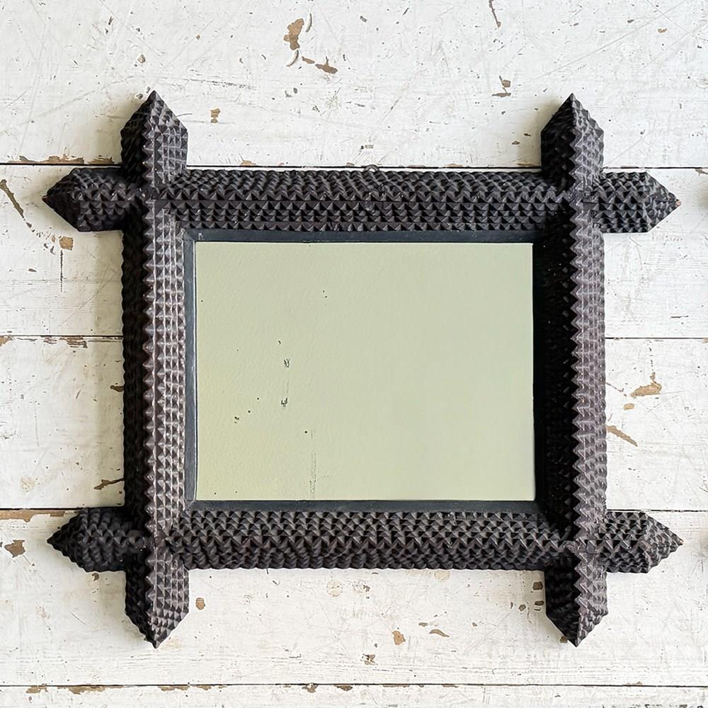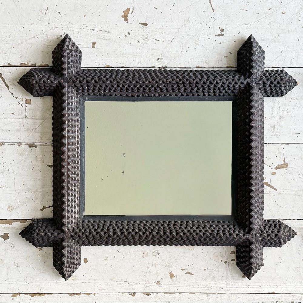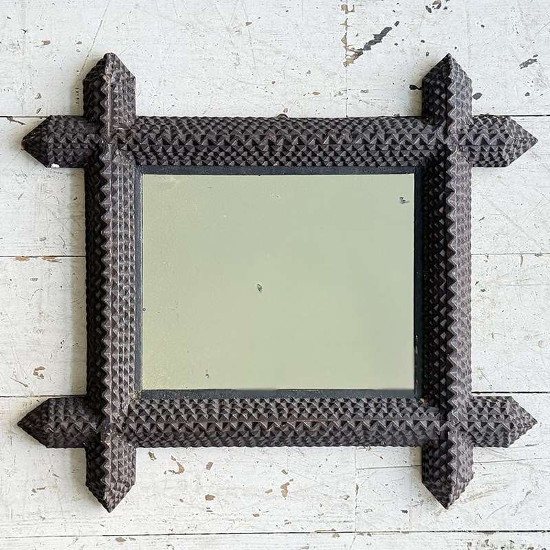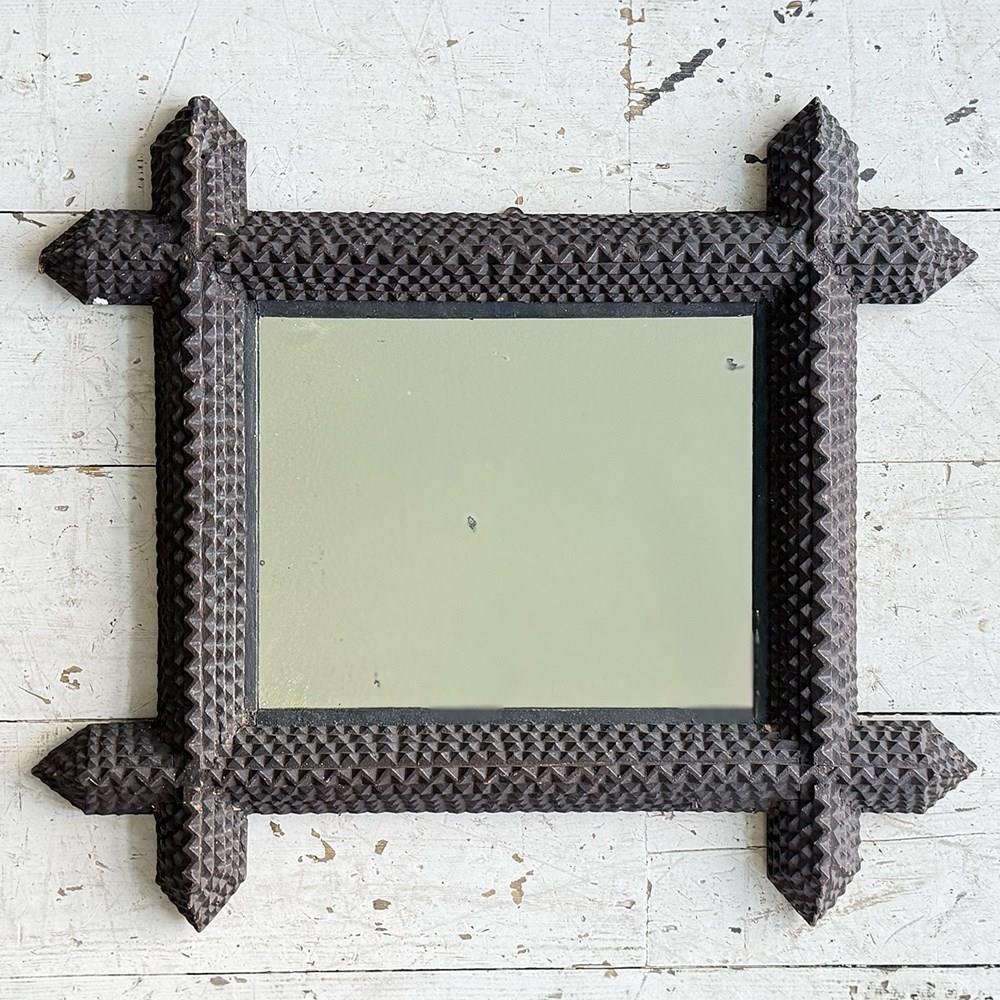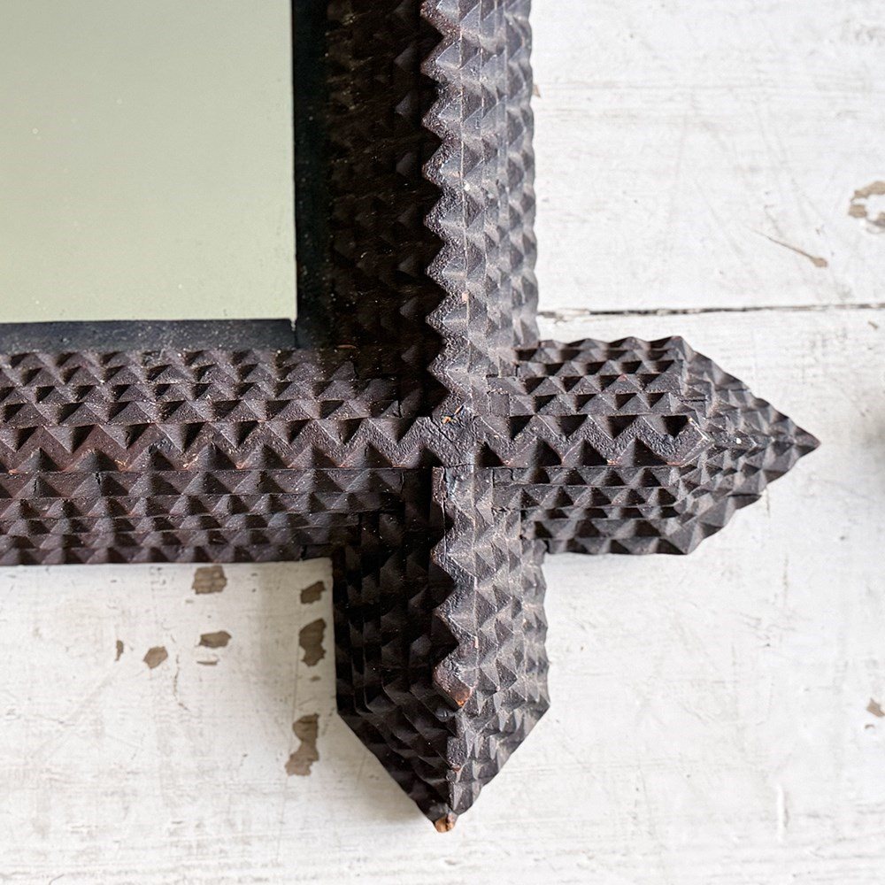 A pair of antique Arts and Crafts movement mirrors with nicely foxed plates and bold, folk art three-dimensional frames. Can be hung portrait or landscape.