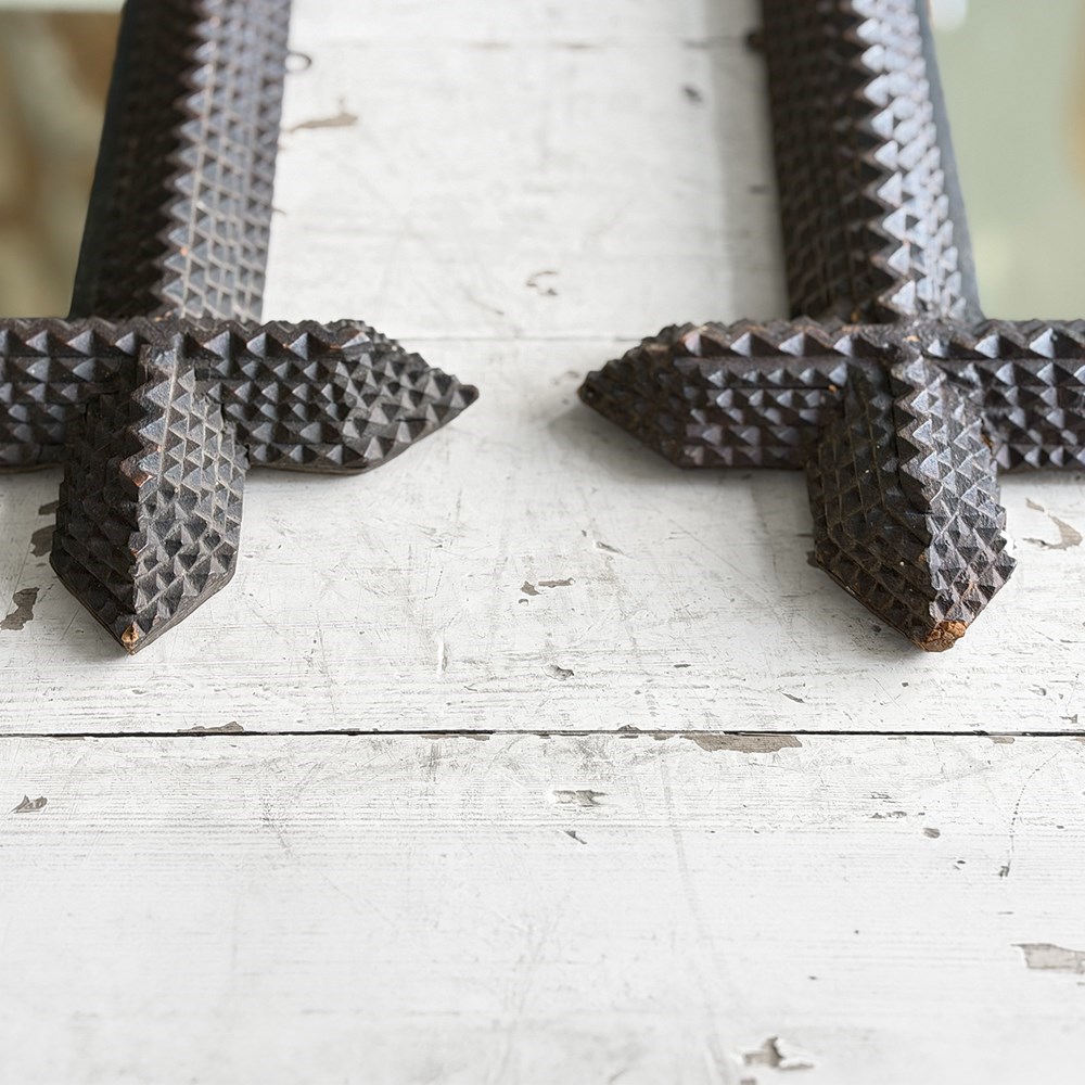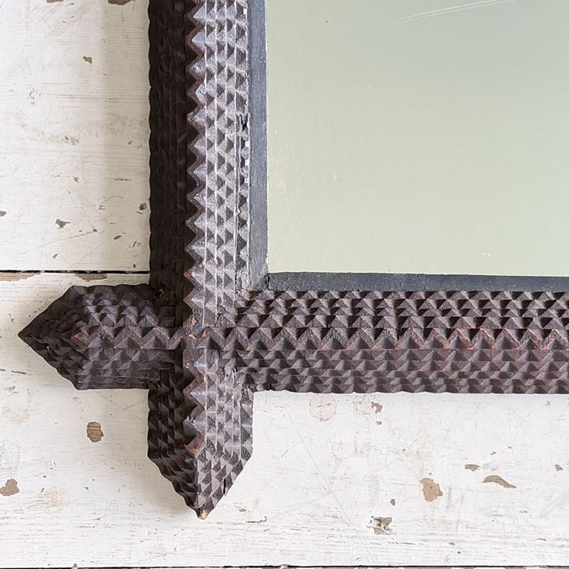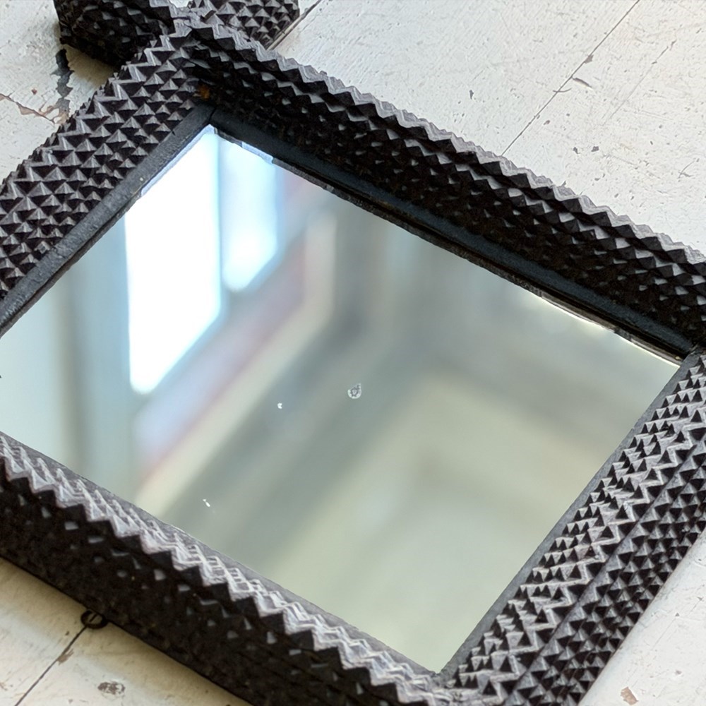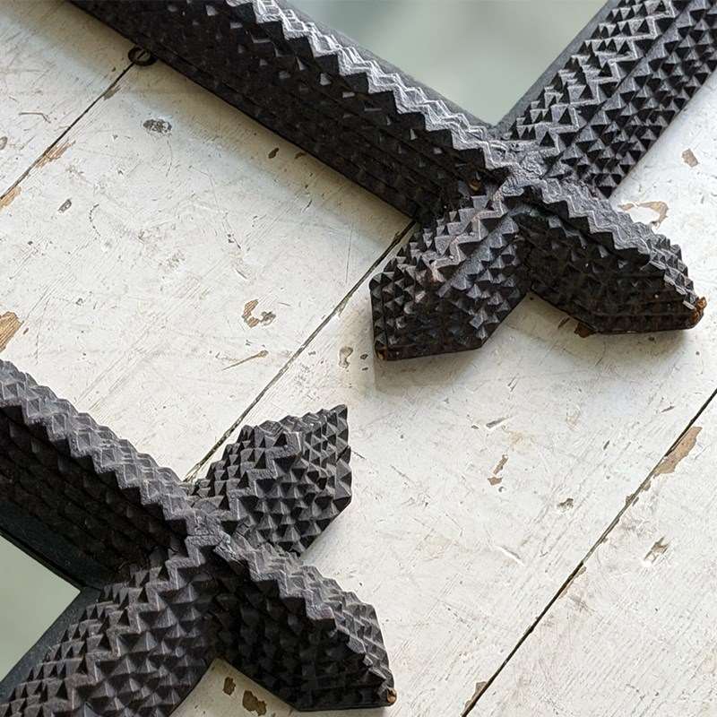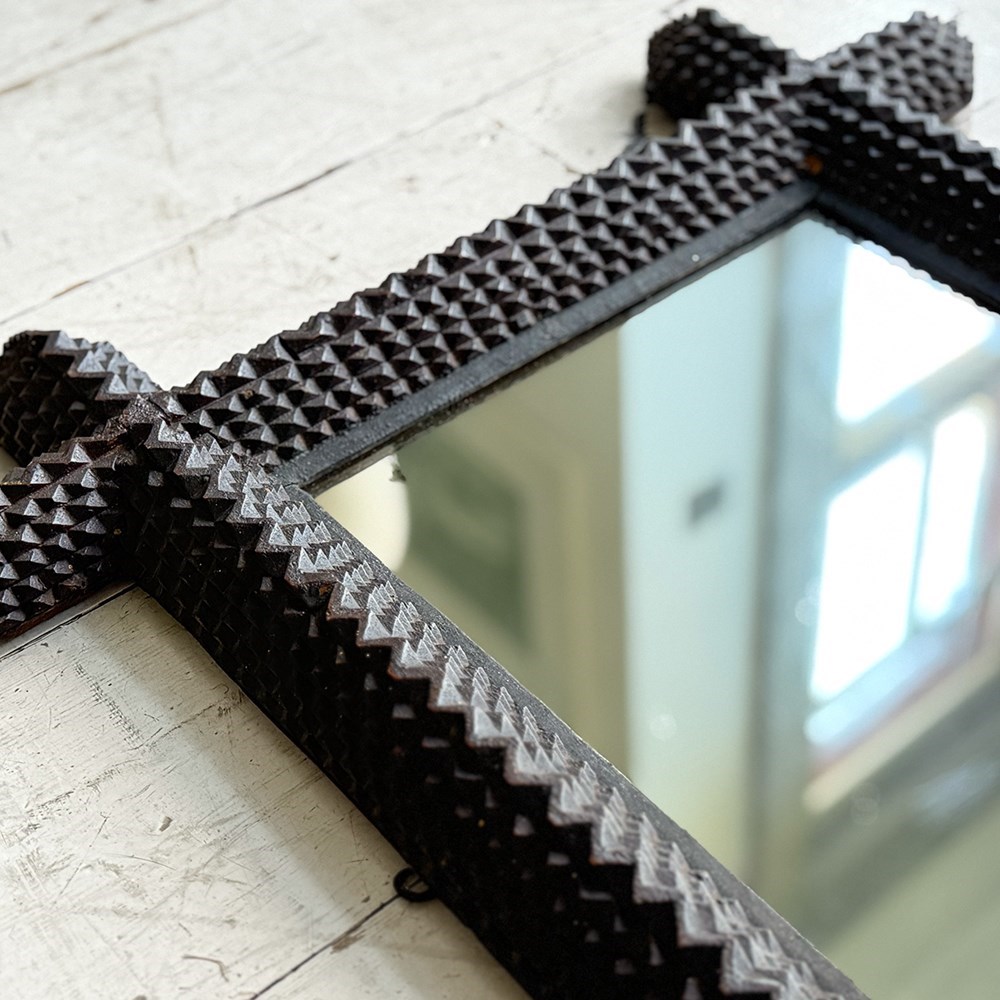 A pair of antique Arts and Crafts movement mirrors with nicely foxed plates and bold, folk art three-dimensional frames. Can be hung portrait or landscape.