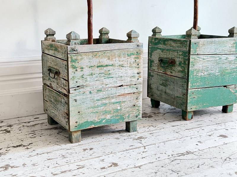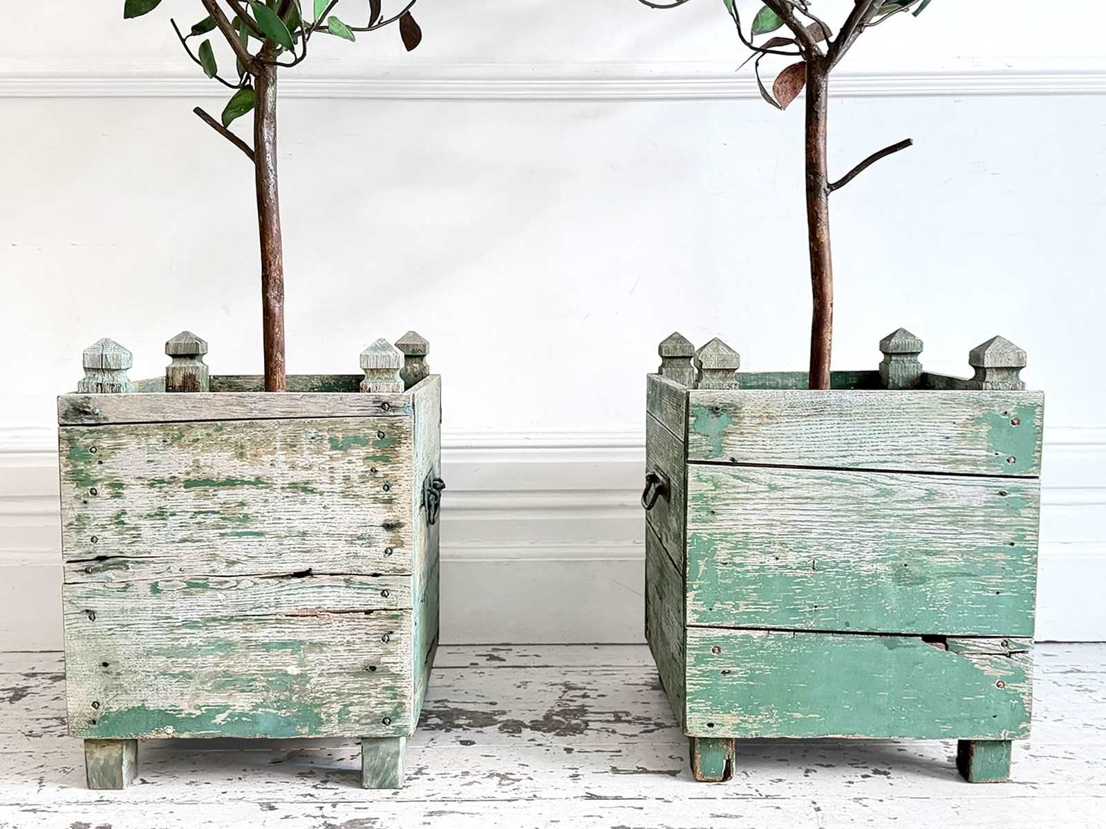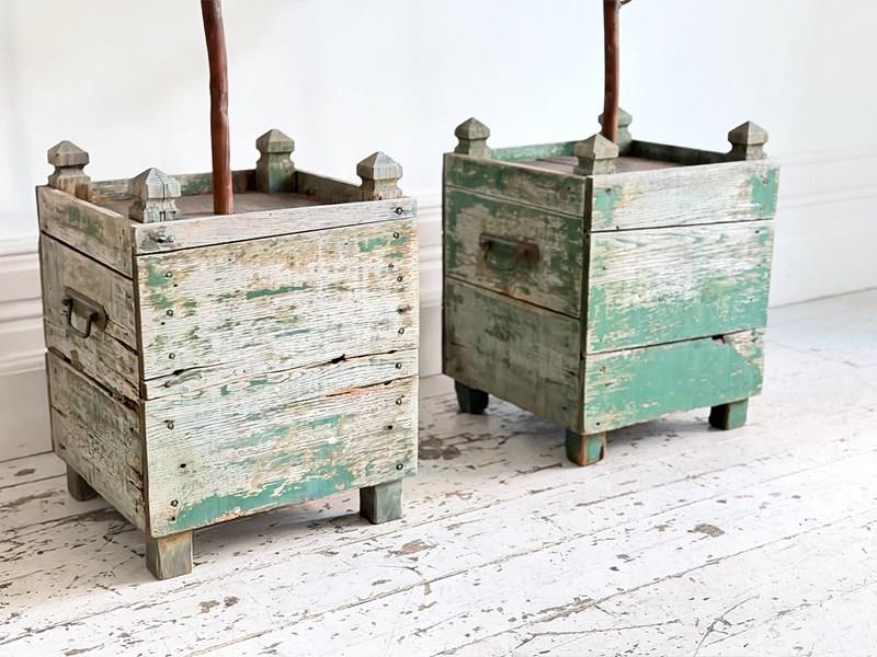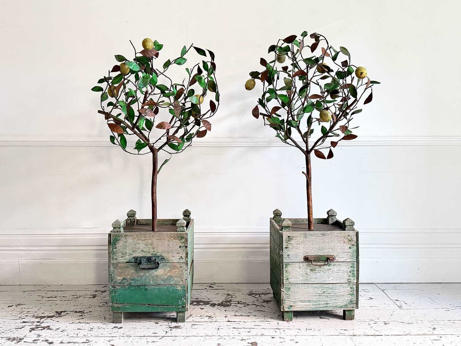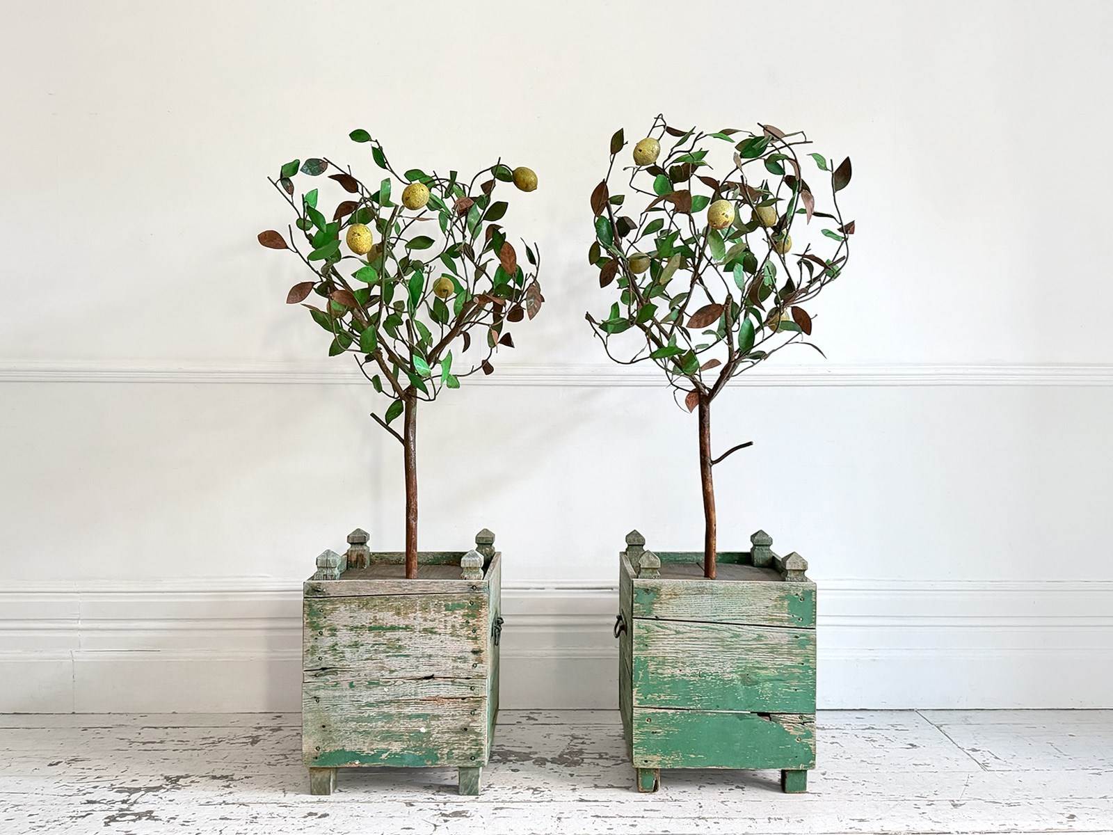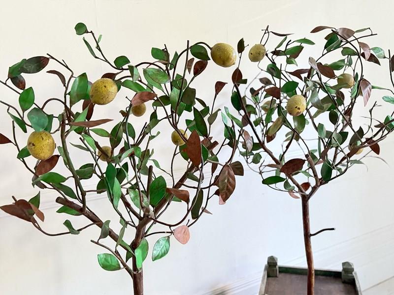 A rare pair of 5' tall polychrome metal lemon trees in painted wooden planters. Beautifully shaped on long stems and profusely covered with green metal leaves and vibrant yellow lemons. The metal work has nice patina with some leaves showing the aged metal beneath to great effect. It is unusual to find examples of these trees on this scale and with such nice original wooden planters with remnants of original paint.