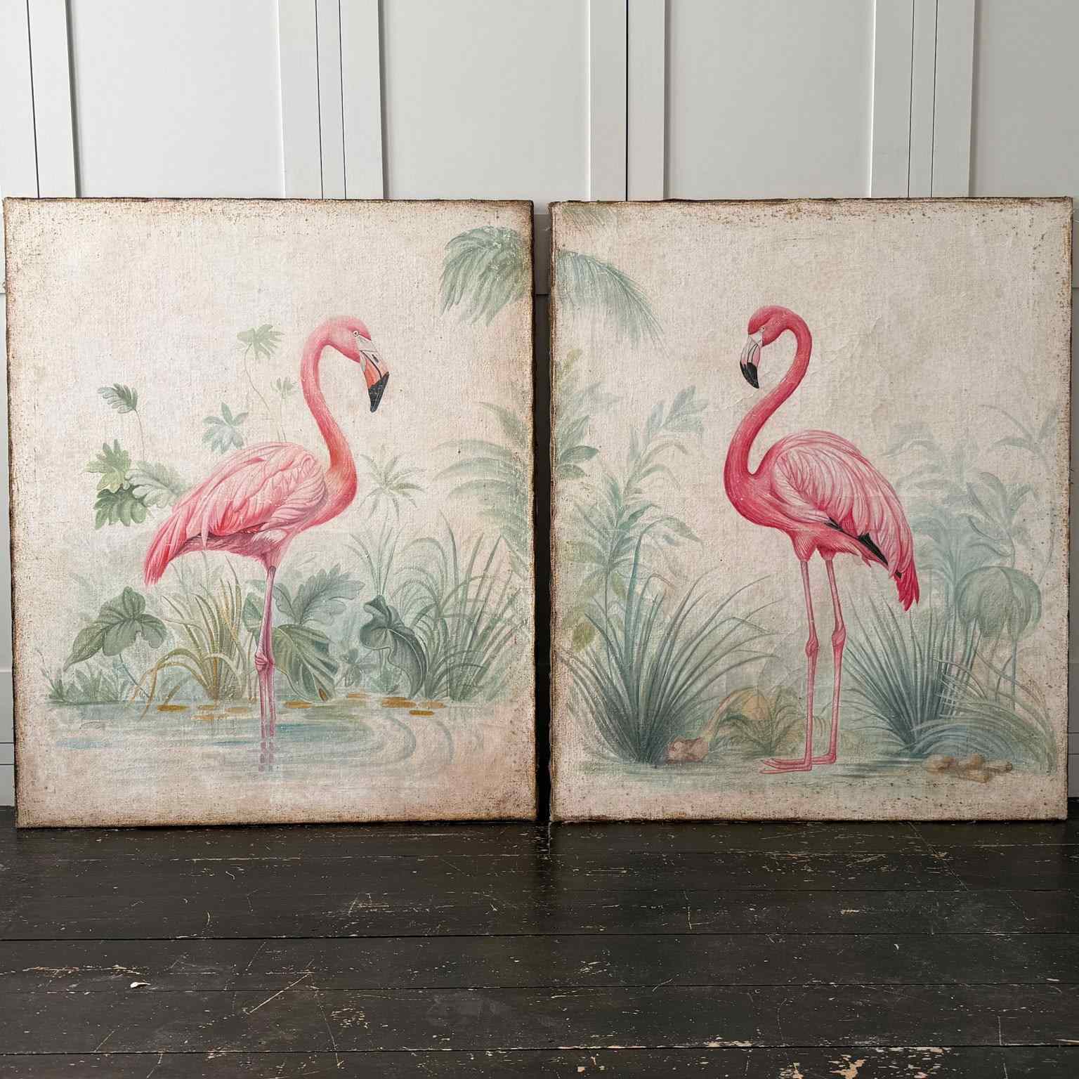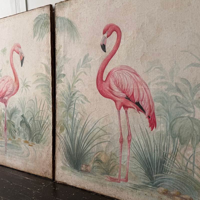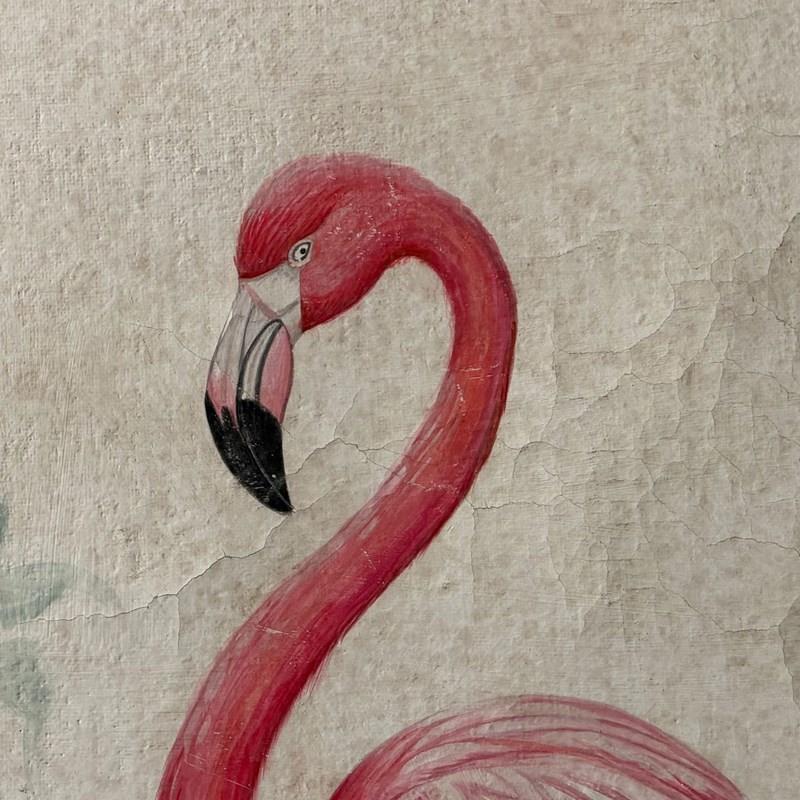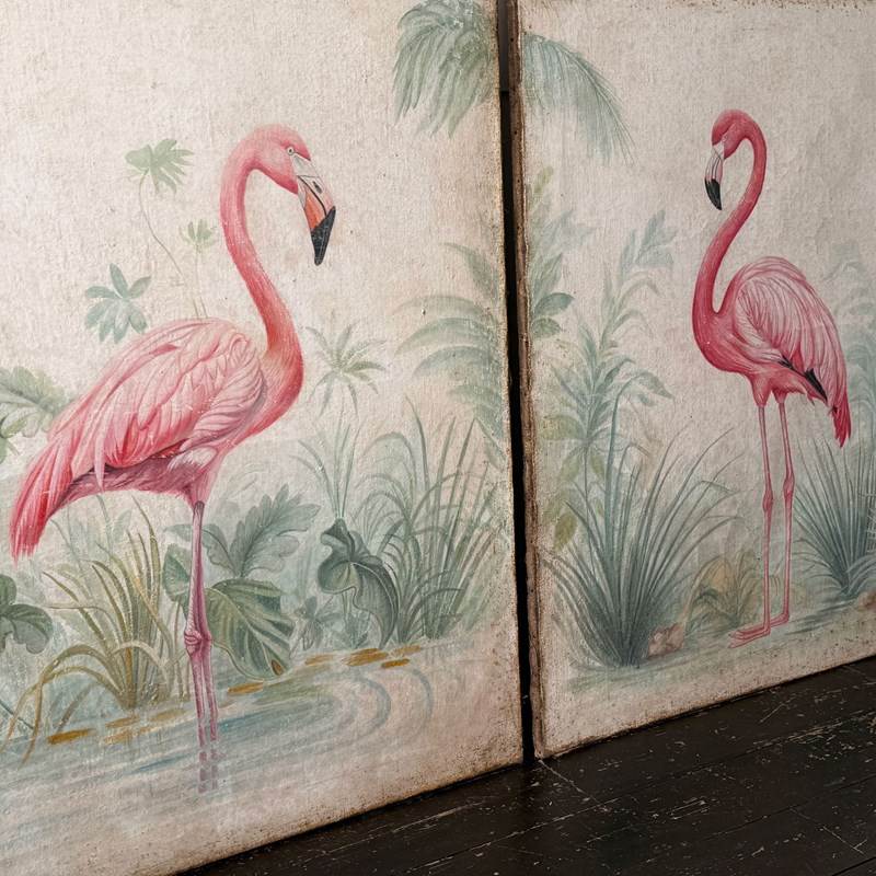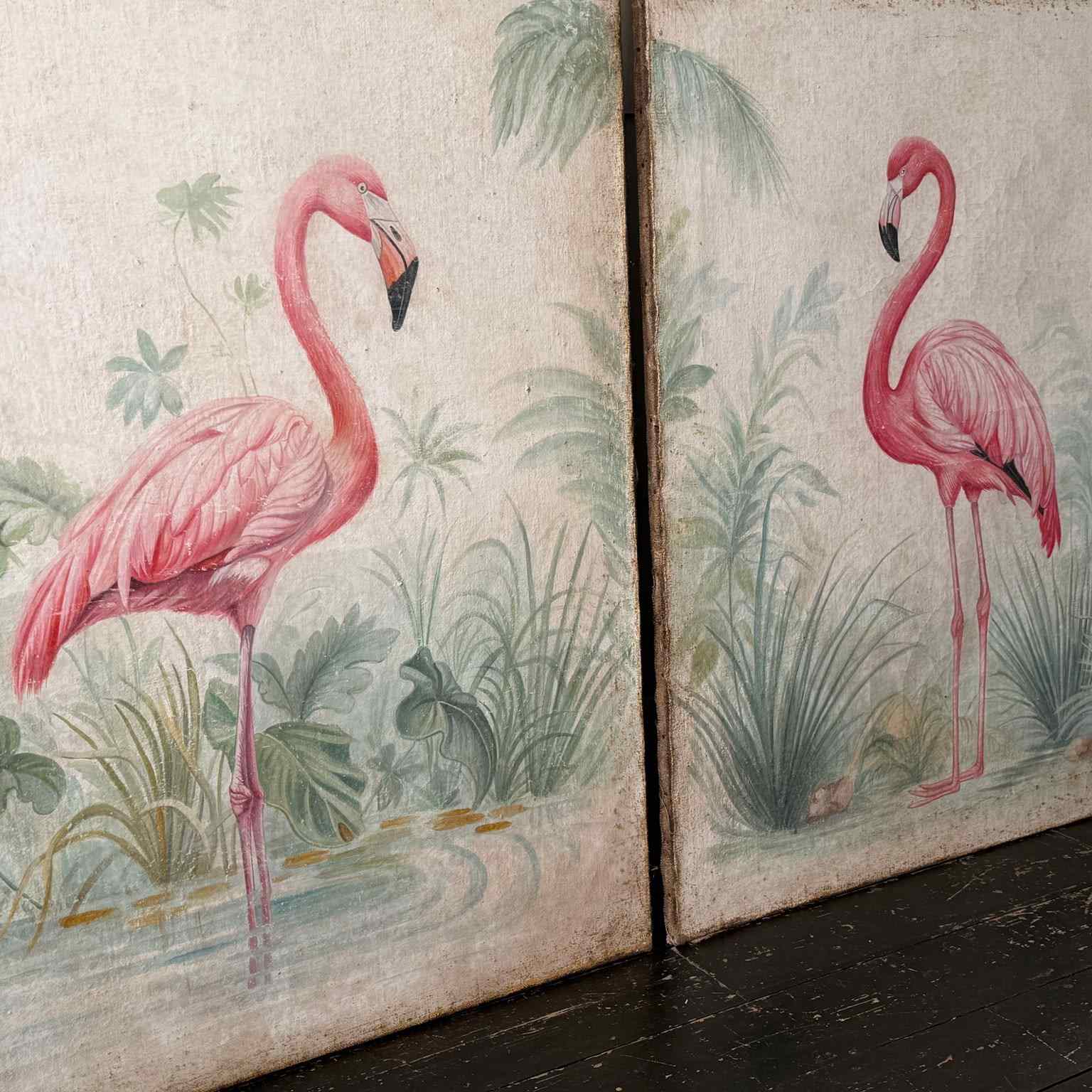 A Pair Of Large Italian Oil On Gesso Flamingo Paintings