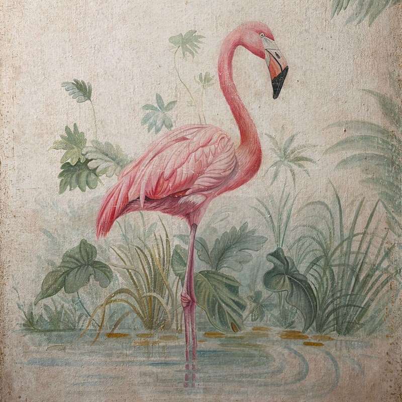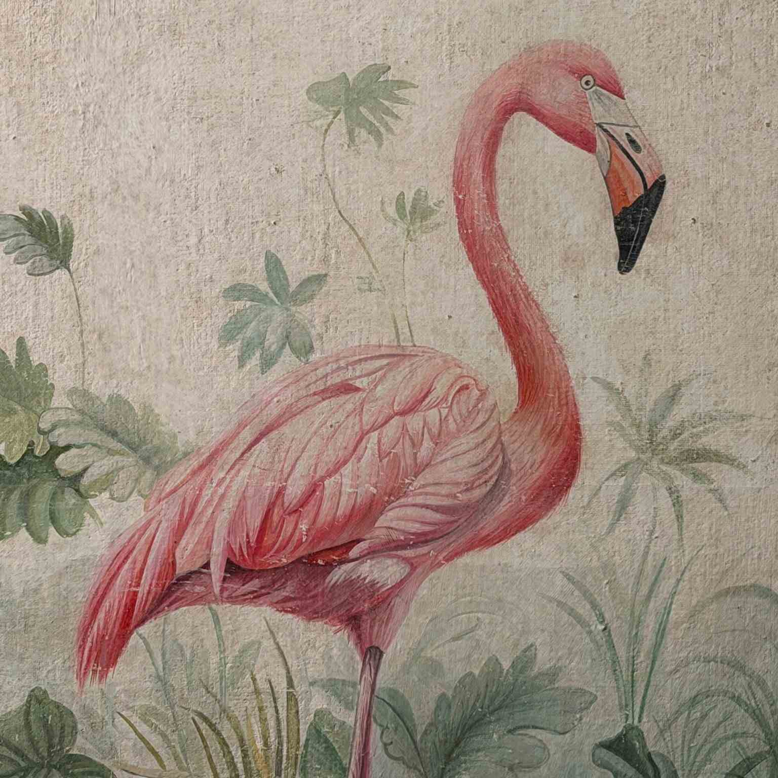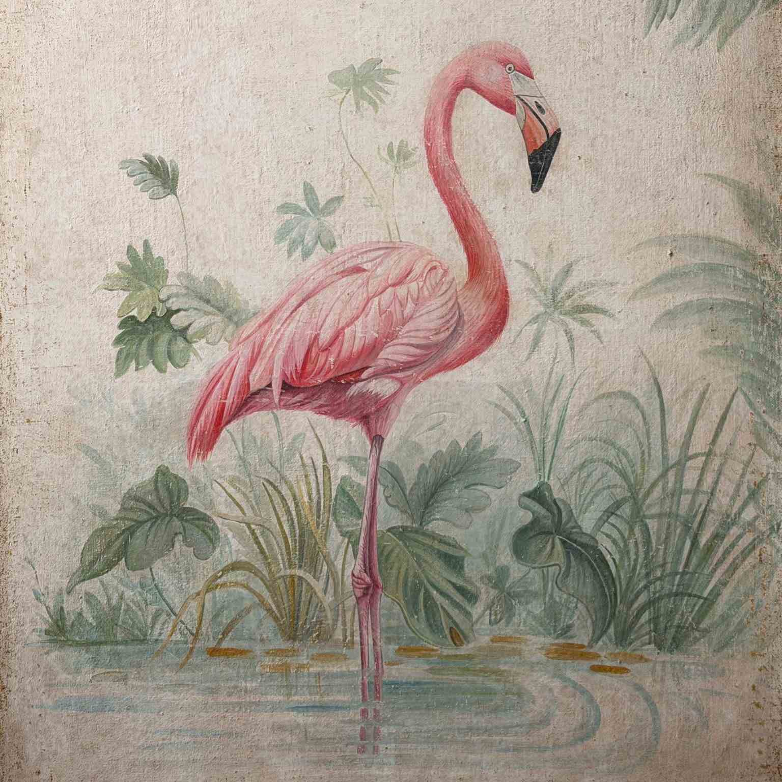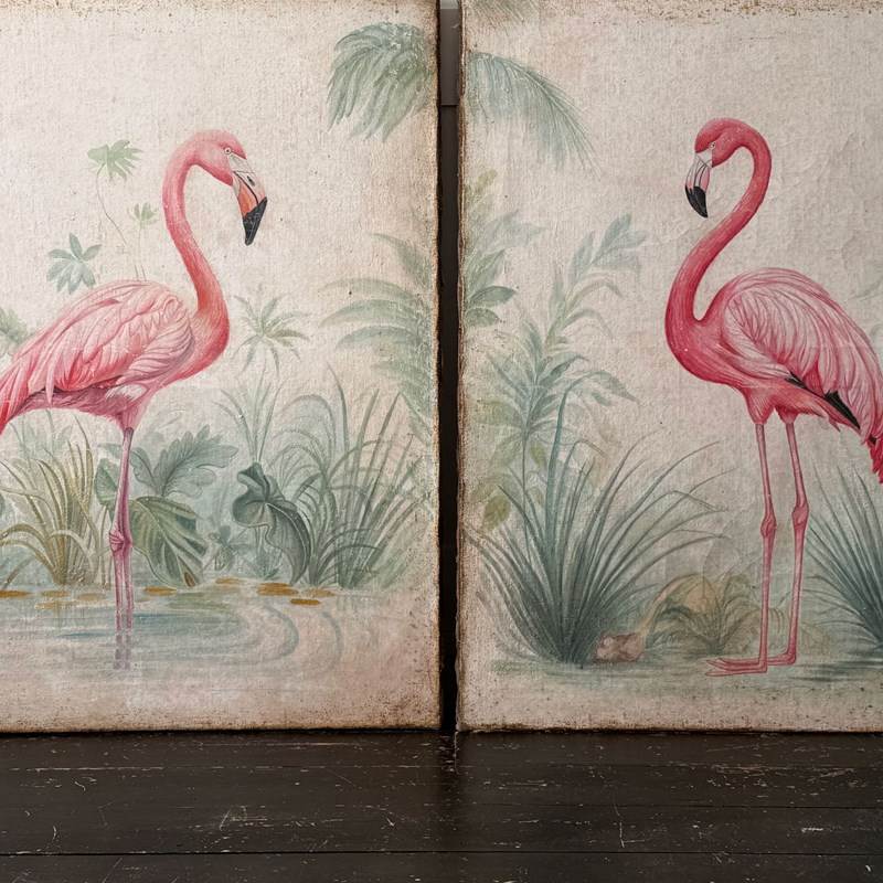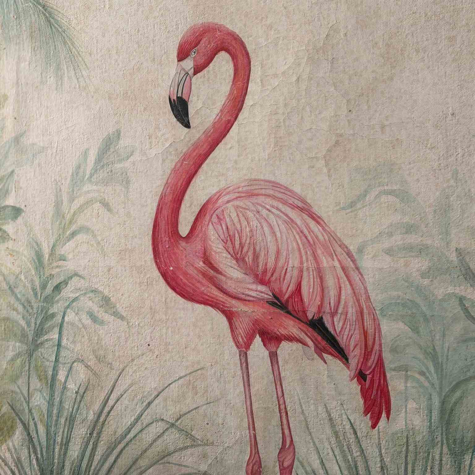 A Pair Of Large Italian Oil On Gesso Flamingo Paintings