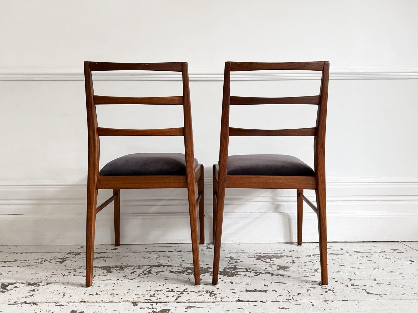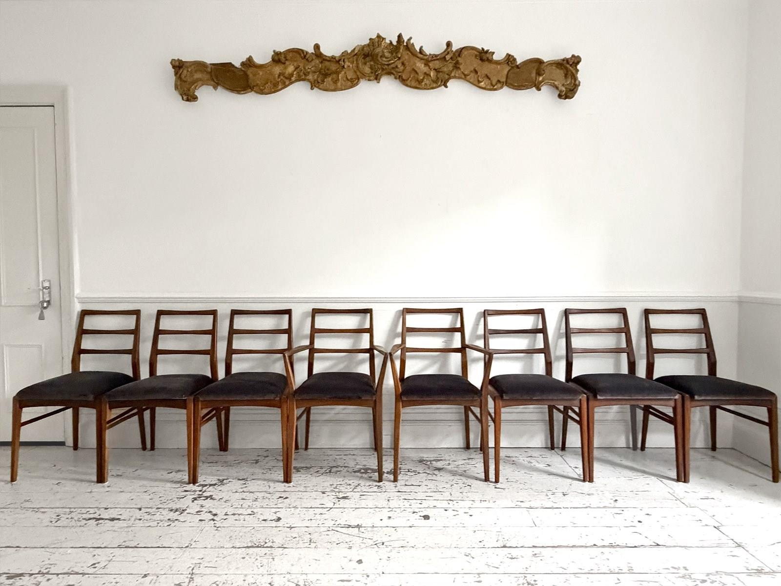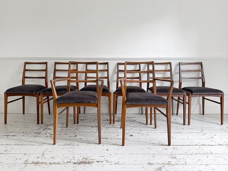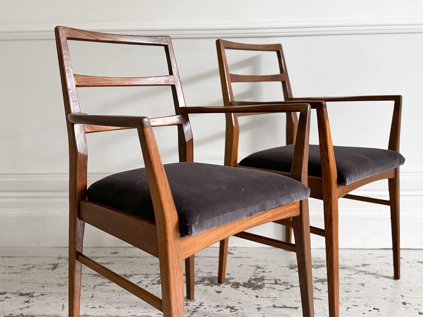 A set of eight dining chairs comprising six singles and two carvers. Designed by Richard Hornby for British manufacturer Fyne Ladye Furniture in 1961 and sold through high end shops such as Heals. Simple and elegant in design, with warm teak frames and newly upholstered with Romo velvet in 'Espresso'.