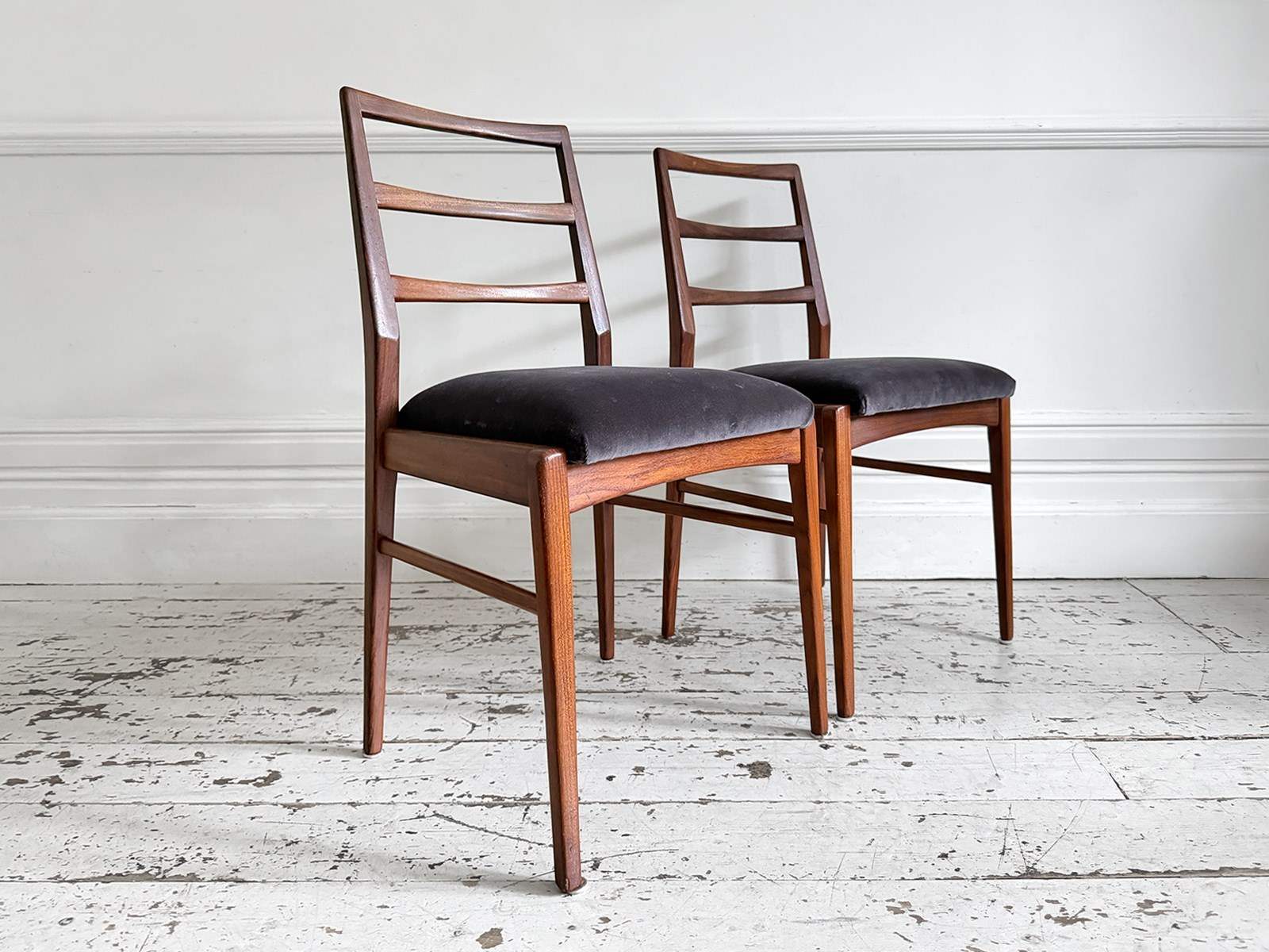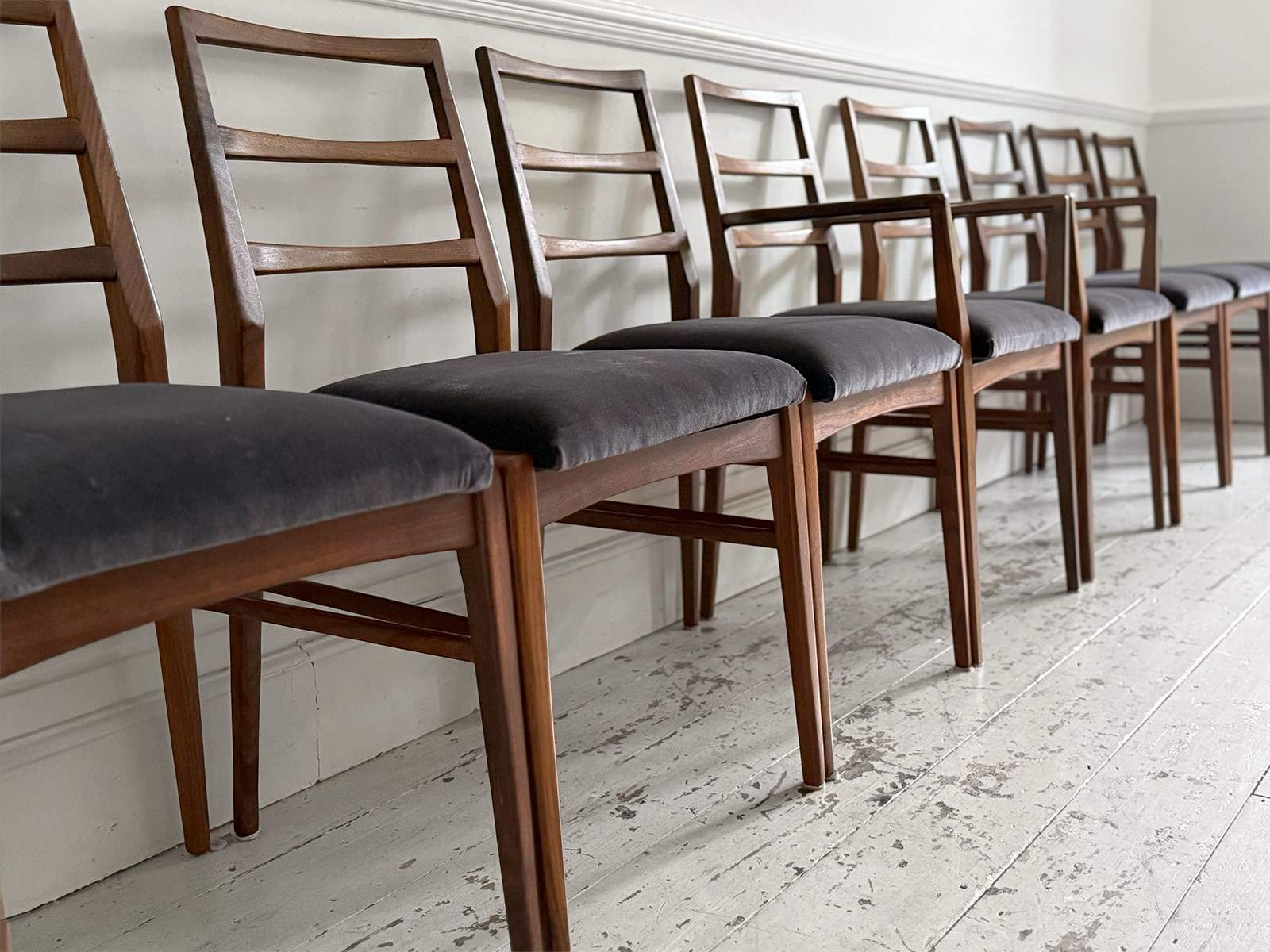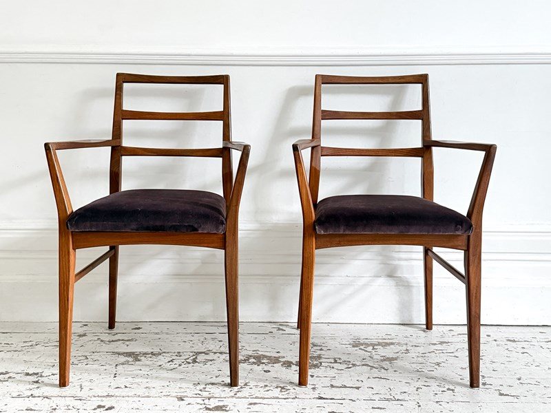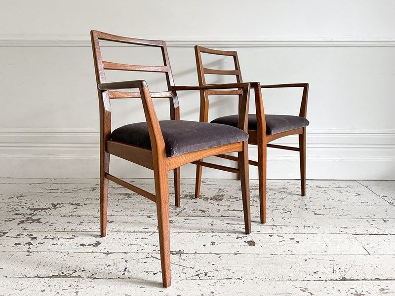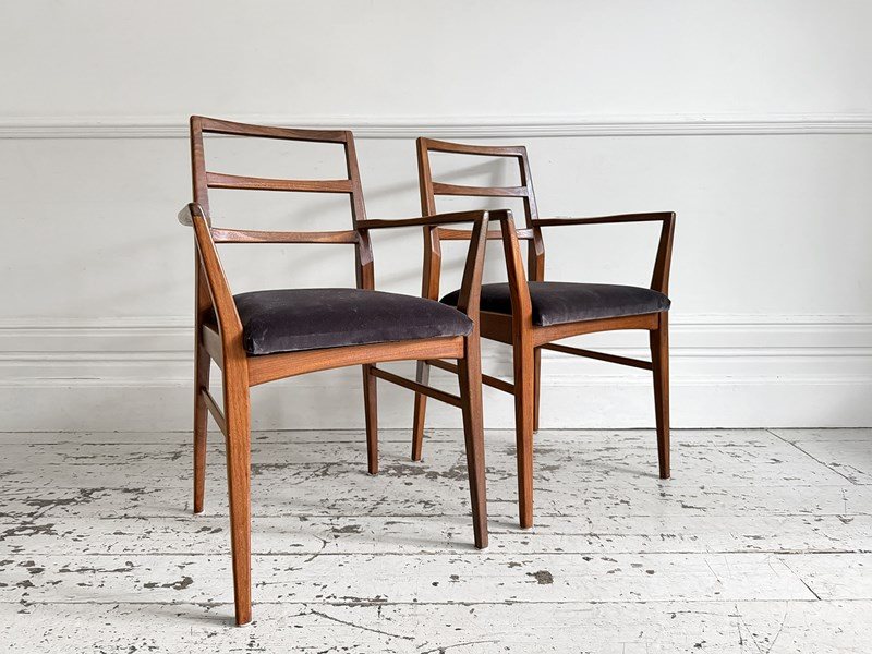 A set of eight dining chairs comprising six singles and two carvers. Designed by Richard Hornby for British manufacturer Fyne Ladye Furniture in 1961 and sold through high end shops such as Heals. Simple and elegant in design, with warm teak frames and newly upholstered with Romo velvet in 'Espresso'.