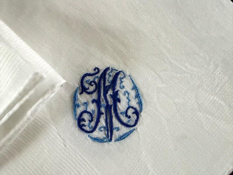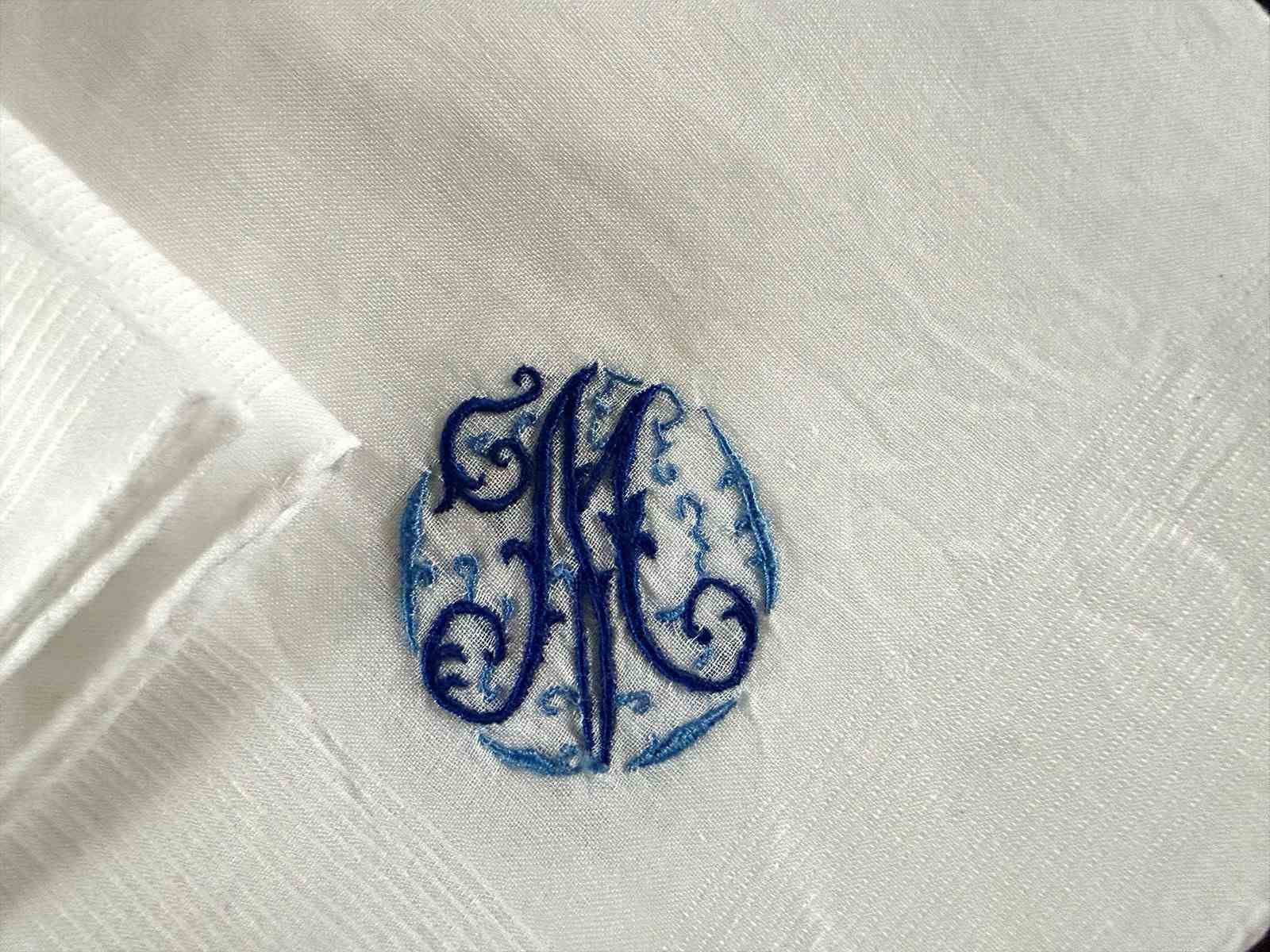 Two sets of four antique French hand embroidered cotton handkerchiefs all with the initial 'M' embroidered in one corner. We have one blue set and one brown set (the red is now sold).