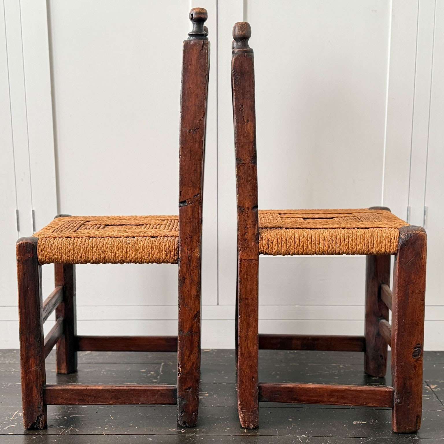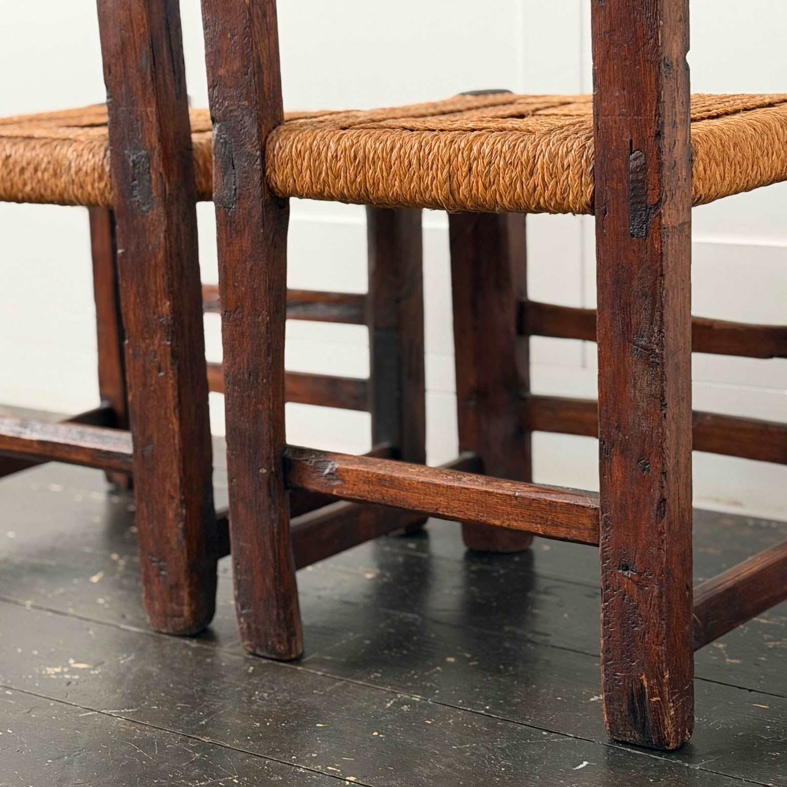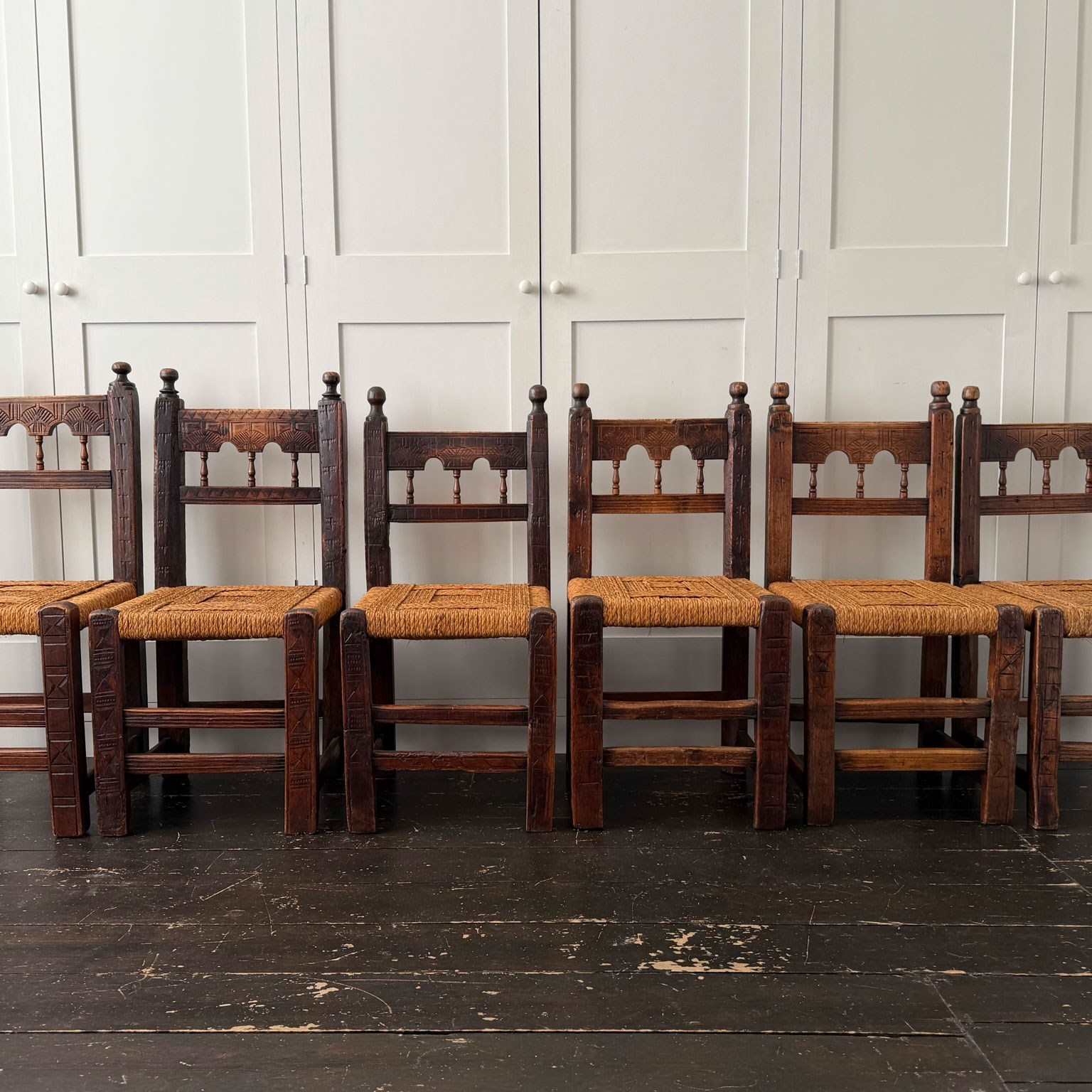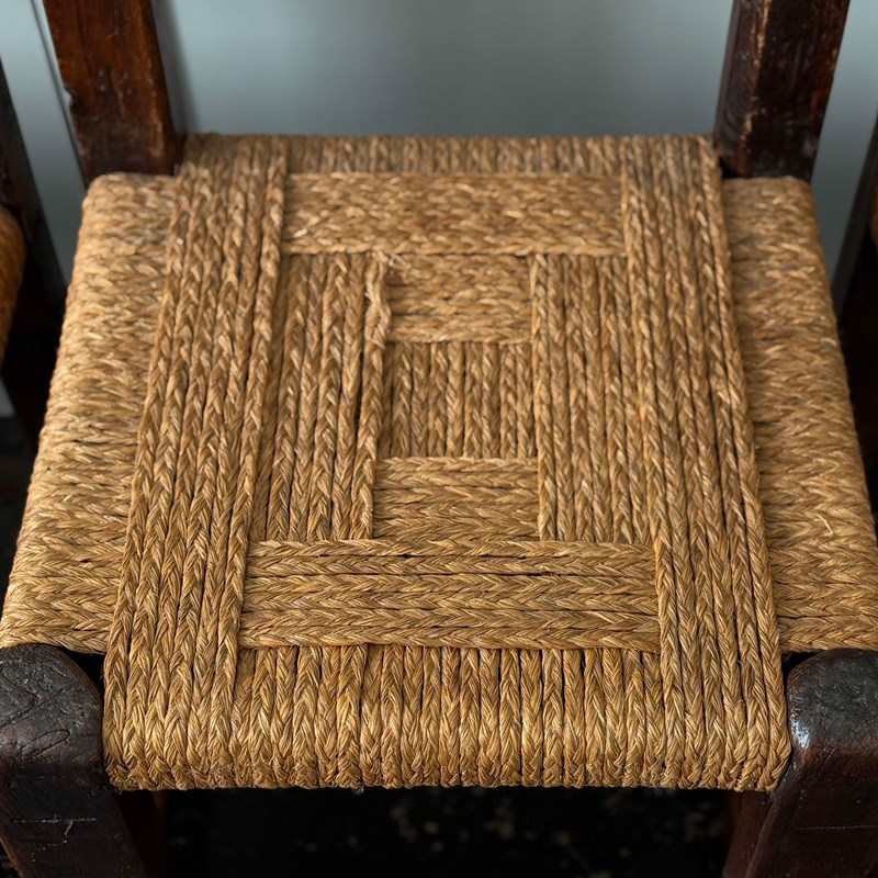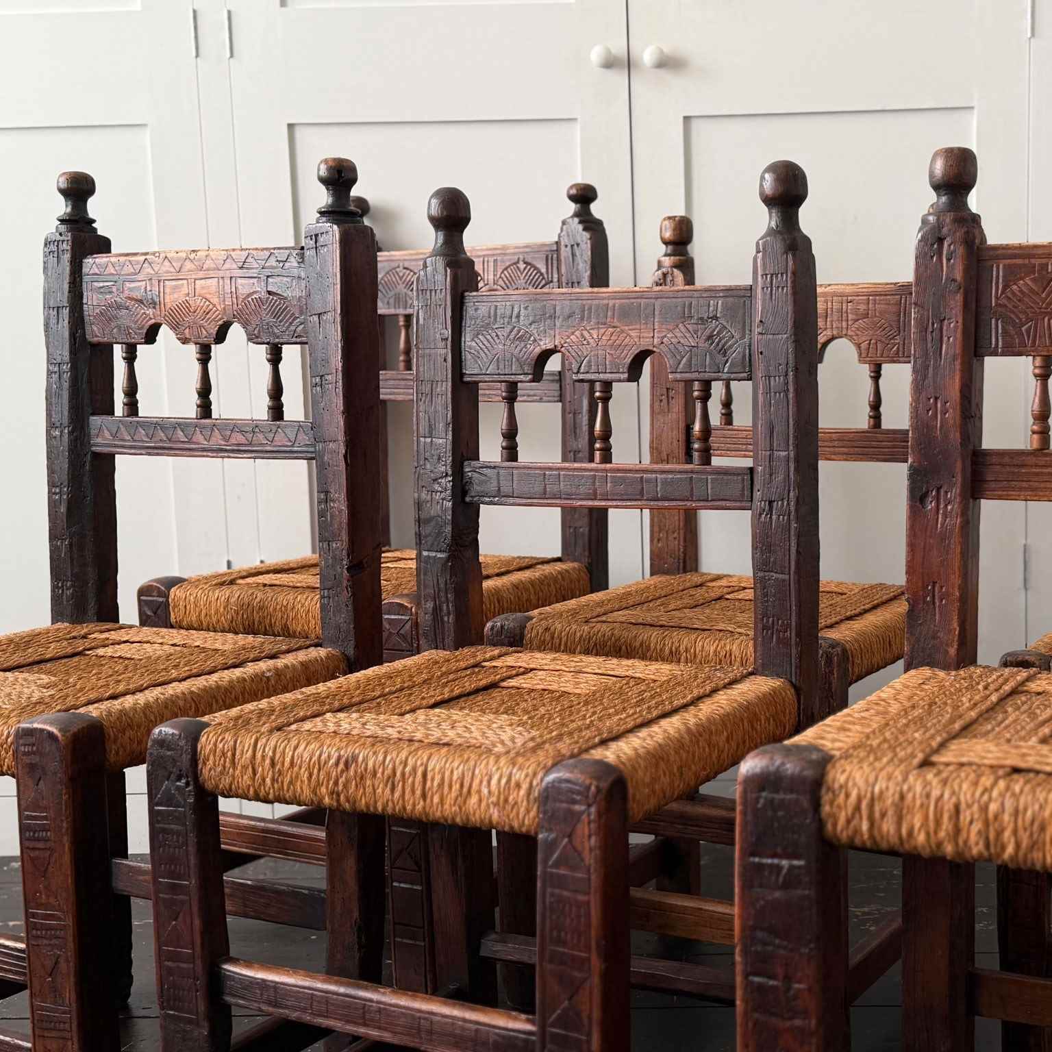 A charming set of 19th century folk art dining chairs from the South-West of France. Each one with it's own unique qualities, with woven rope seats and hand-carving to fronts and back rests. Please note that these are hand crafted and as such they are all slightly different sizes, we feel this only adds to their charm.