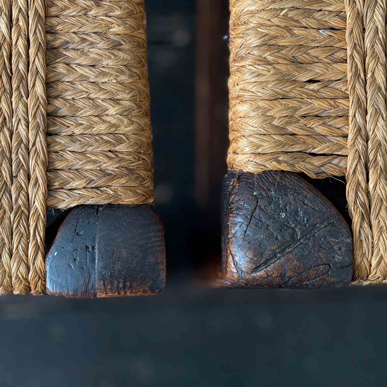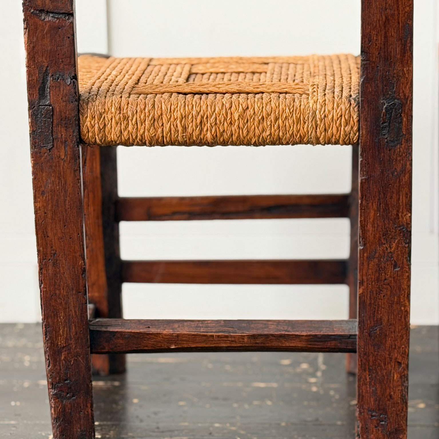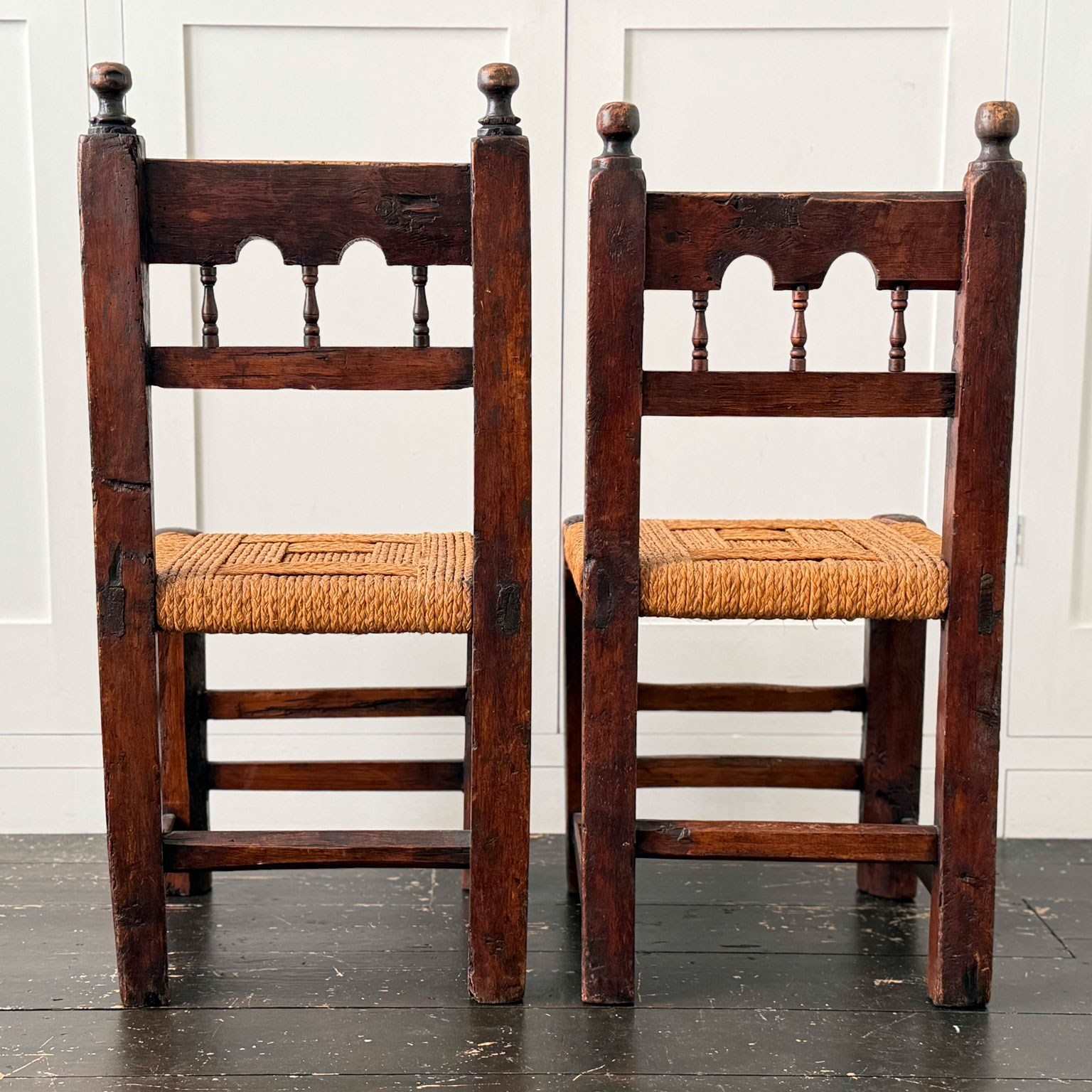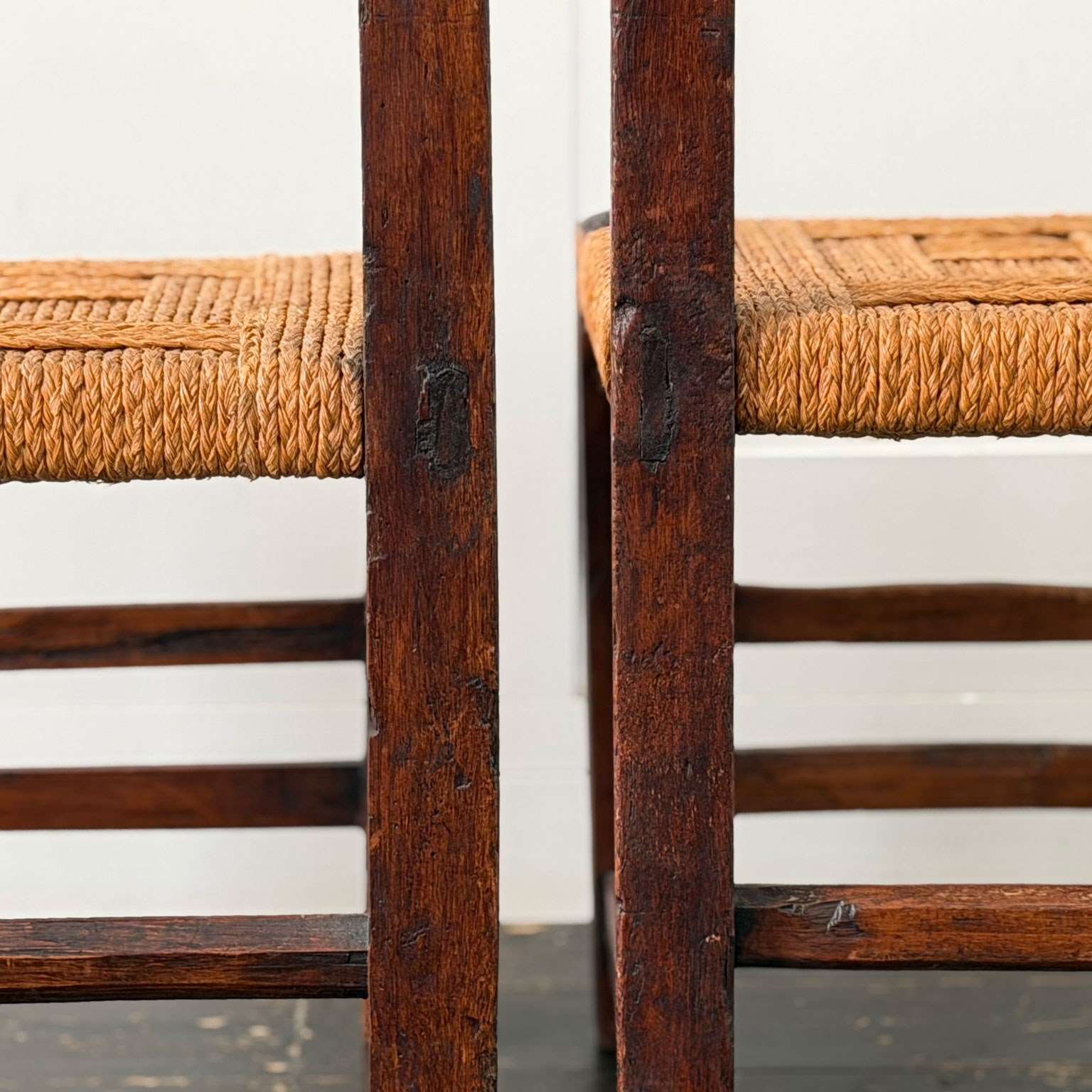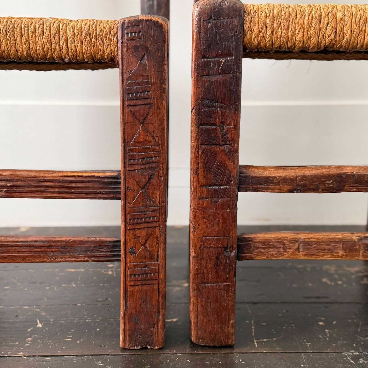A charming set of 19th century folk art dining chairs from the South-West of France. Each one with it's own unique qualities, with woven rope seats and hand-carving to fronts and back rests. Please note that these are hand crafted and as such they are all slightly different sizes, we feel this only adds to their charm.