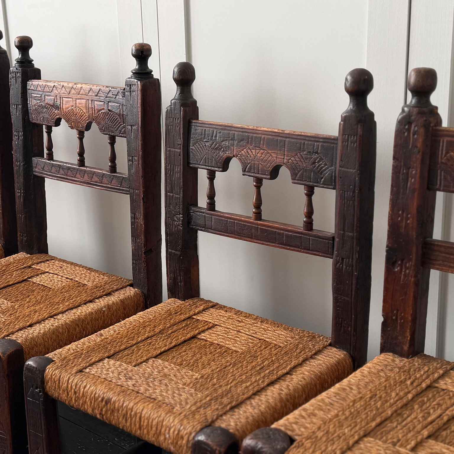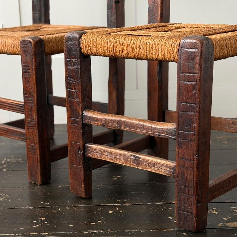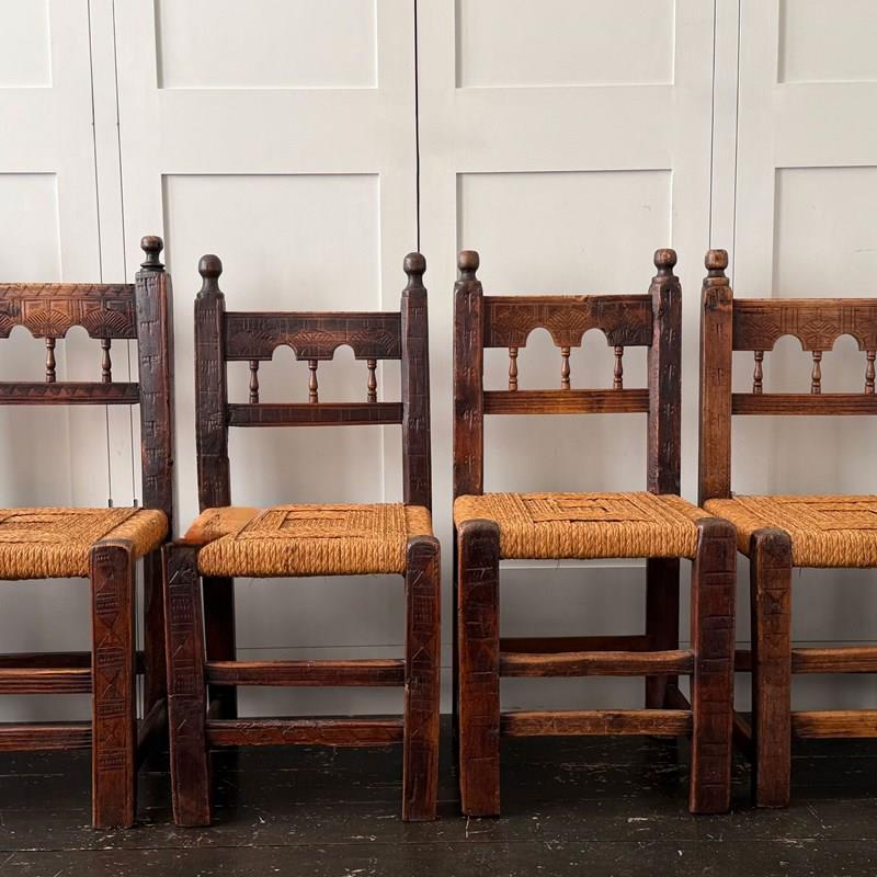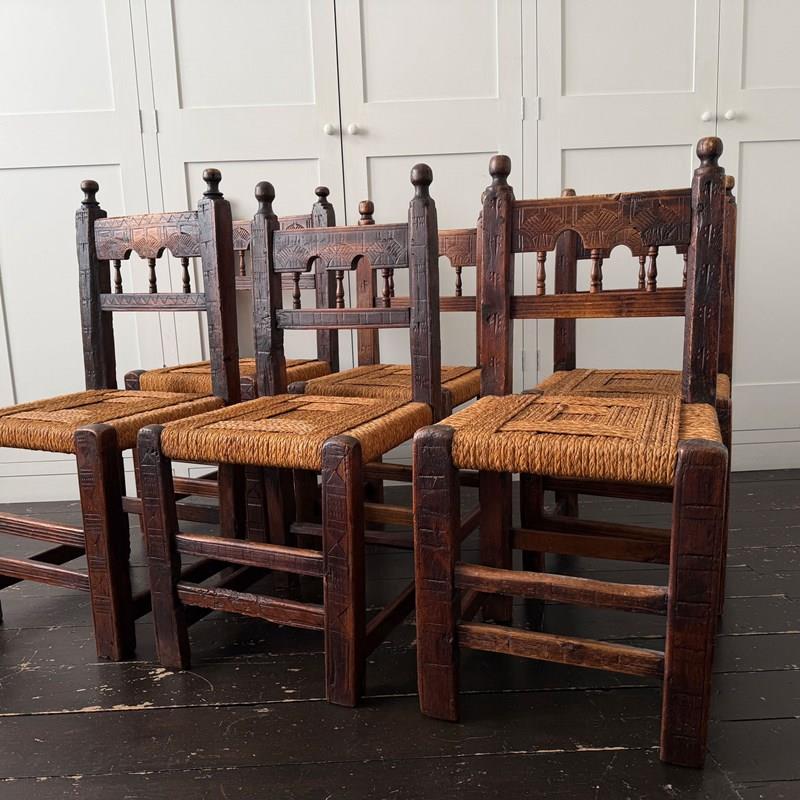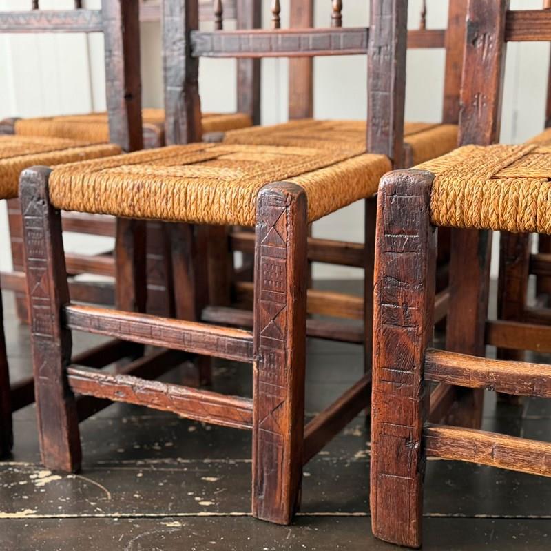 A Set Of Six Antique Carved Folk Art Pyrenean Chairs With Woven Seats