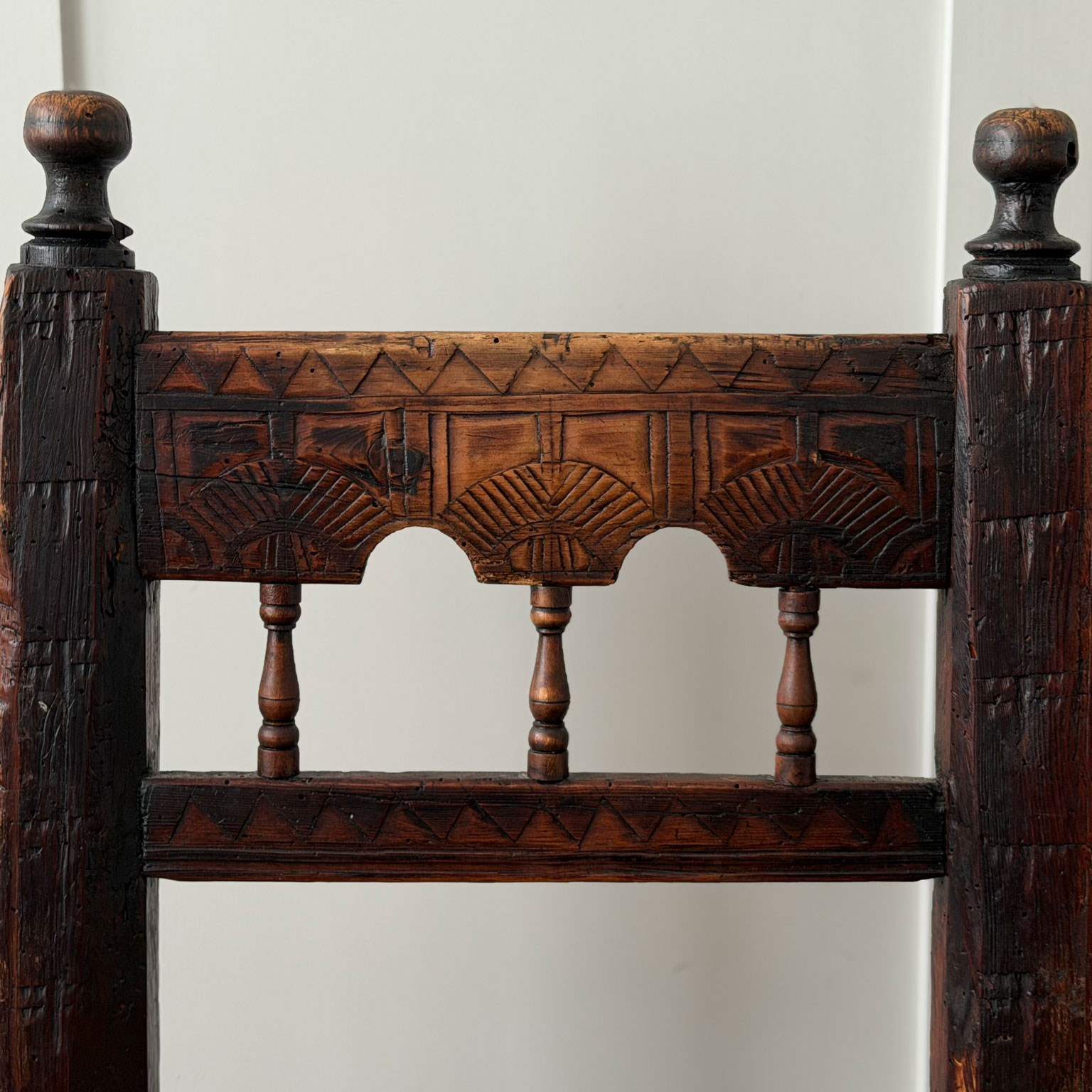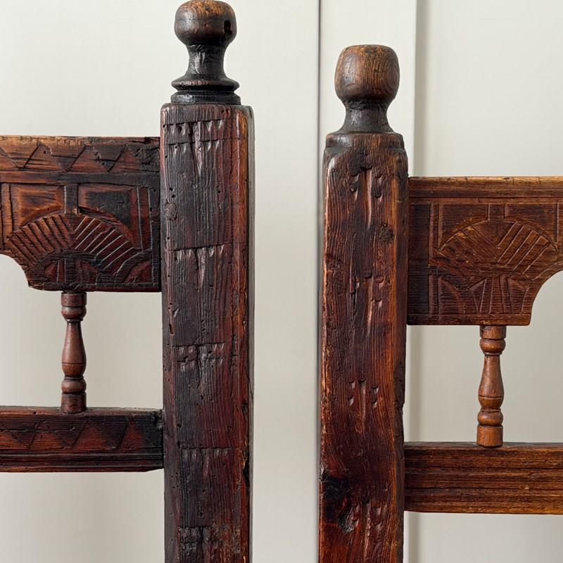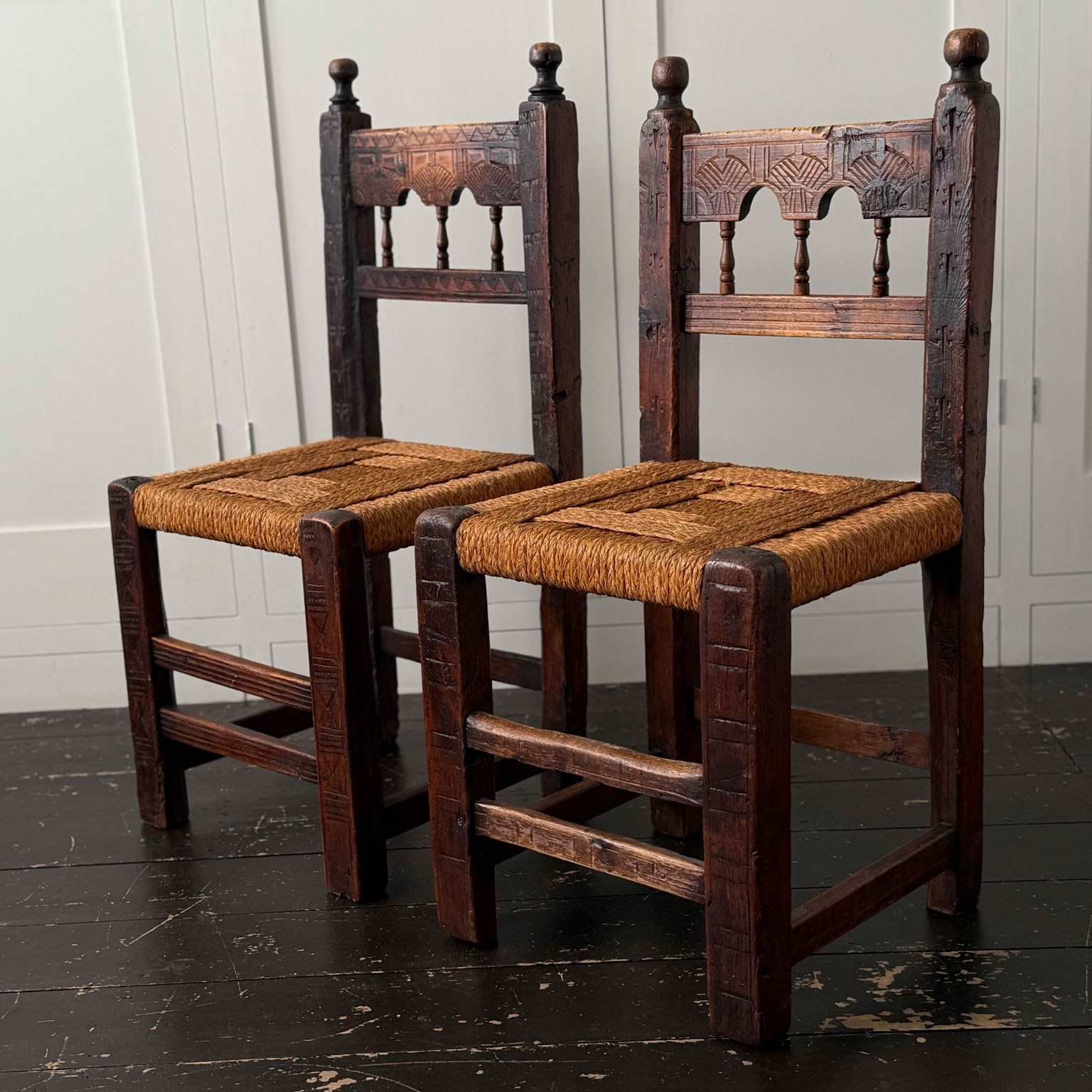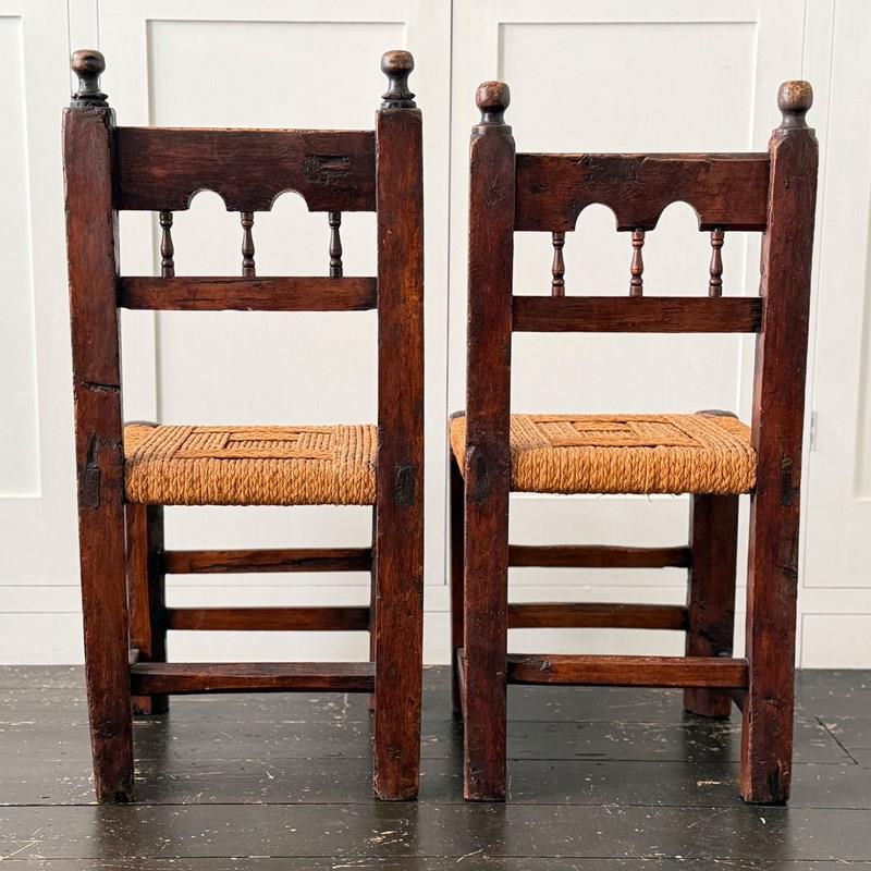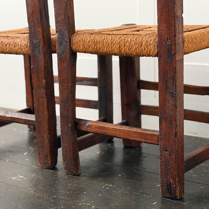 A Set Of Six Antique Carved Folk Art Pyrenean Chairs With Woven Seats