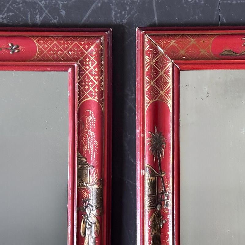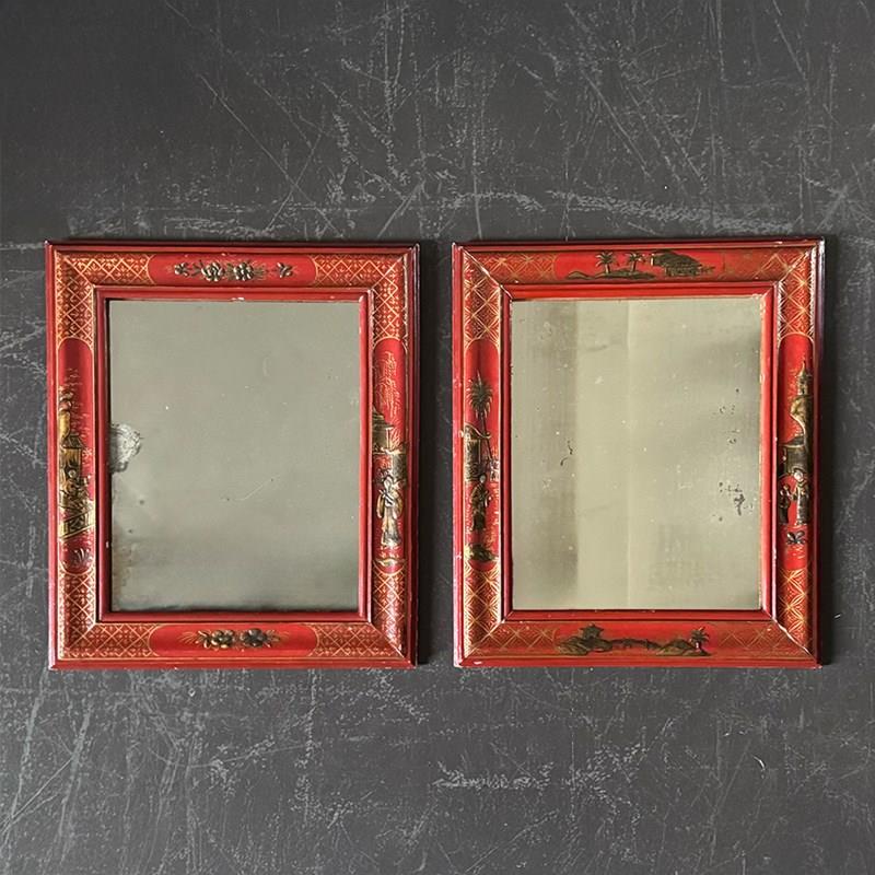 A petite pair of scarlet mirrors with Chinoiserie decoration and foxed plates.