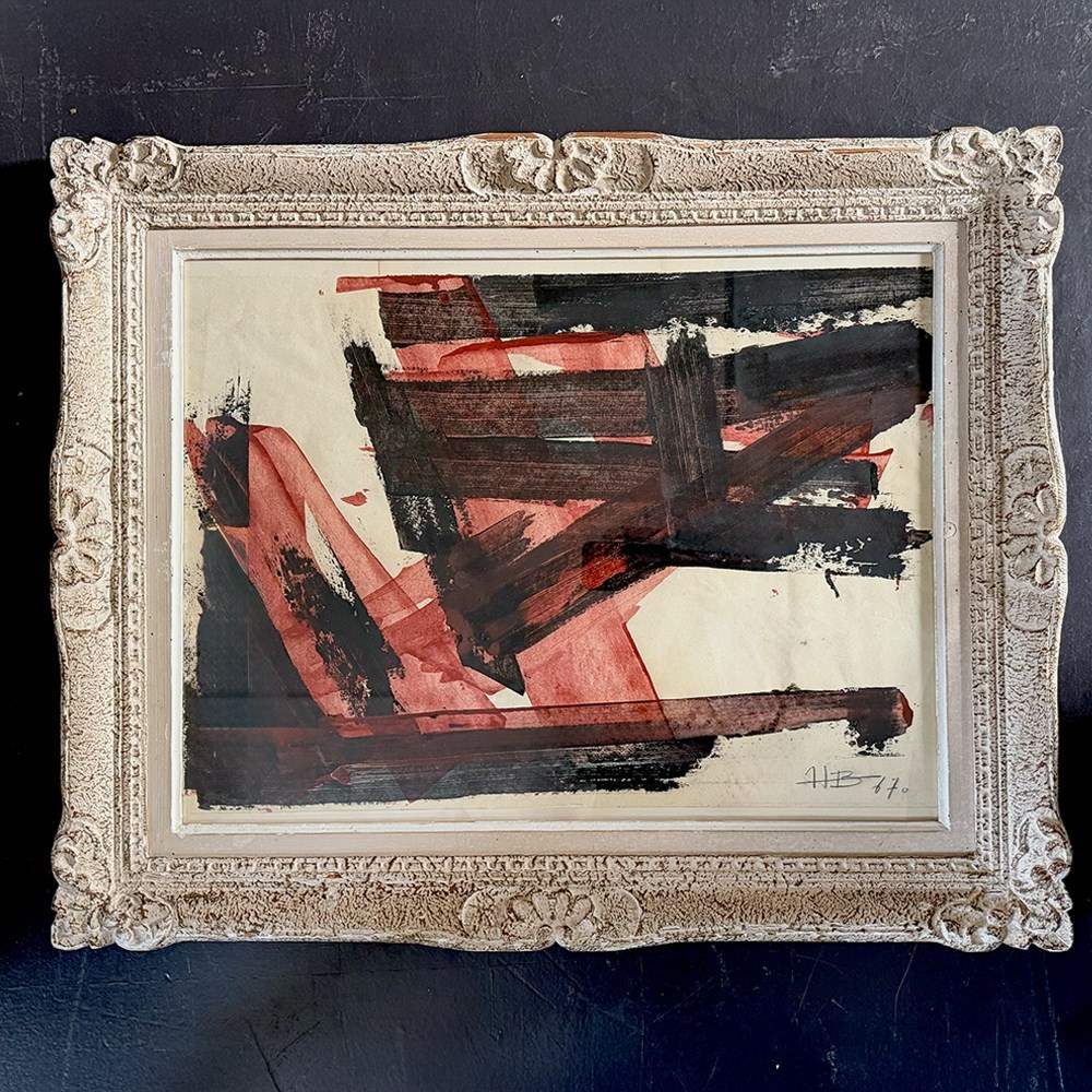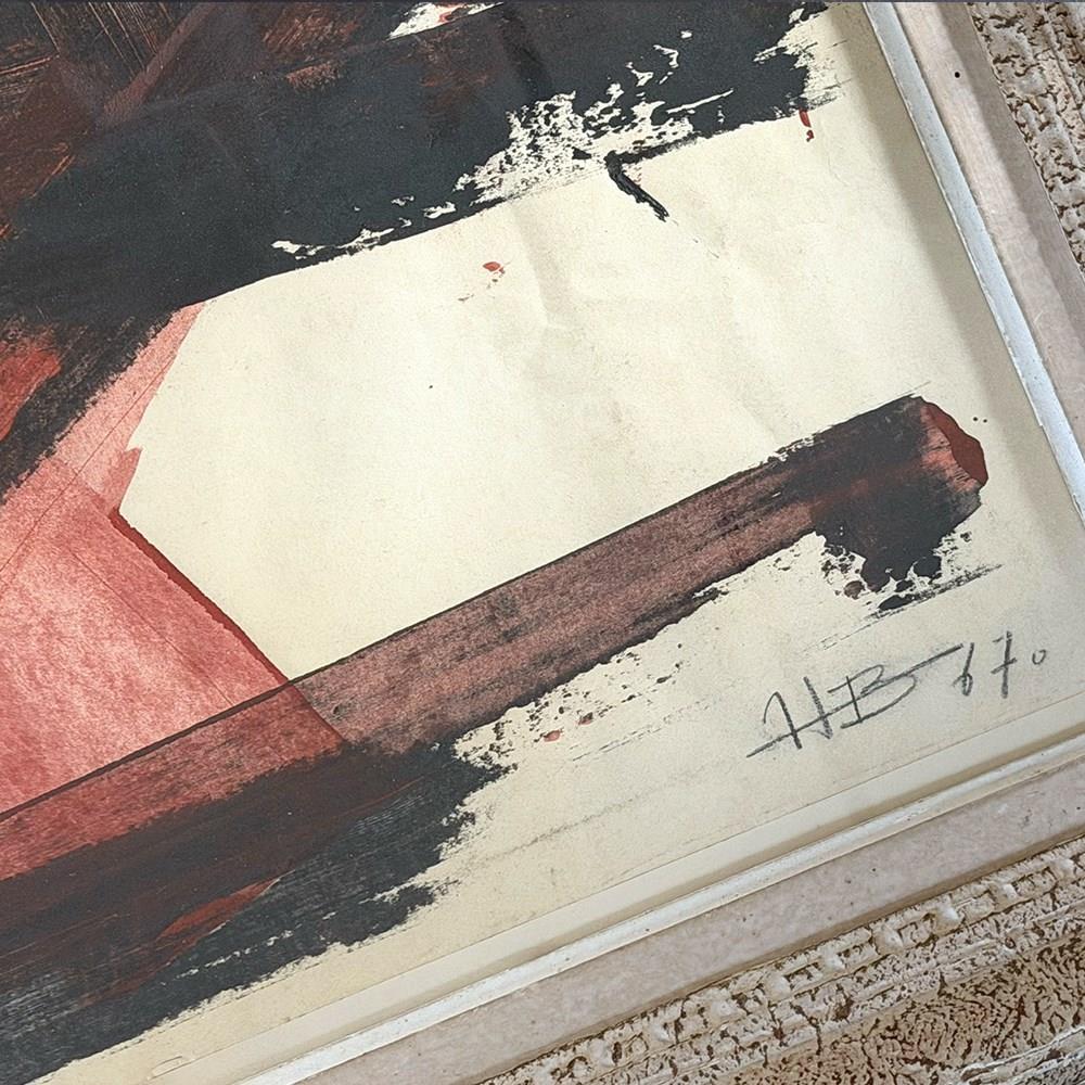 A striking abstract acrylic on paper artwork. This piece is signed HB and dated 1967. Framed in a vintage Montparnasse frame.