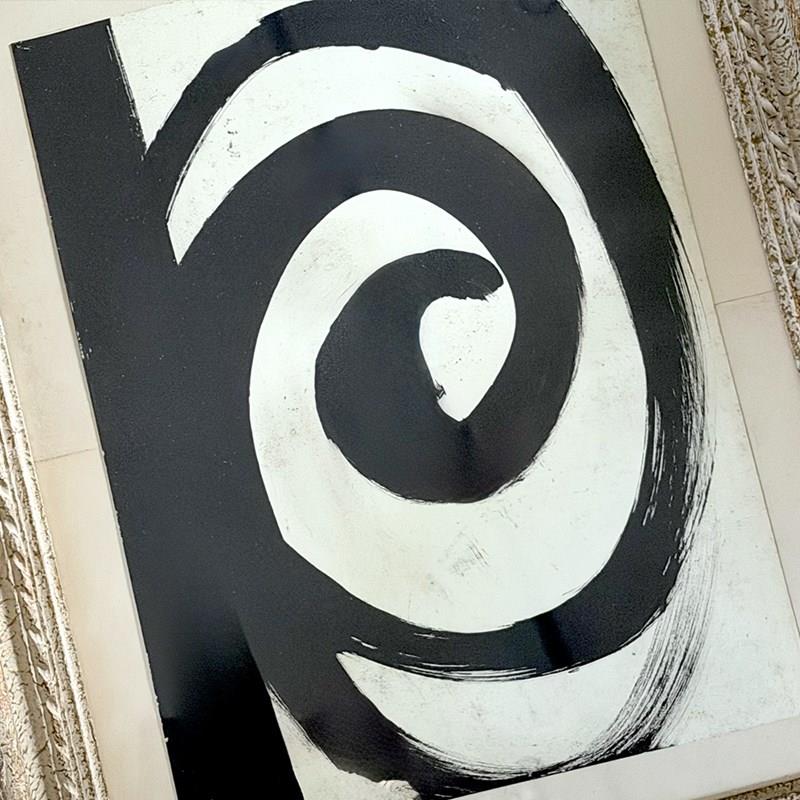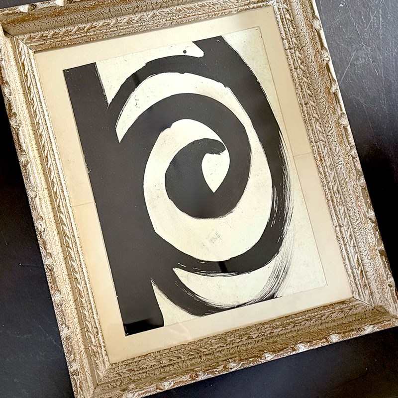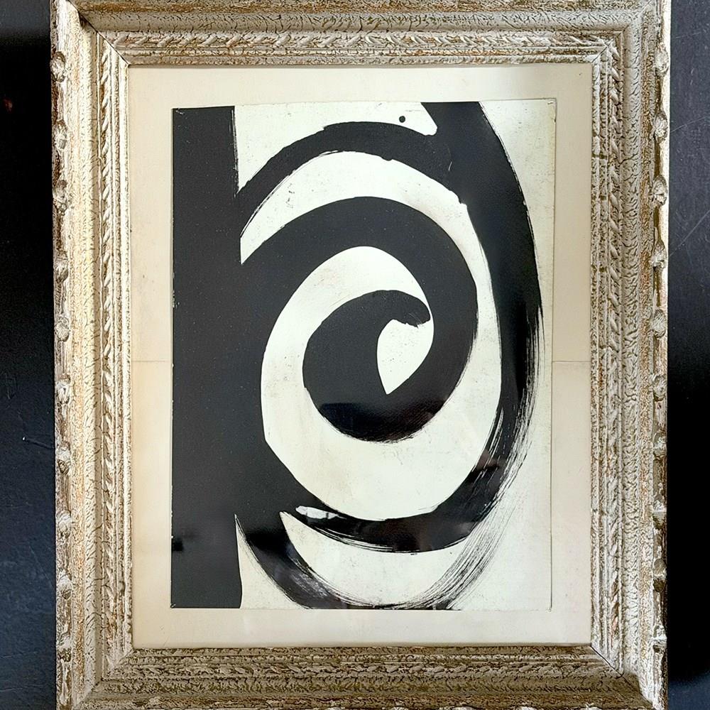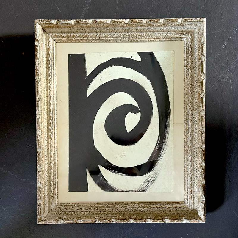 One of four abstract artworks by the same artist (unknown) in black acrylic on paper and framed in an antique Montparnasse frame