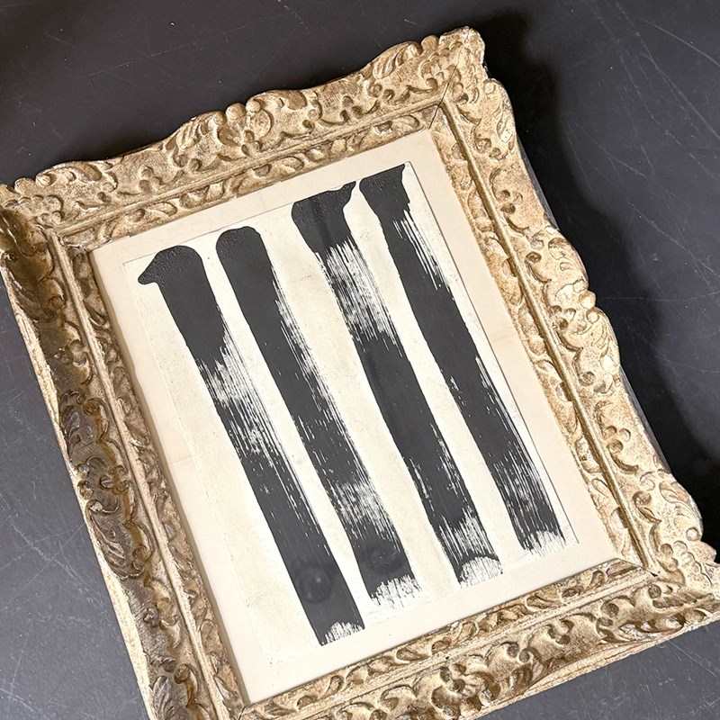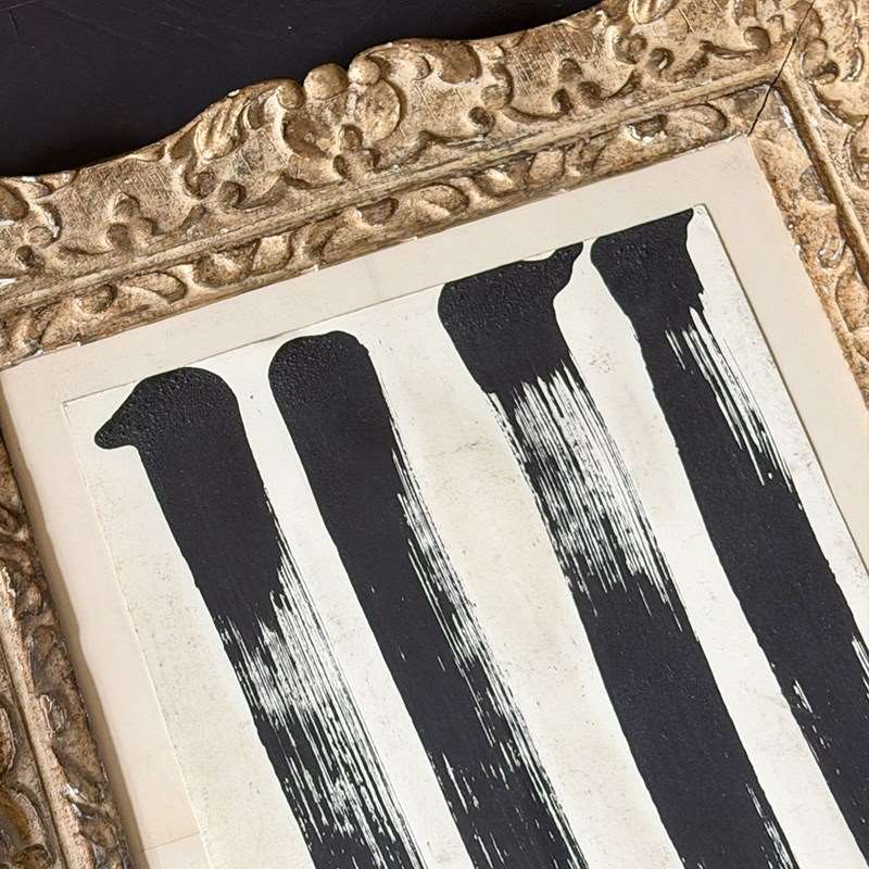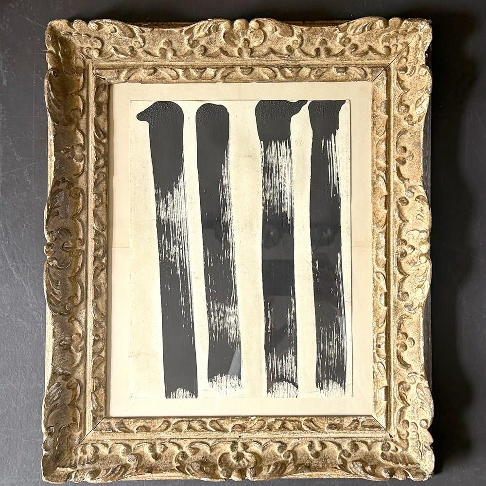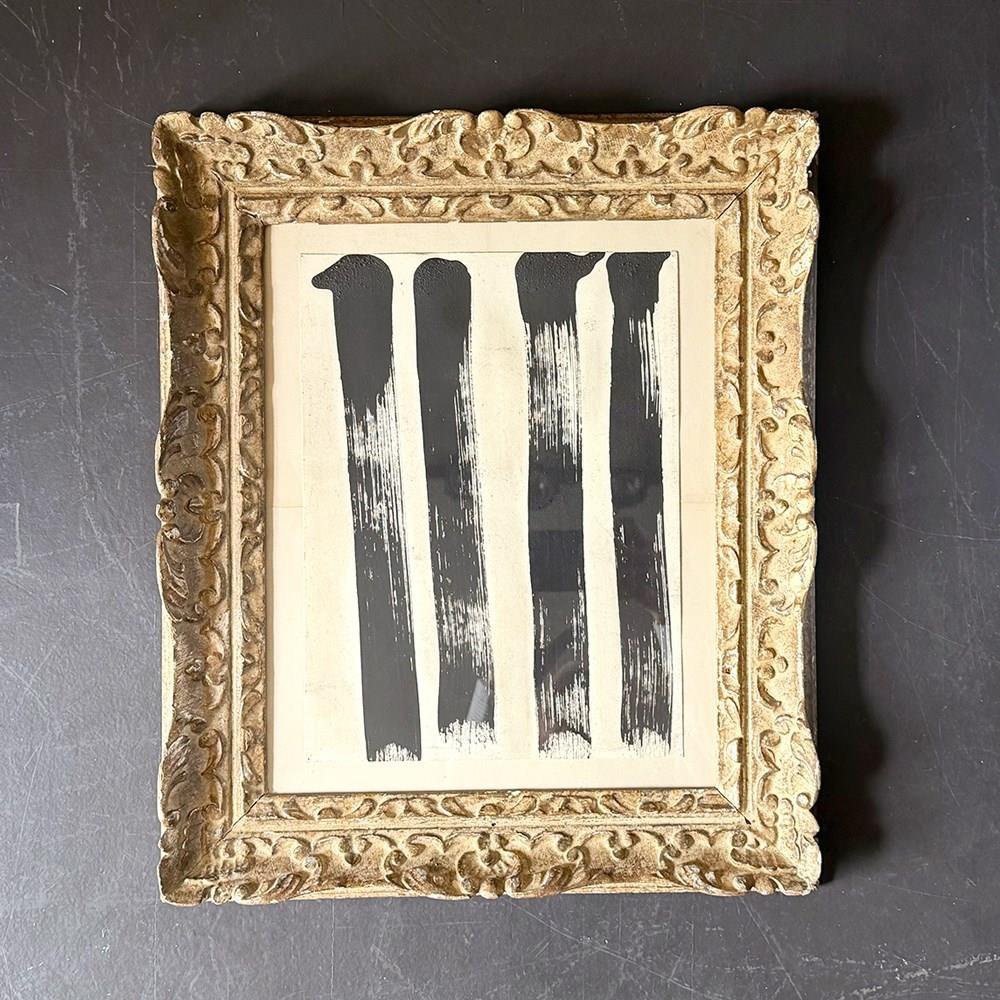 One of four abstract artworks by the same artist (unknown) in black acrylic on paper and framed in an antique Montparnasse frame