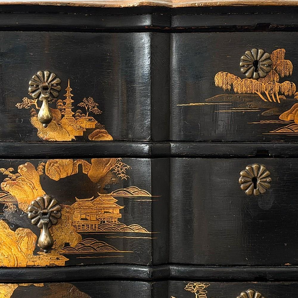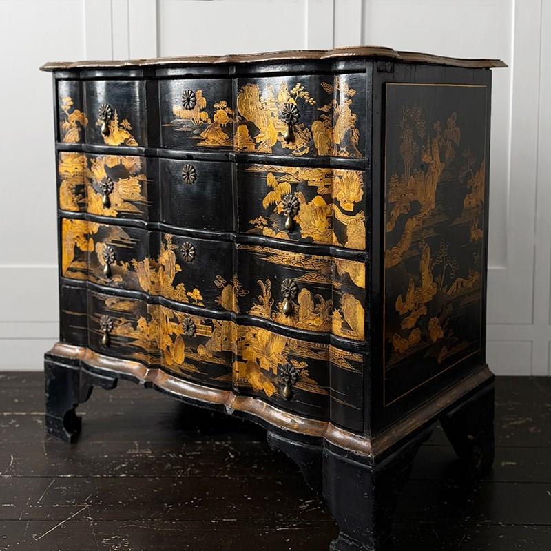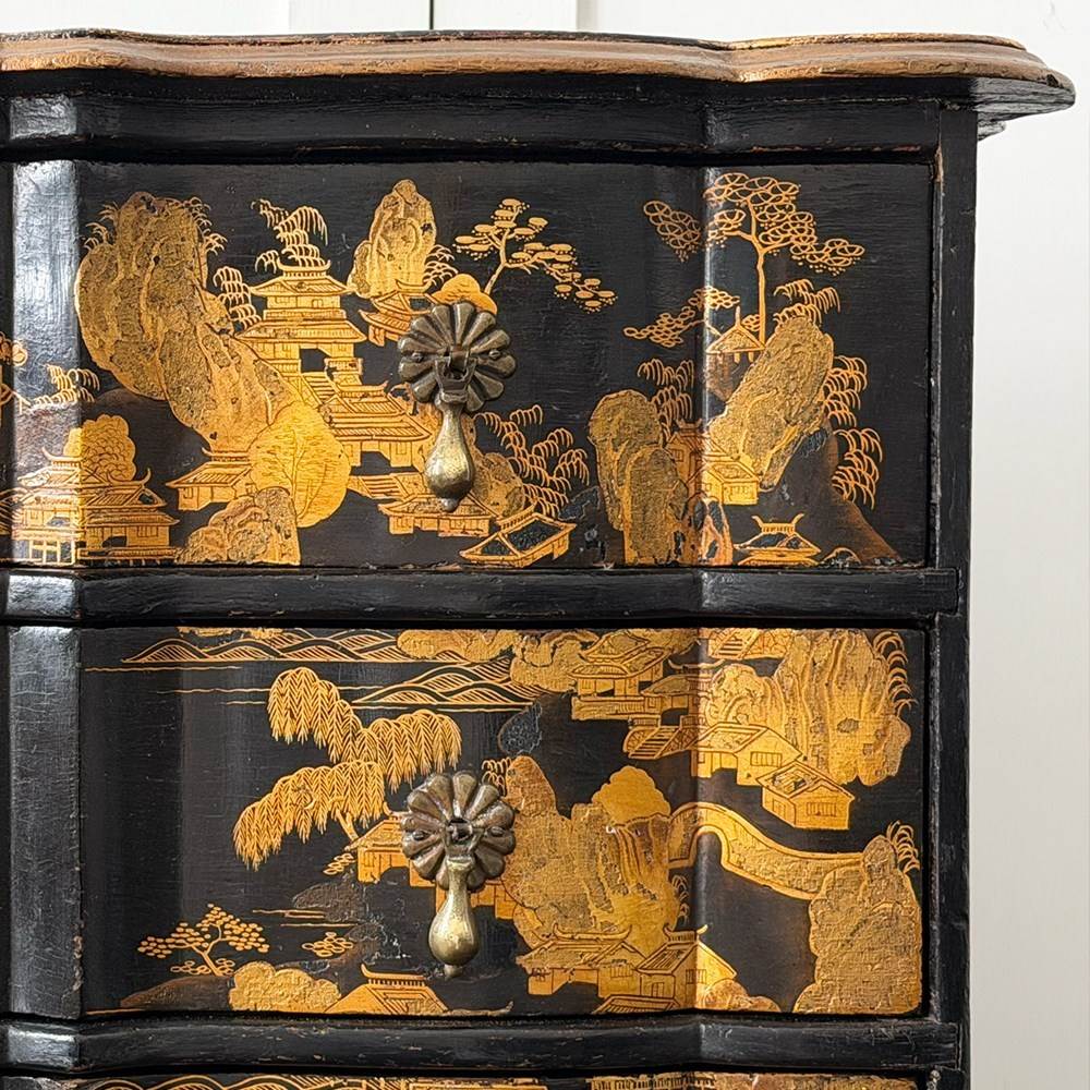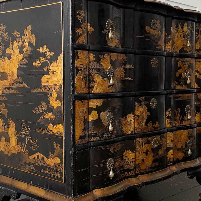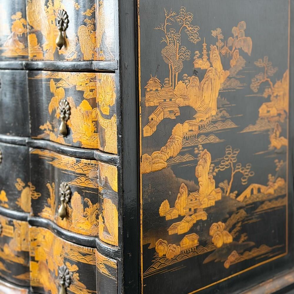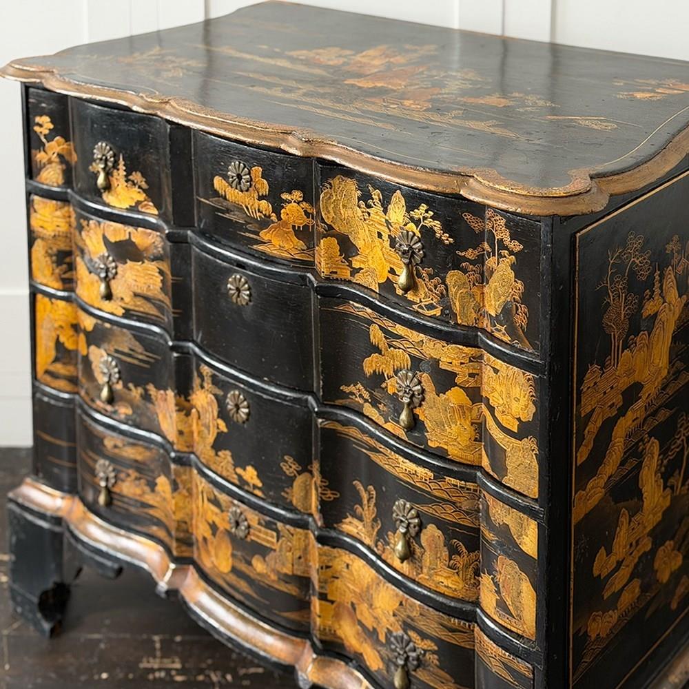 An 18th C Dutch Japanned chest with fine Chinoiserie decoration to all sides and top. With elegant shaped front and top. Brass handles and escutcheons.