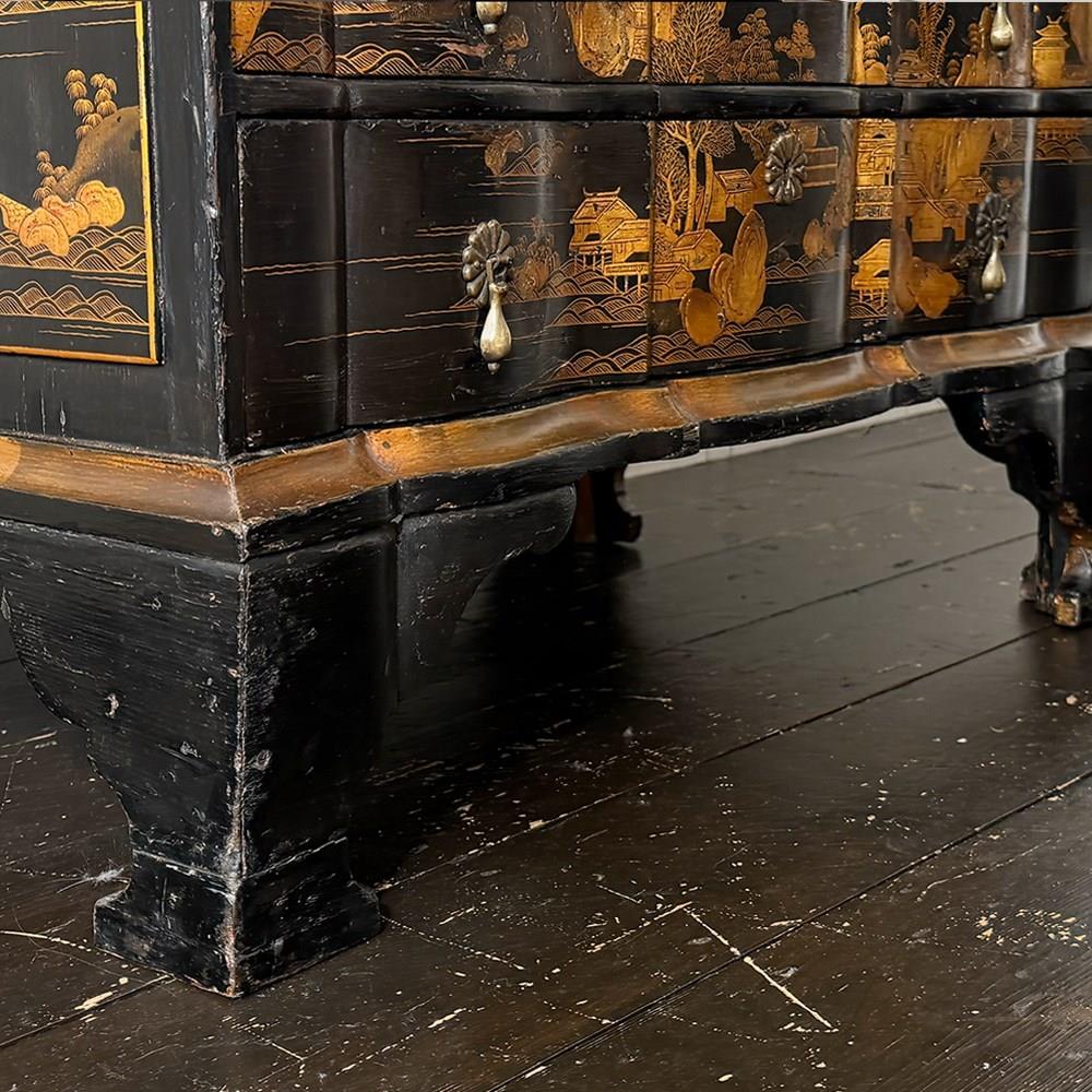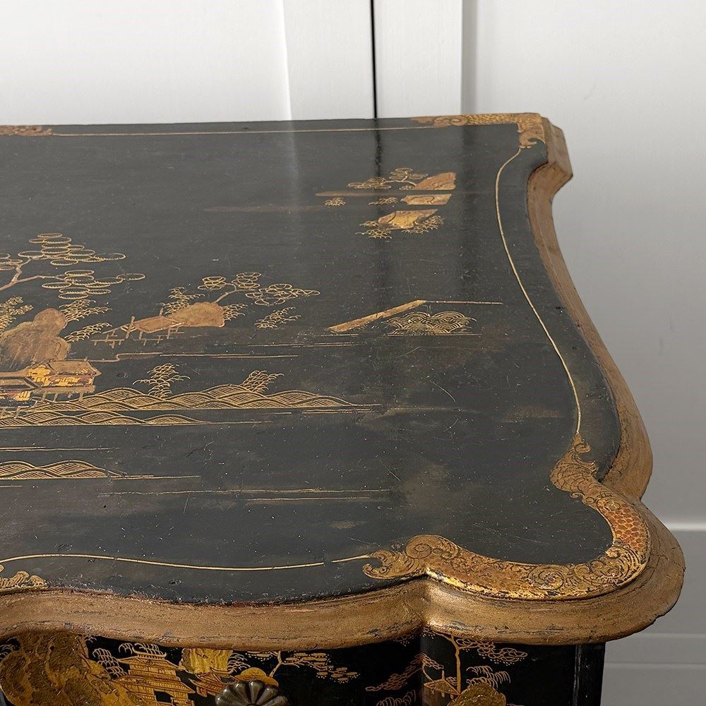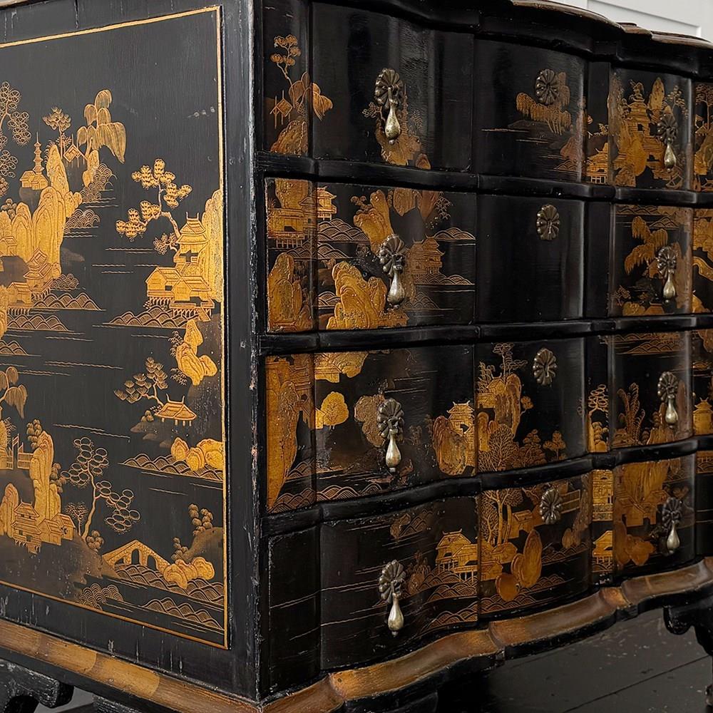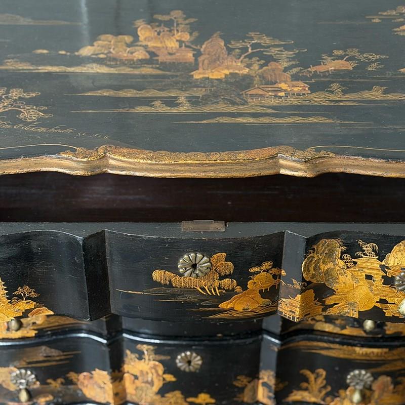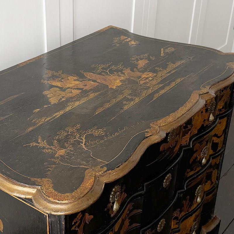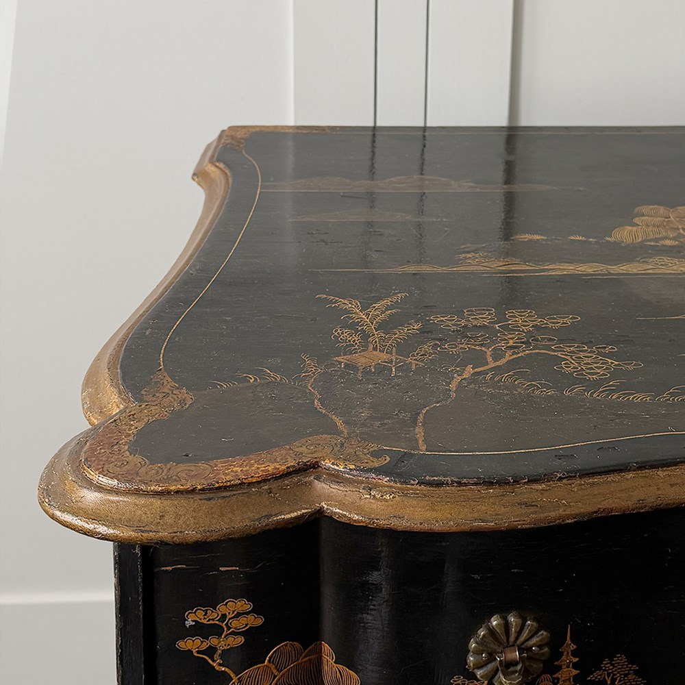An 18th C Dutch Japanned chest with fine Chinoiserie decoration to all sides and top. With elegant shaped front and top. Brass handles and escutcheons.