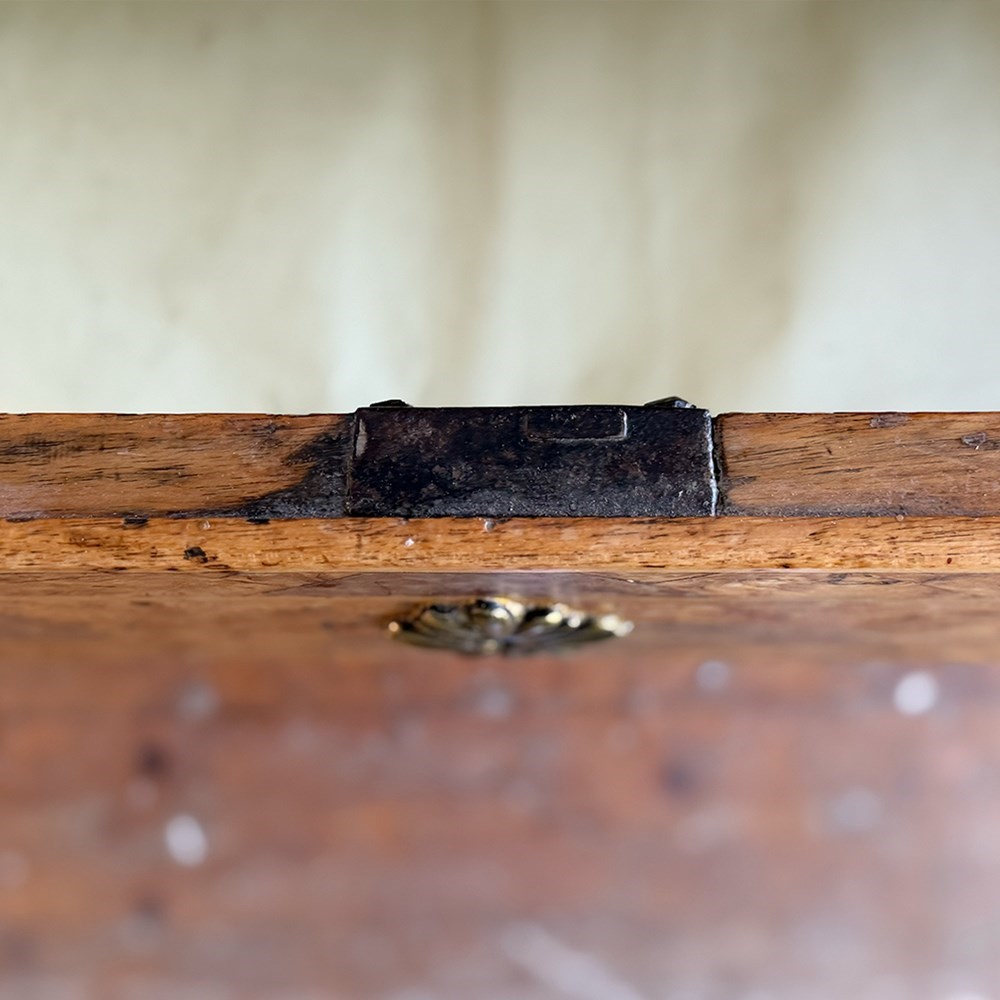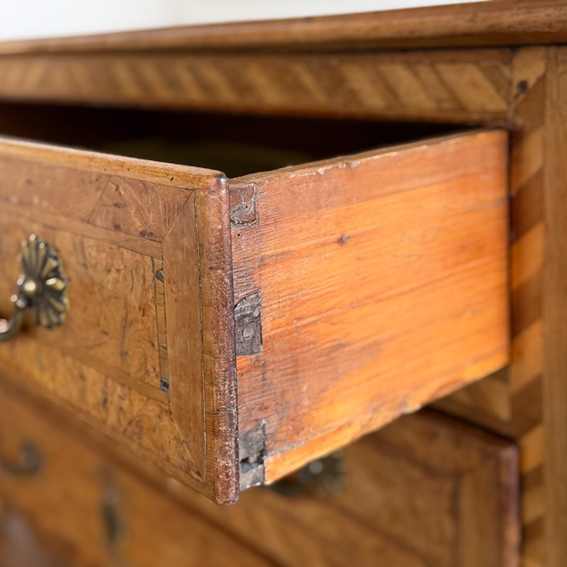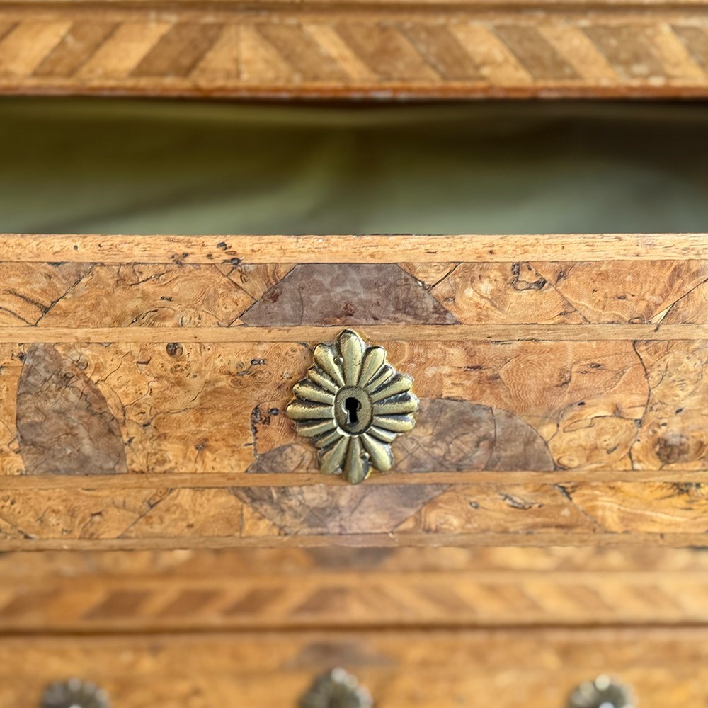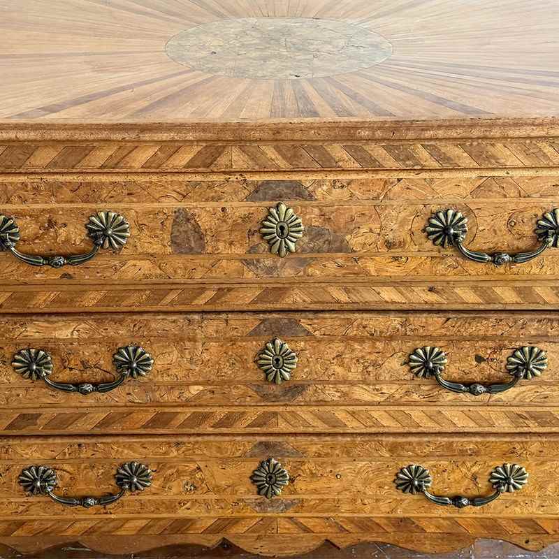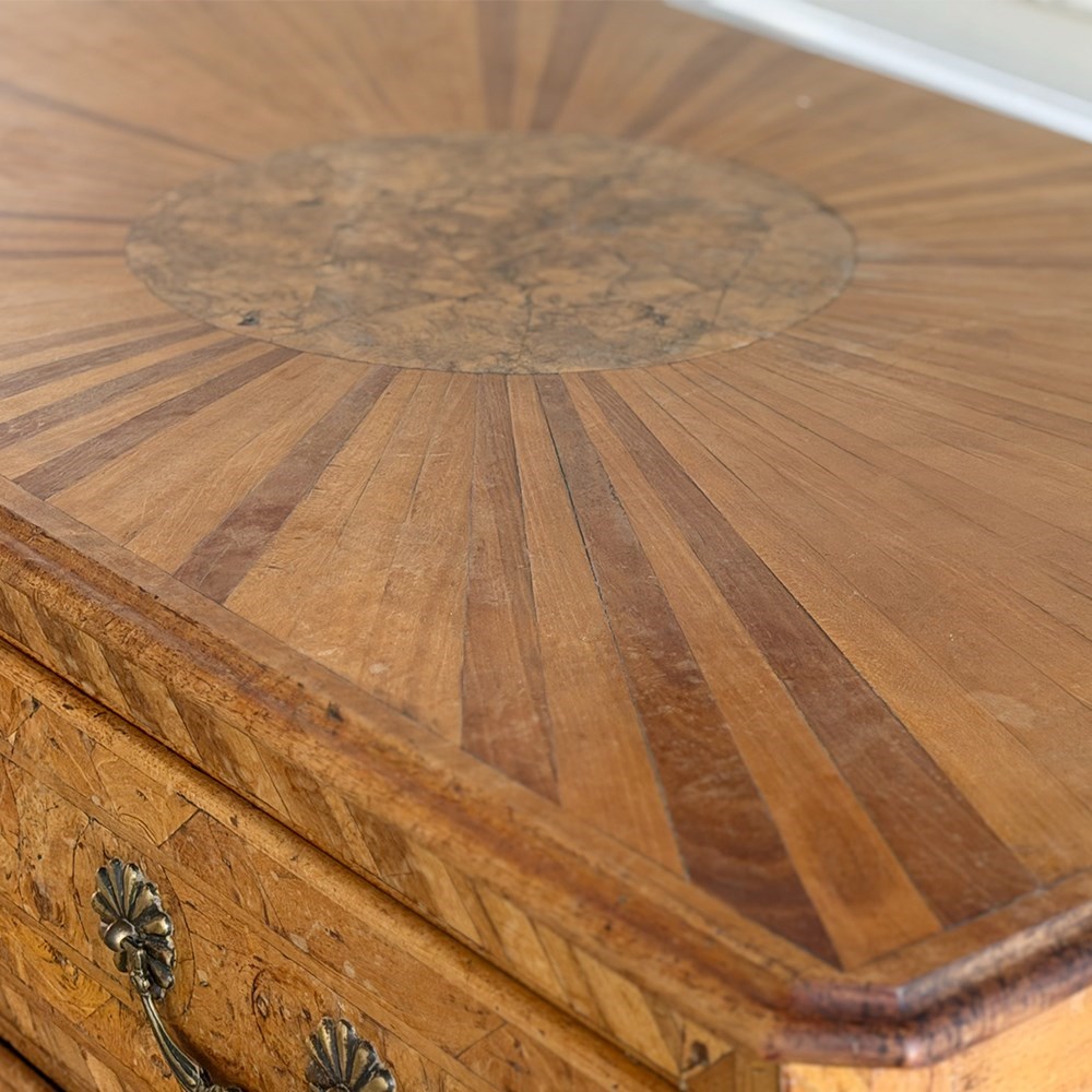 The moulded top centred by a sunburst with a burr walnut centre and inlaid with various timbers radiating outwards. The front with three long drawers with brass handles surrounded by chevron holly veneers and burr elm panels above a shaped apron and scrolled feet. The sides with inlaid panels.