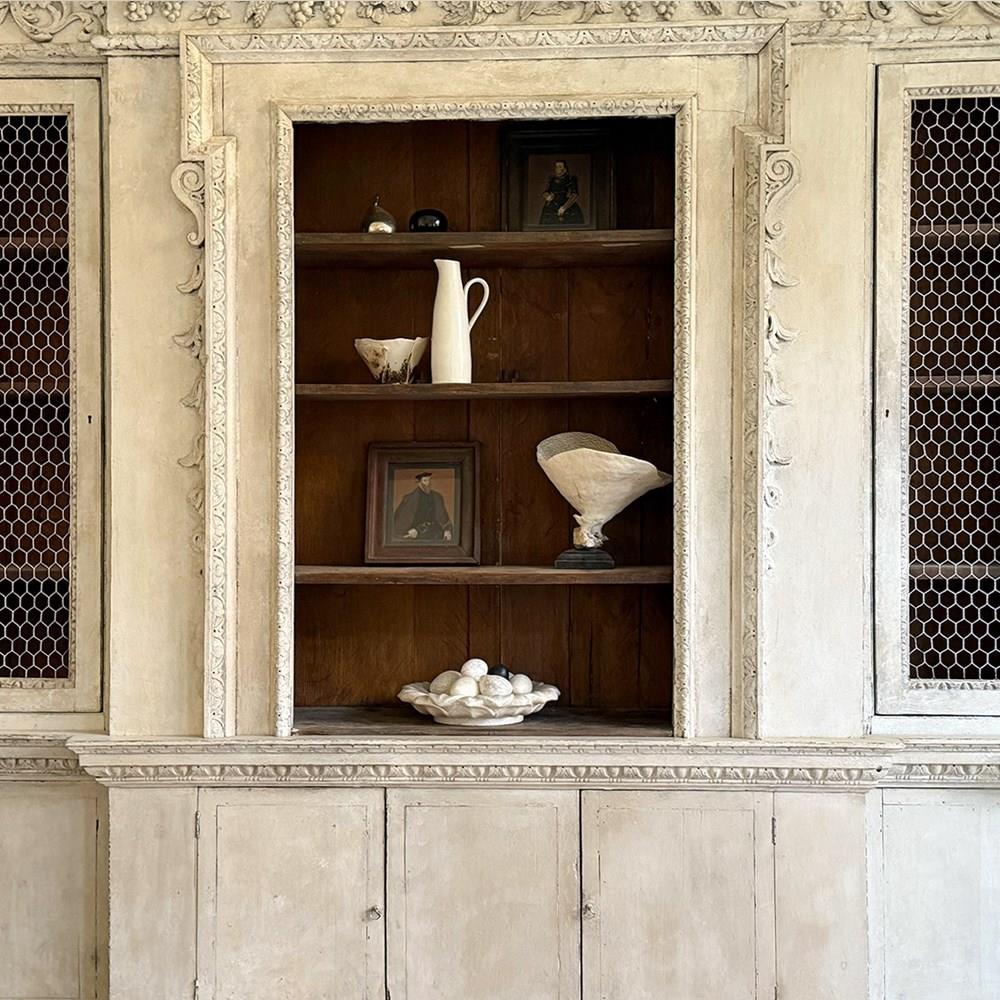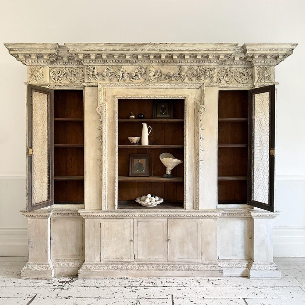 A rare and unusual Kentian oak bookcase, the distinctive dentil moulded cornice above egg and dart moulding, the frieze centred with a winged baccic head by carved bunches of grapes and ears of ripe corn with leafy acanthus, the central section outlined with carved moulding, scrolls and graduated husks and flanked by chicken wire filled panel doors and with pilasters headed by the Garter Star centred by a cross and and with running rose and ribbon, the lower part with fielded panel doors and a carved and moulded plinth.