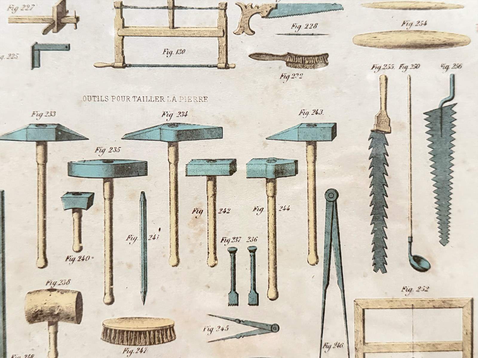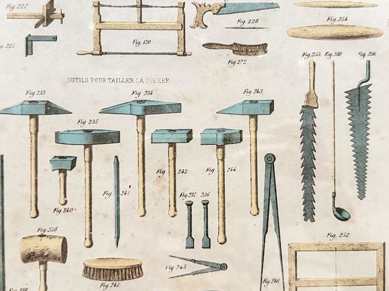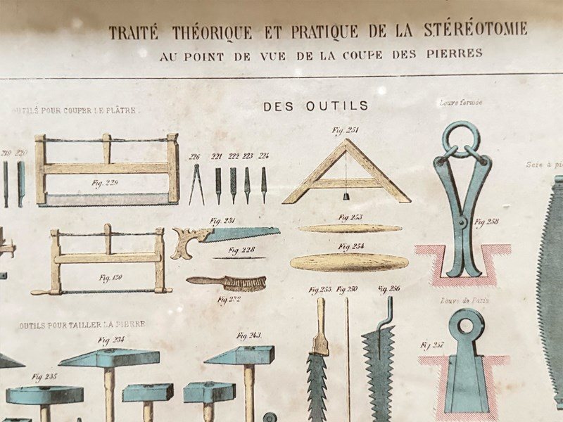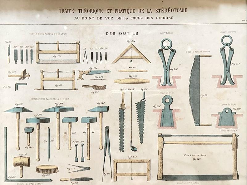 An antique print from an architectural textbook showing a variety of tools needed for stone carving. Framed in a vintage frame.