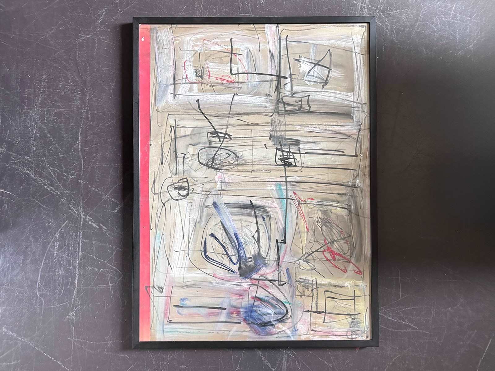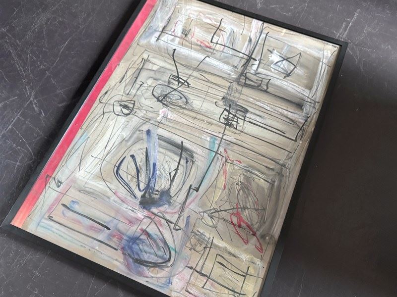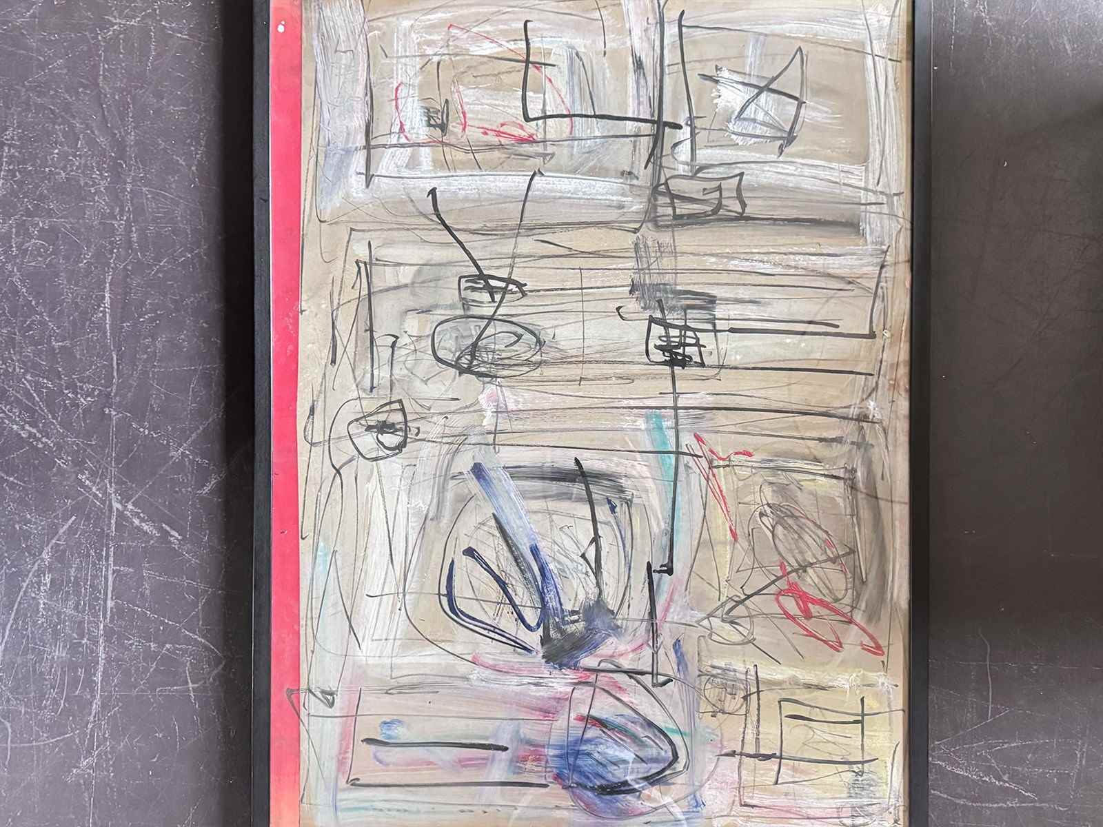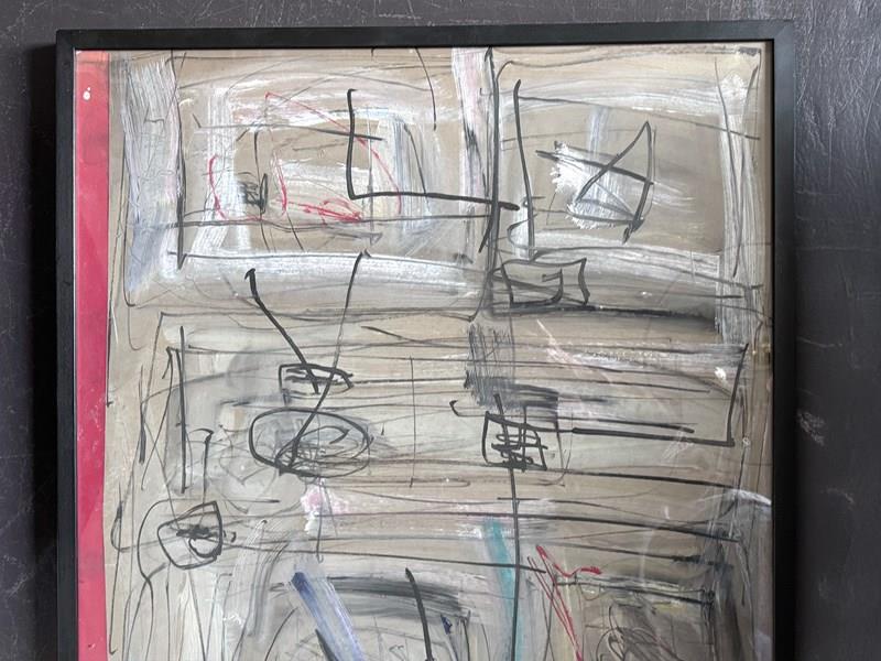 An expressive 1970's French acrylic on board abstract artwork in monochrome tones and with hidden words and letters. By Patrick Bouchon.