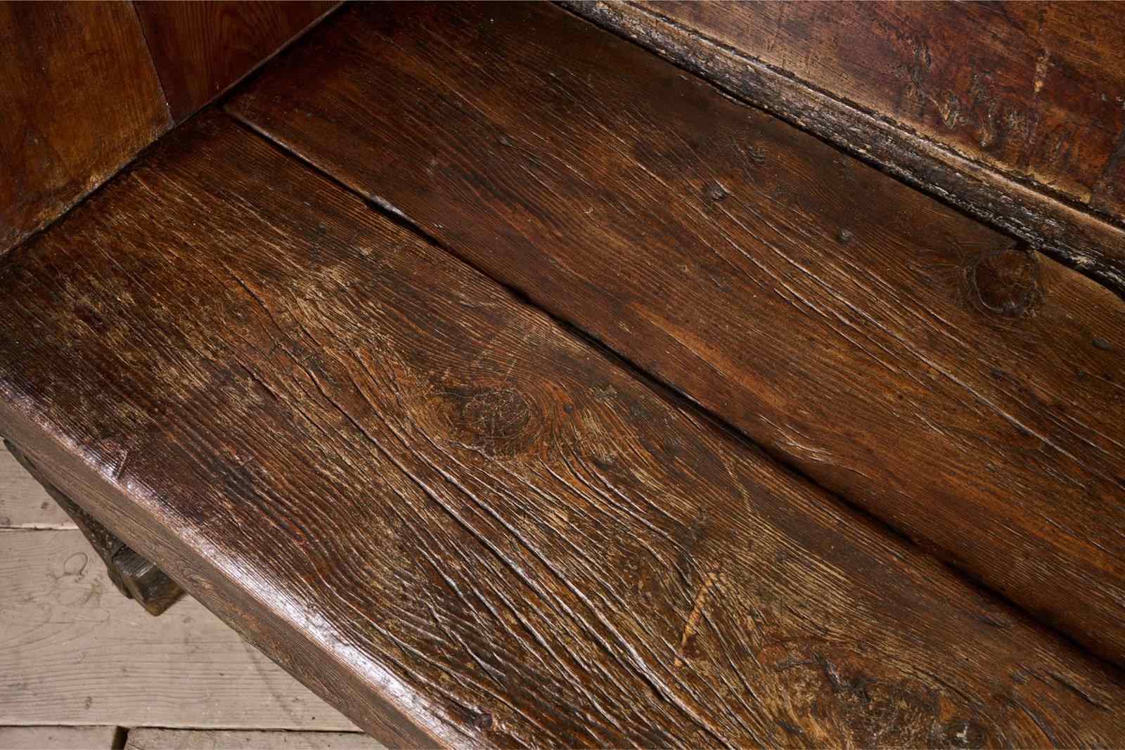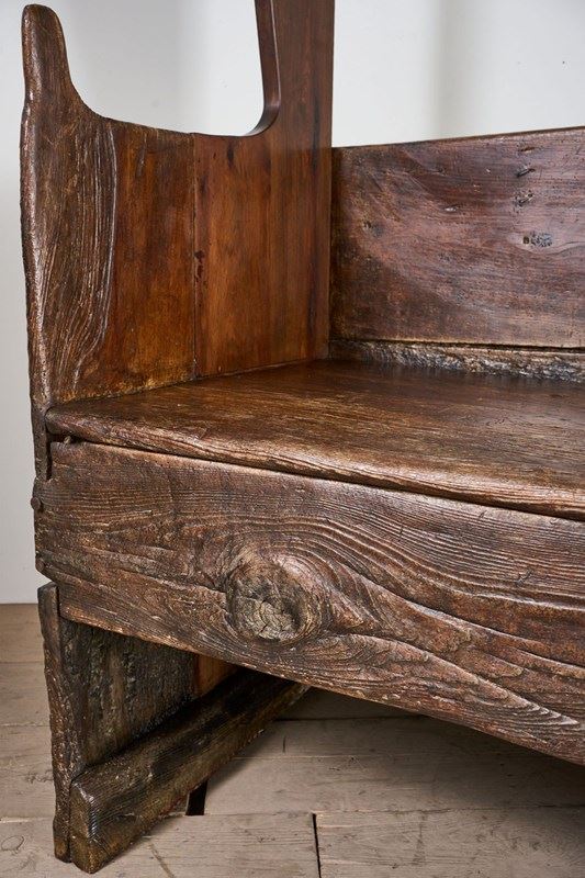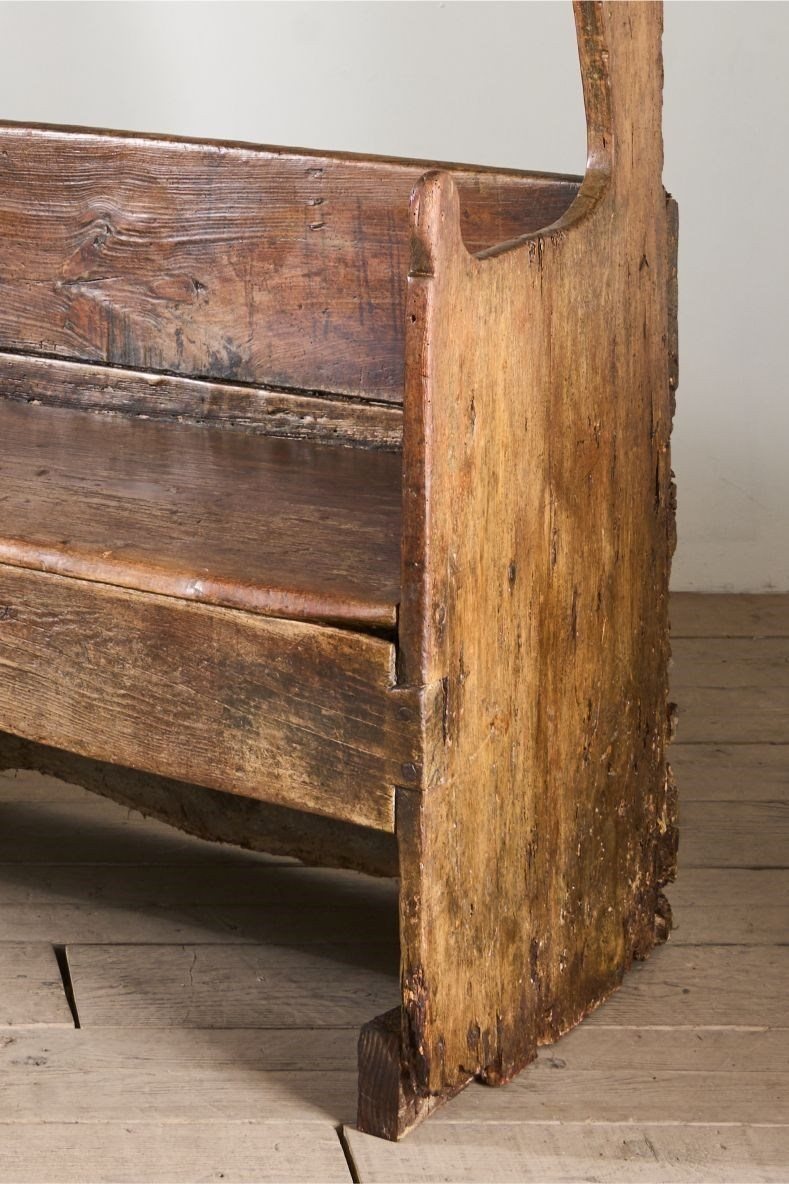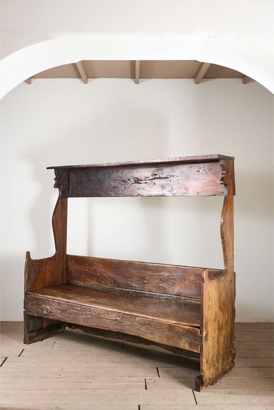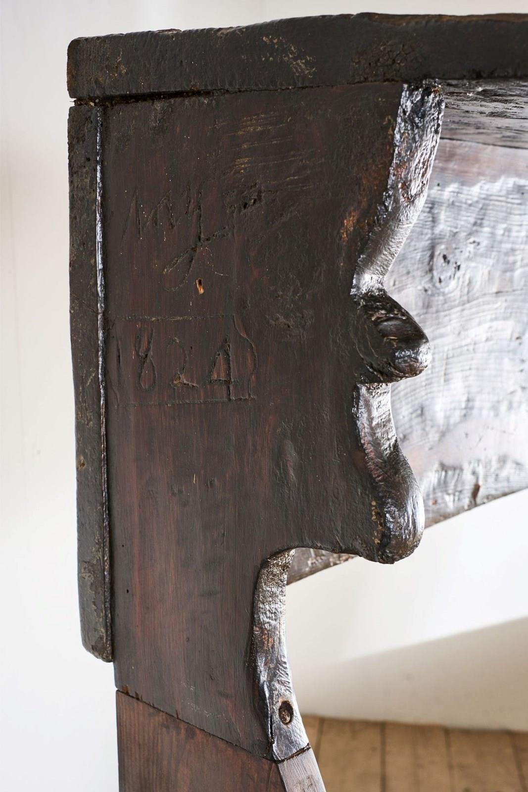 This is a truly stunning piece of early Spanish country Furniture. Sourced in Northern Spain and beautiful for its primitive nature. The piece is made of chunky slabs of what I believe is chestnut. The front rail especially has a lovely tactile finish shown with the eye in the grain. The canopied top is a design element I have never seen before but I love it. The only issue with the bench is a replaced upright to the left hand side, a restoration that was undertaken in 1824 as per the date carved above the replacement piece. The settle itself is much earlier. Strong condition and perfectly useable and looks great when not in use.