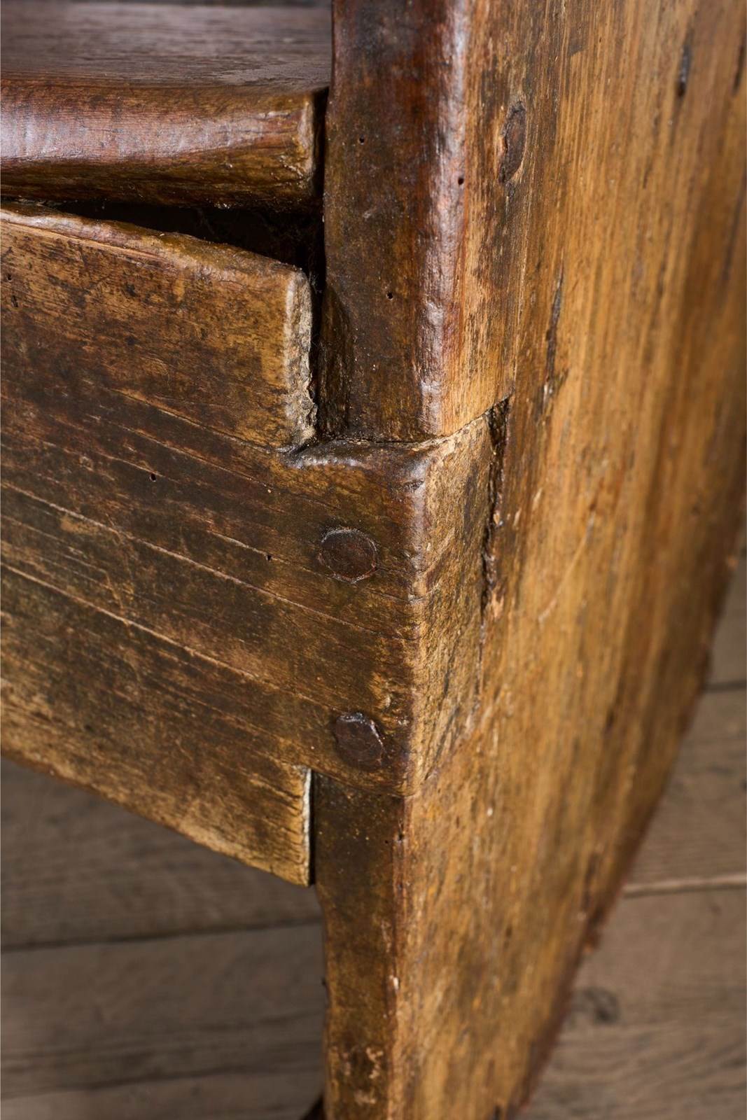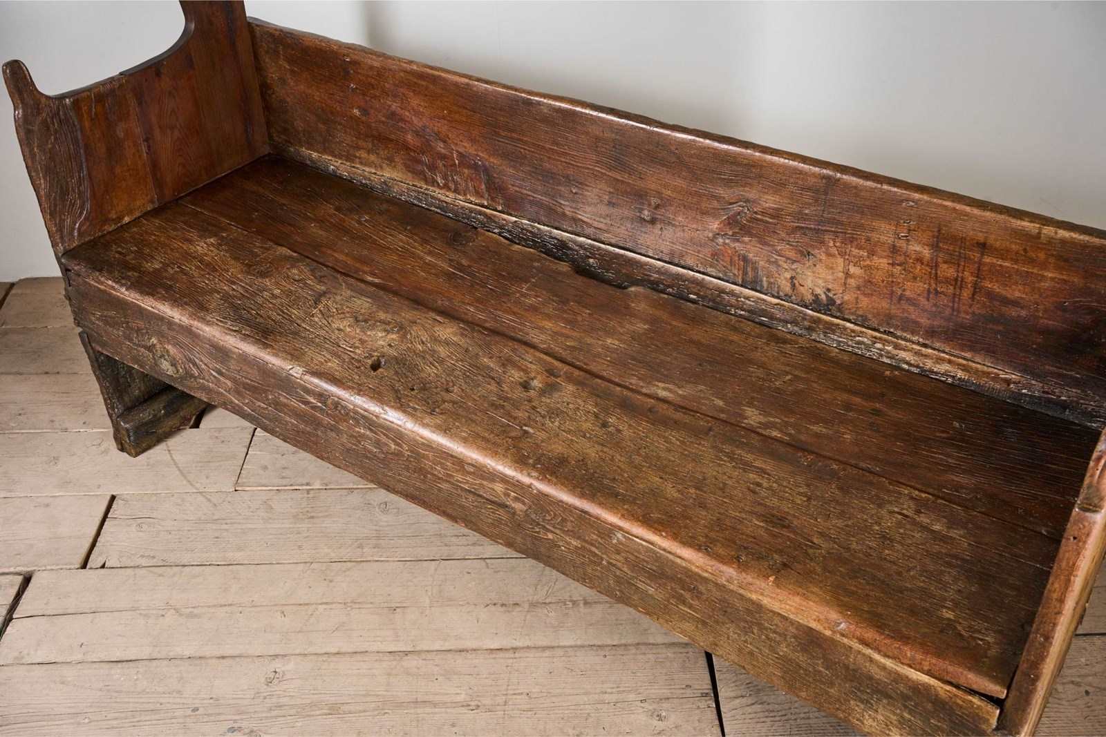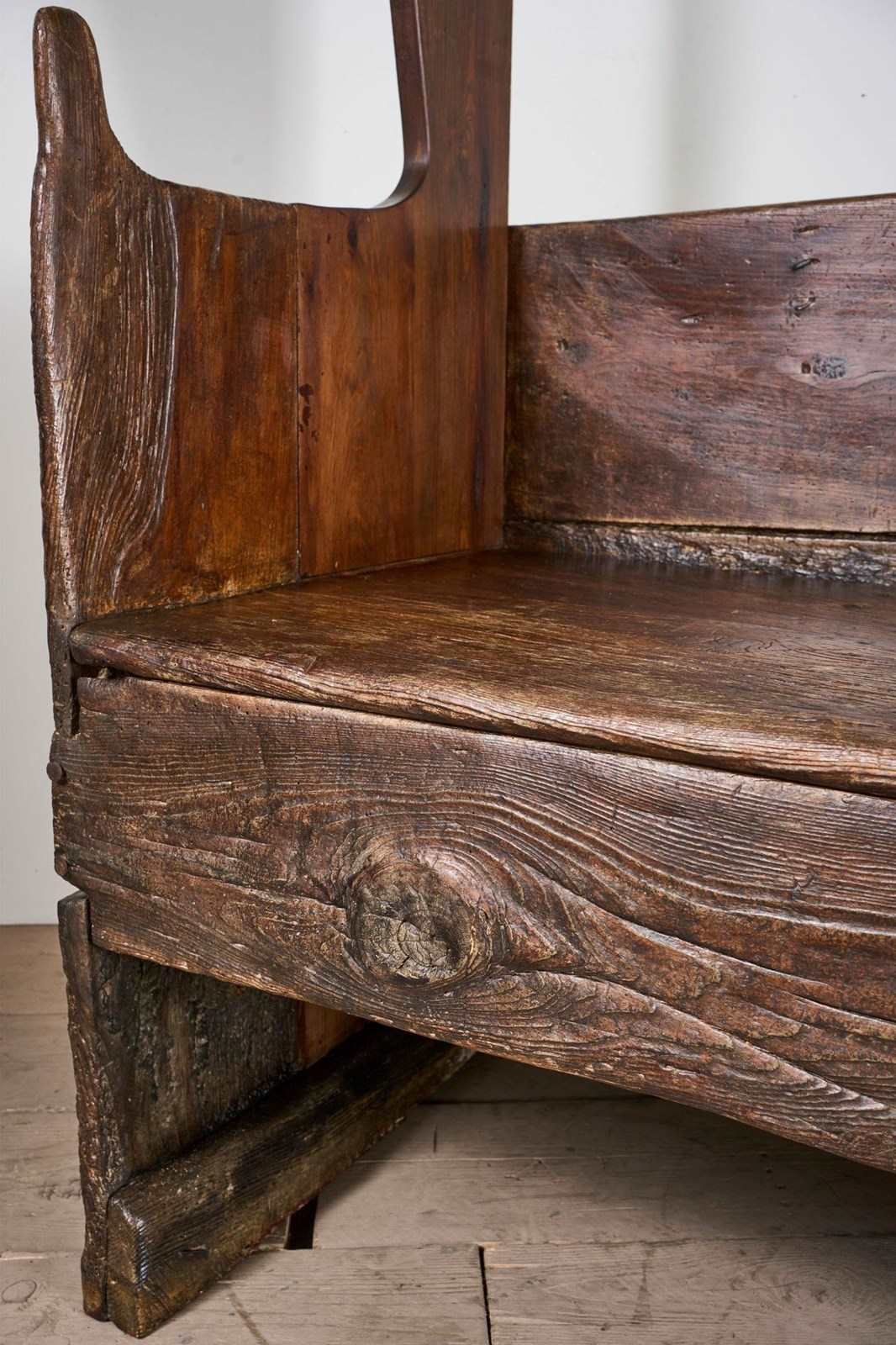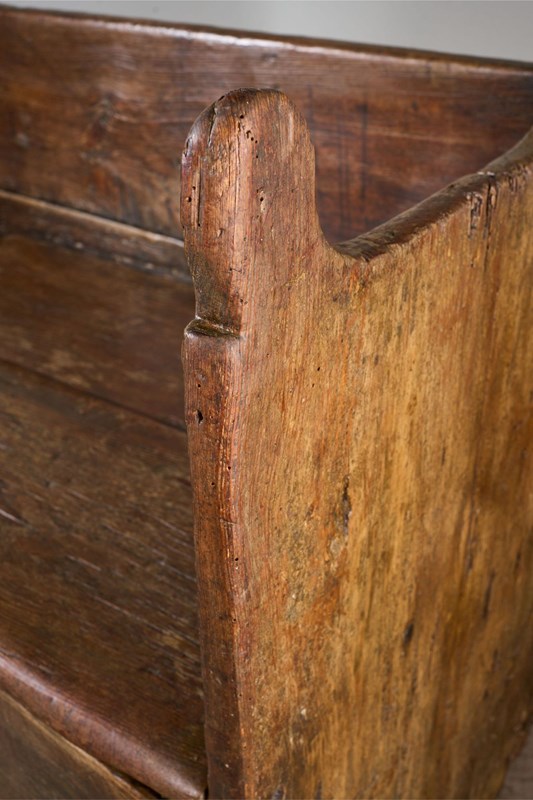 This is a truly stunning piece of early Spanish country Furniture. Sourced in Northern Spain and beautiful for its primitive nature. The piece is made of chunky slabs of what I believe is chestnut. The front rail especially has a lovely tactile finish shown with the eye in the grain. The canopied top is a design element I have never seen before but I love it. The only issue with the bench is a replaced upright to the left hand side, a restoration that was undertaken in 1824 as per the date carved above the replacement piece. The settle itself is much earlier. Strong condition and perfectly useable and looks great when not in use.