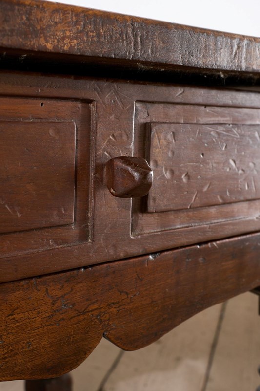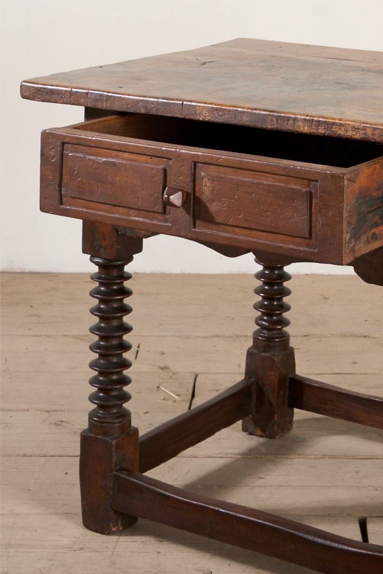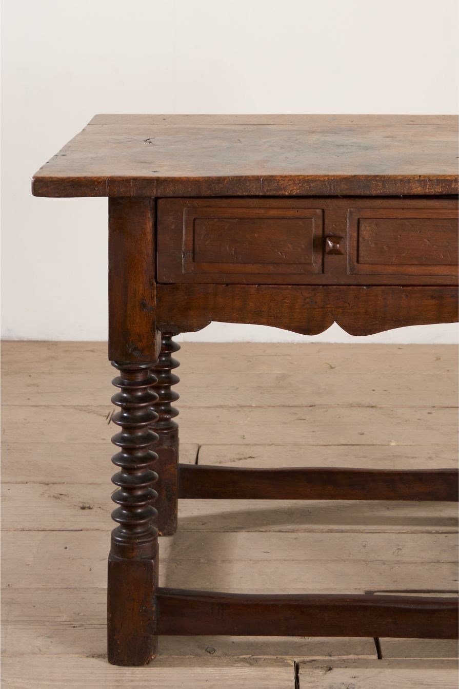 This a striking 18th century Spanish walnut turned leg side table with single drawer. Totally original and in very good clean condition. The top is a single piece of walnut with incredible colour and patina. The bold design of the piece makes it perfect for a huge number of interiors. The drawer is nice and deep as well, offering plenty of space for clutter.