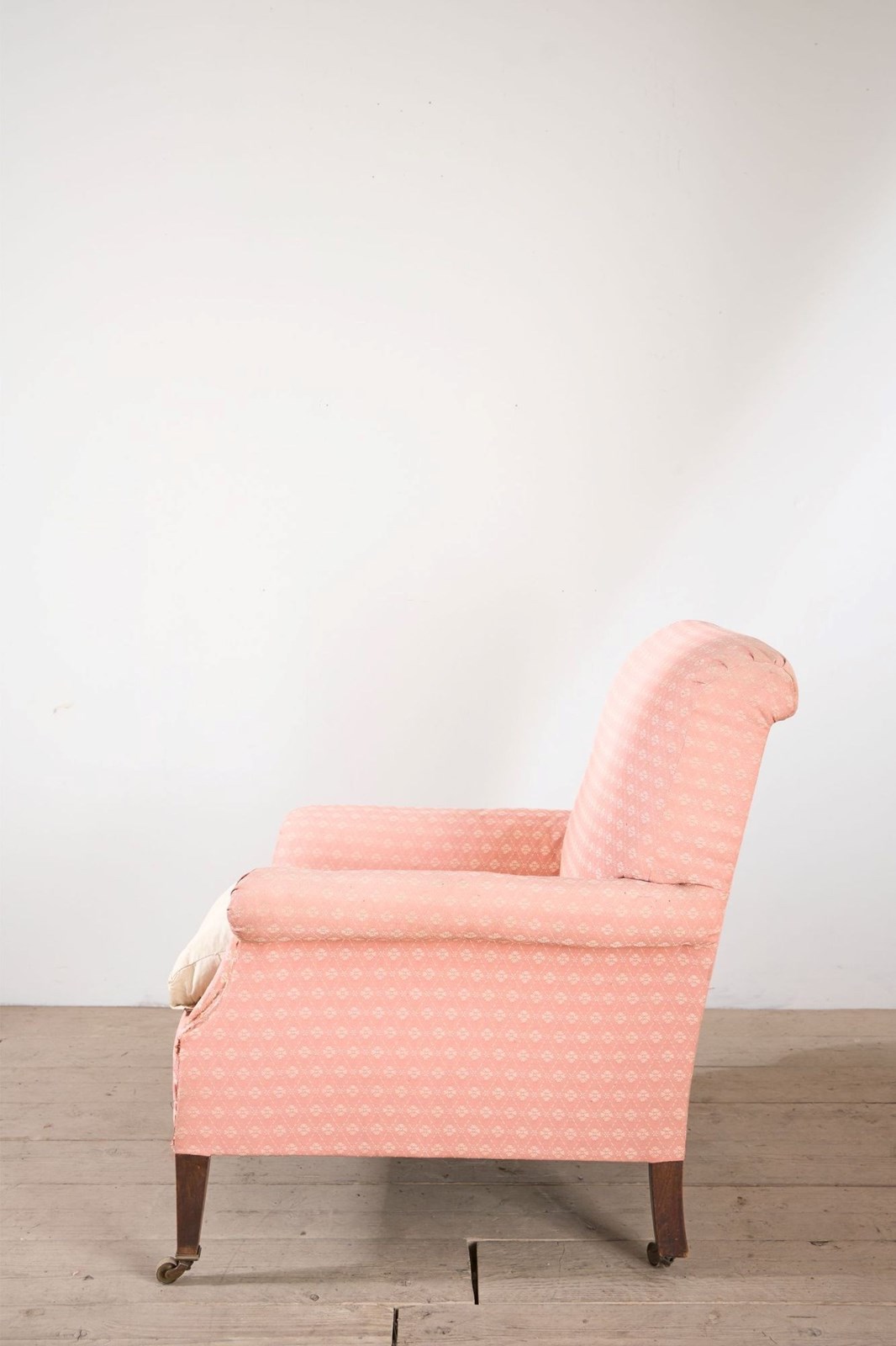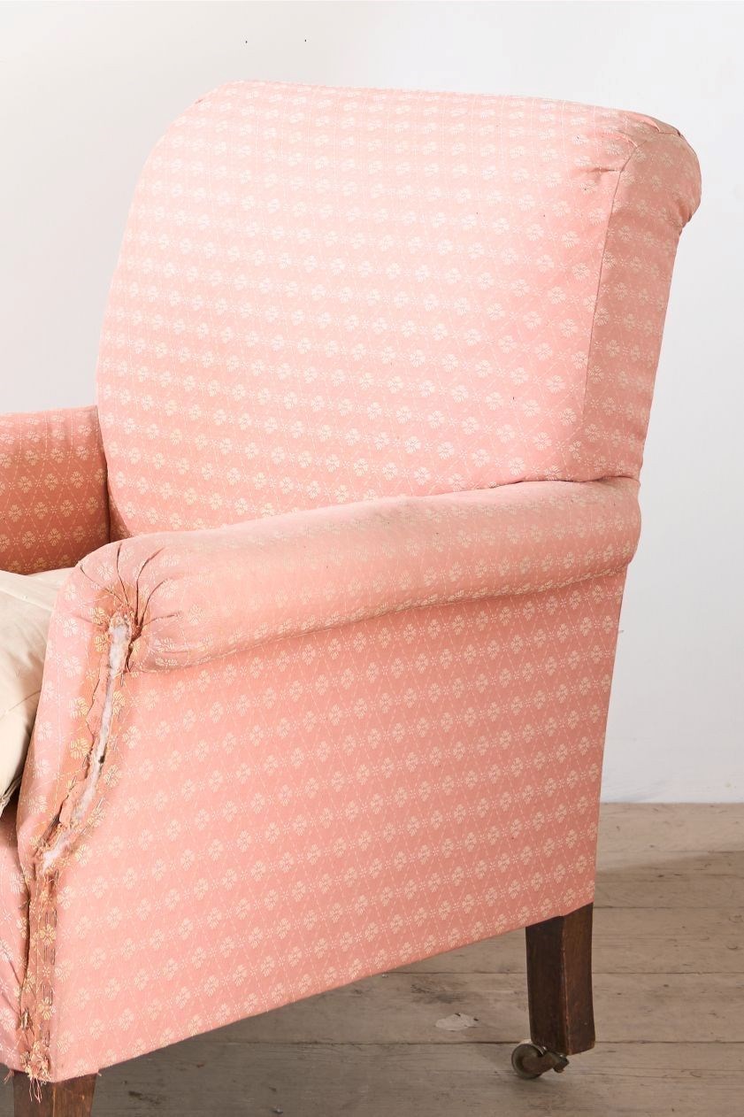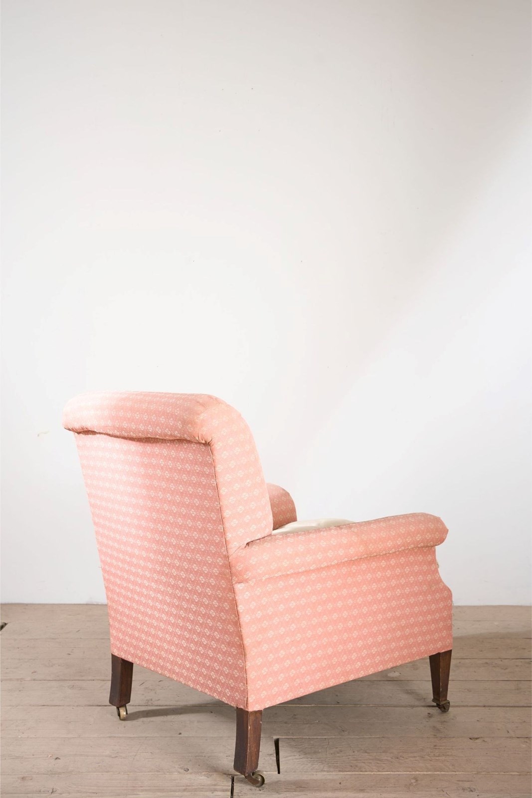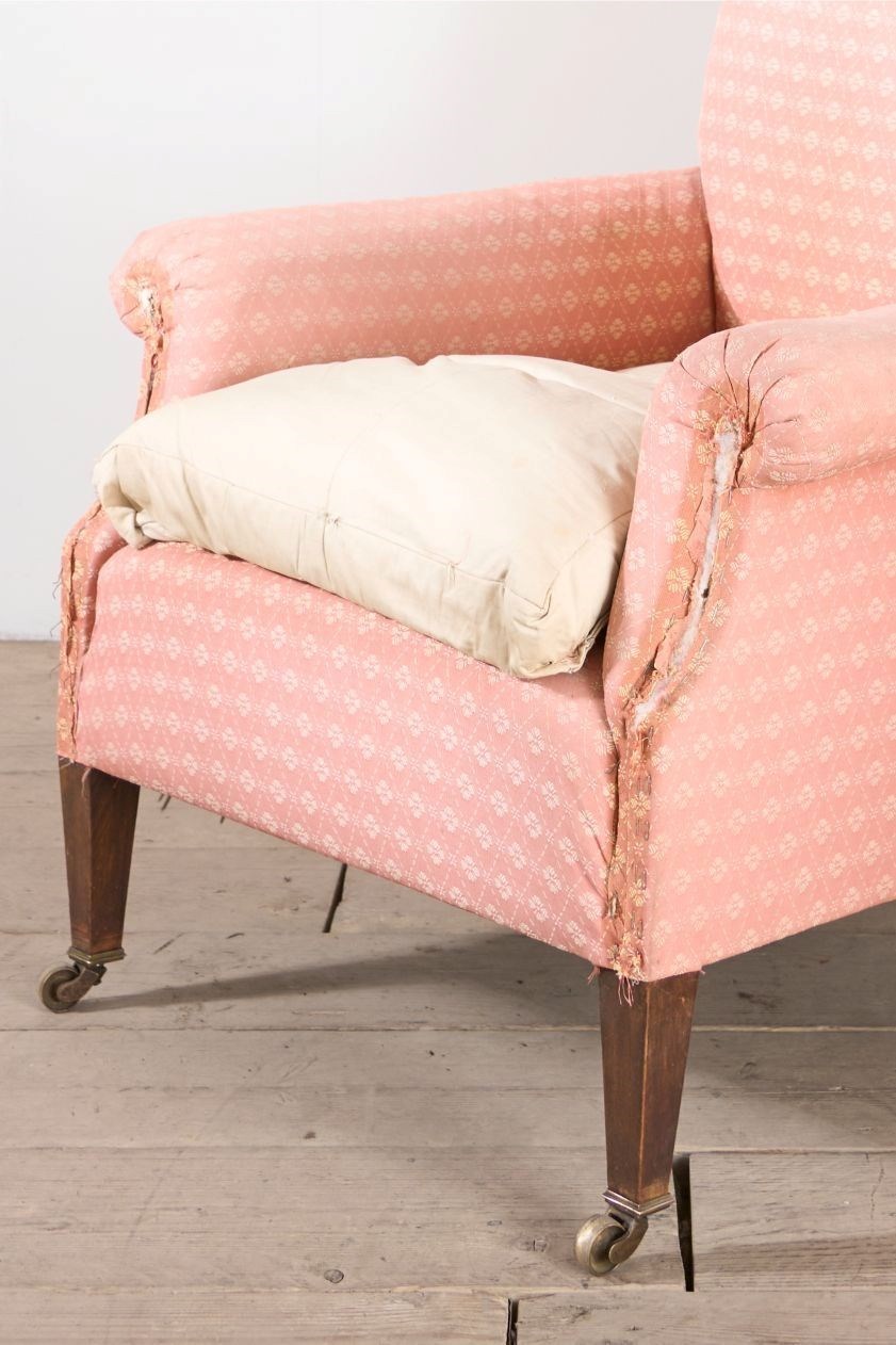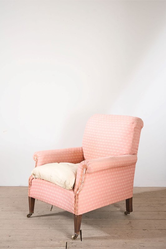 This is a very elegant 19th century English country house armchair. Classic design and high quality. Tall tapered legs complete with brass casters