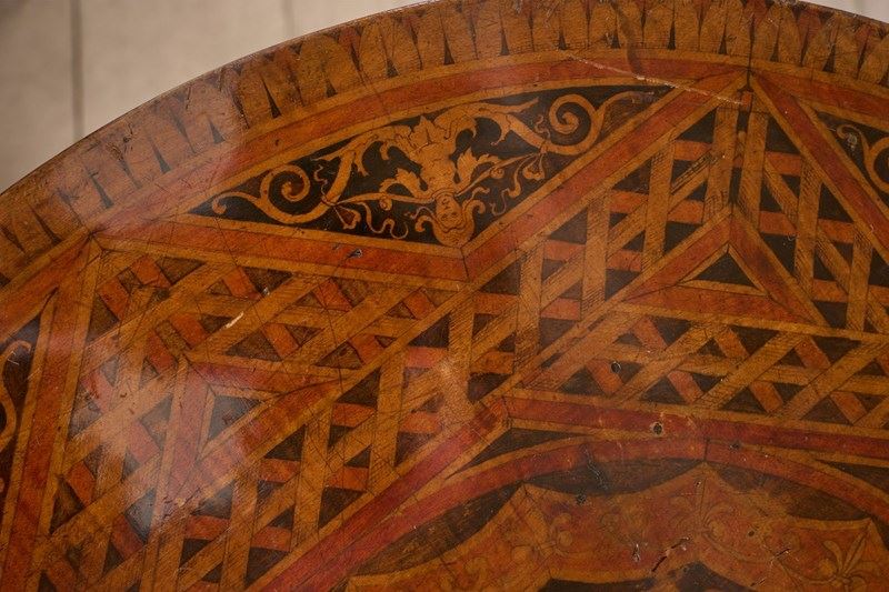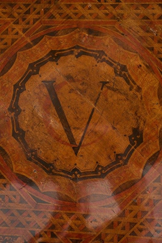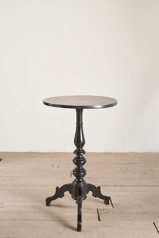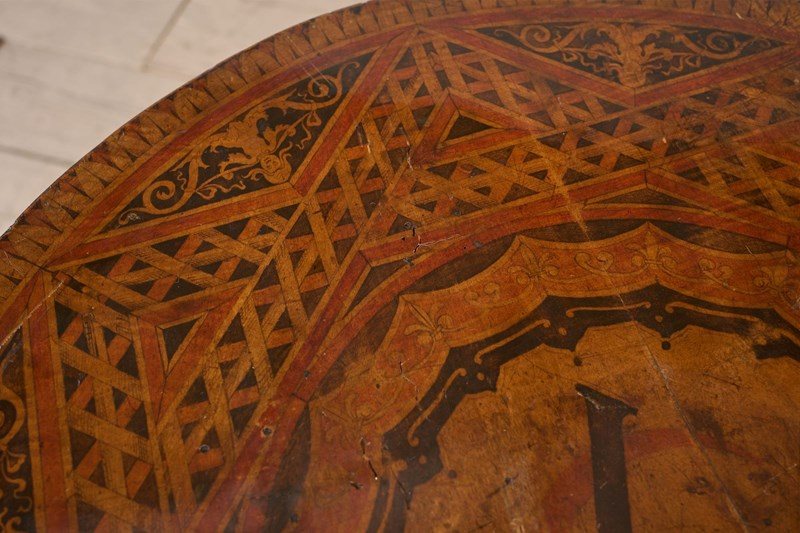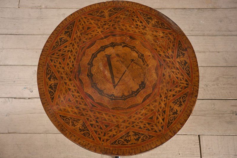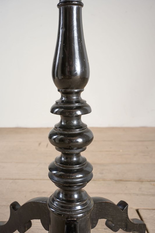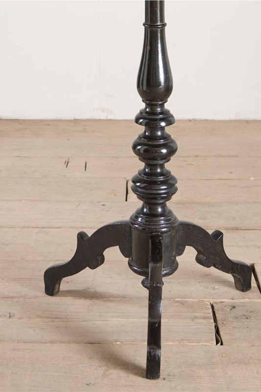This is a very unusual occasional table that is 19th century in age with a striking ebonised turned base and highly decorated top. This gives the feel of masonic furniture and has CV painted into a crest. Overall condition is good with historic repairs to the base but all solid and the top is clear of any significant damage. A very curious piece.