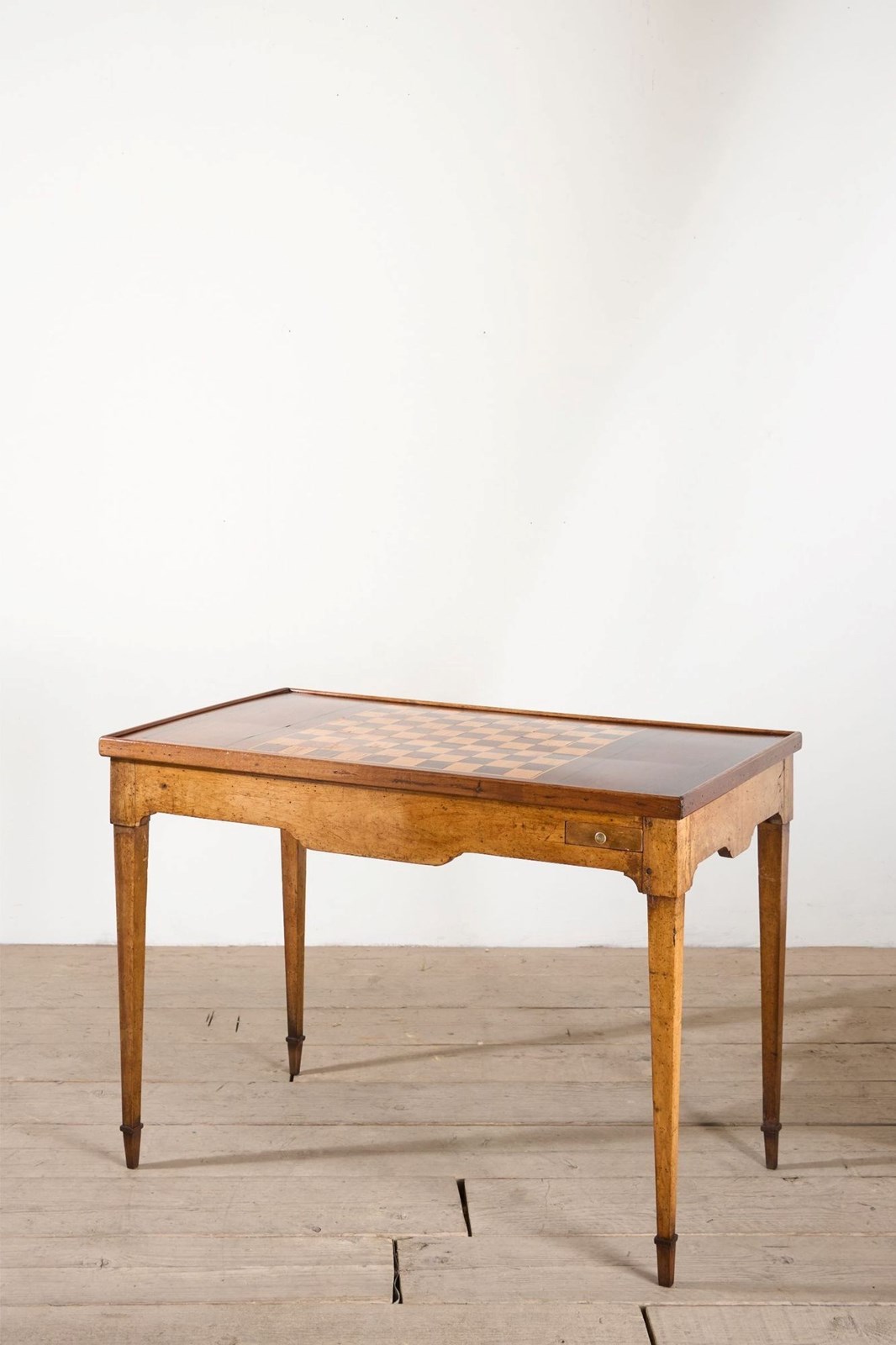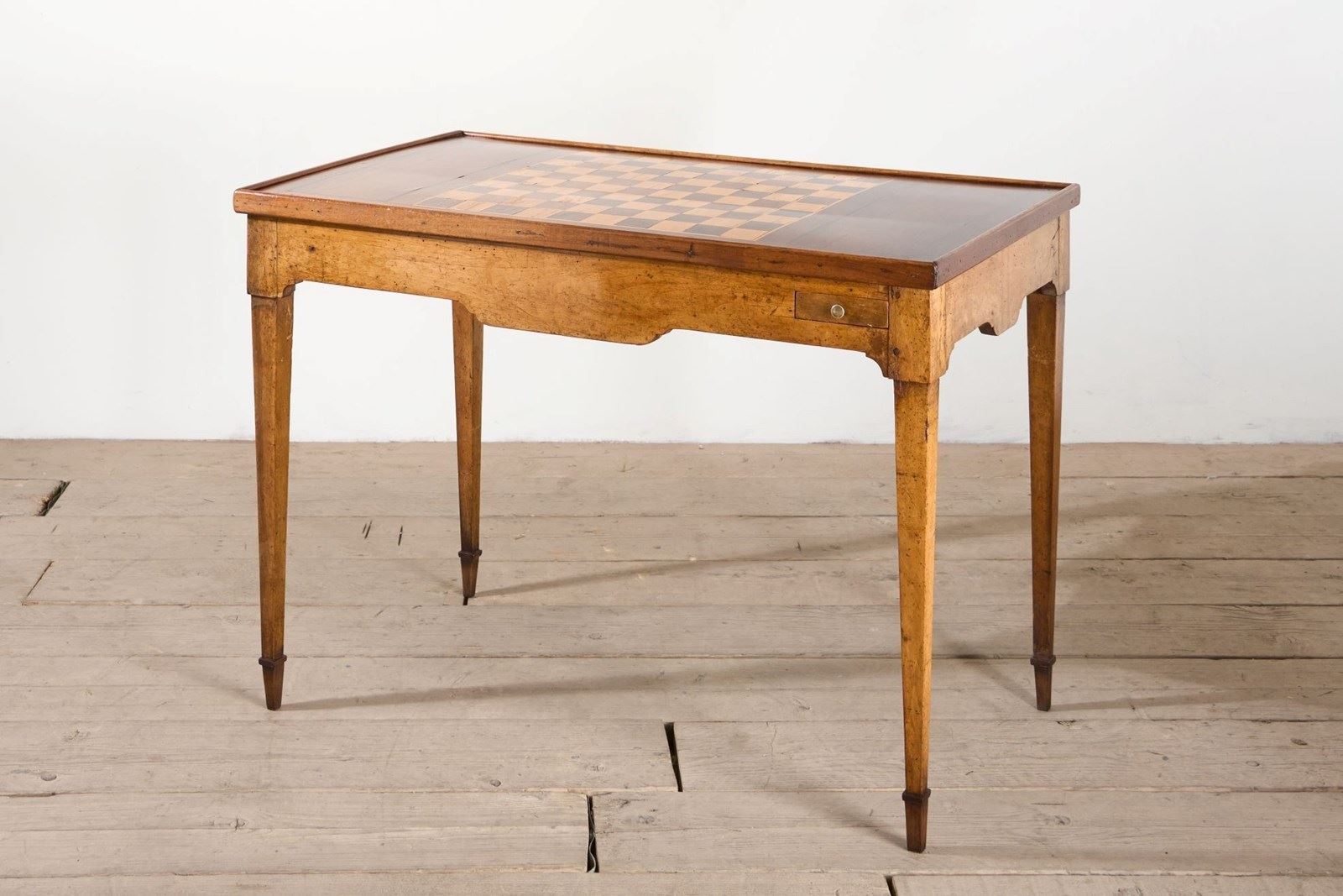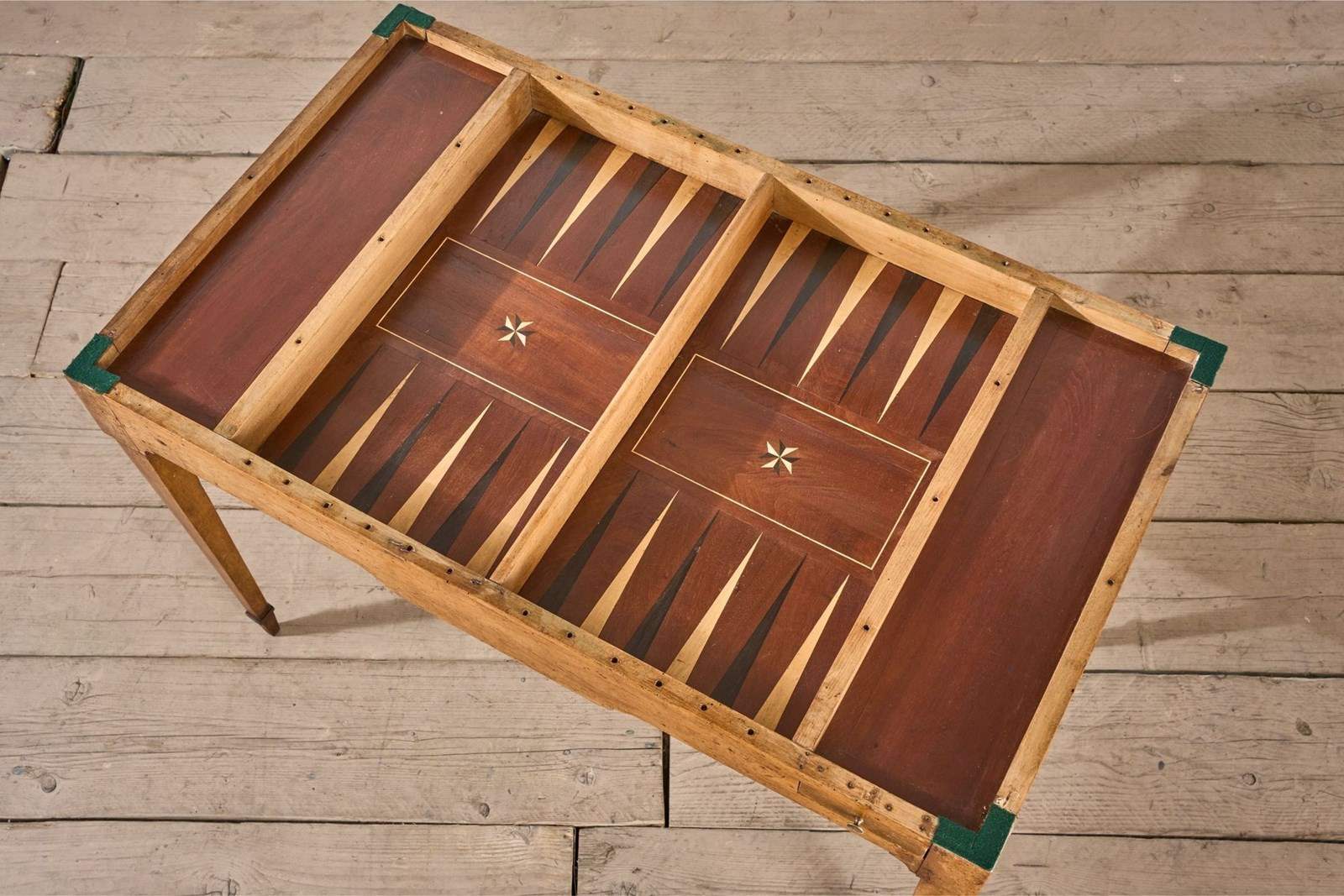 This is a beautiful 19th century French games table complete with 13 white and 13 black games counters, reversible top and full Backgammon table within. Totally original with minor age related marks and patina consistent with age and use. The design of the table is very elegant and the mixture of dark and light woods really show the quality of this piece.