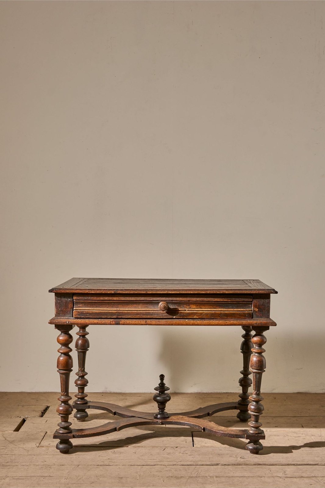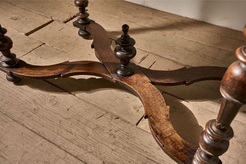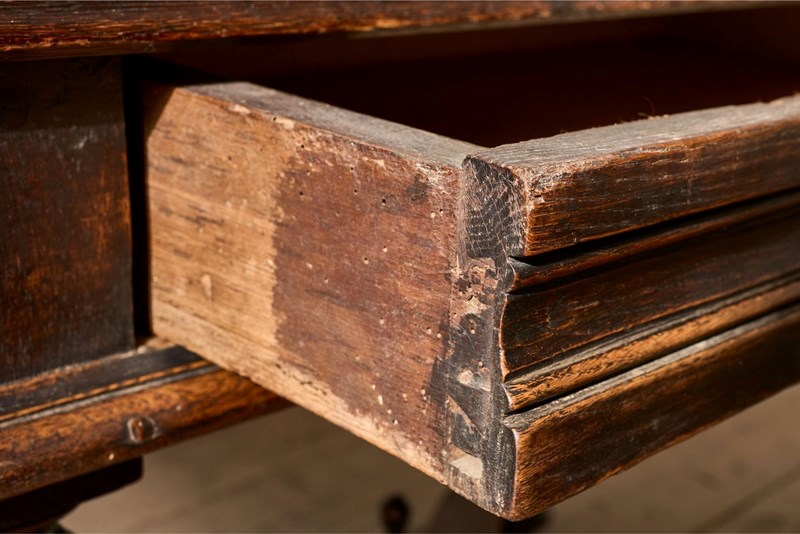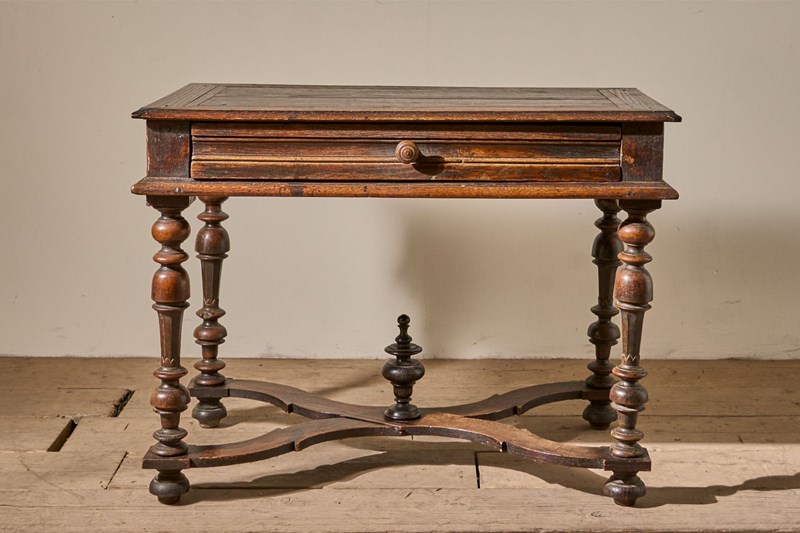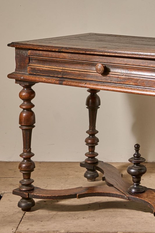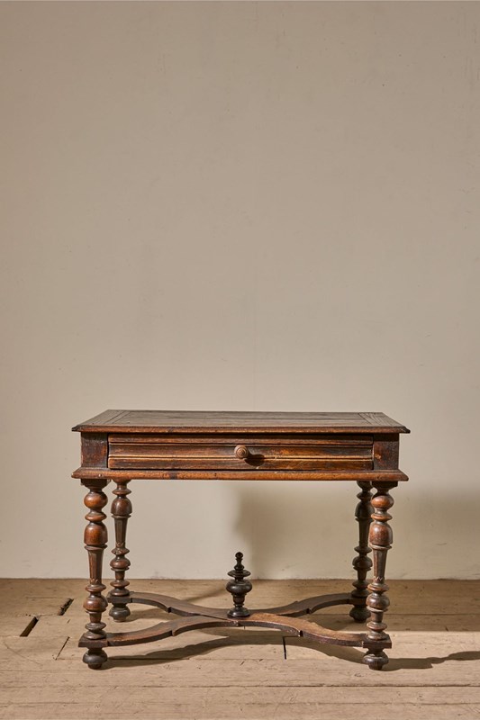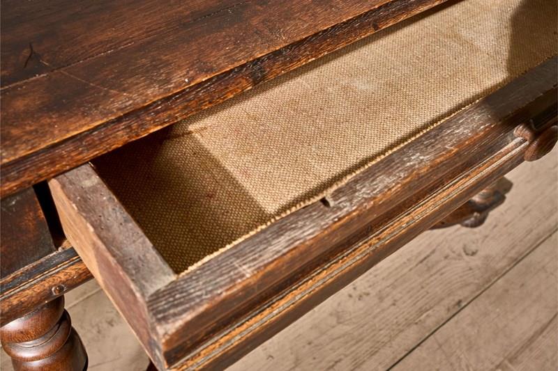 This is a lovely designed 19th century French oak side table. The legs and lower stretchers have a great amount of detail, making this table hugely decorative. The table is complete with a thick oak drawer that runs smoothly and is lined with hessian. The patina and colour are wonderful. Overall condition is good with no structural issues but there is a split in the top. All part of its character but we can let in a timber piece to this should you prefer.